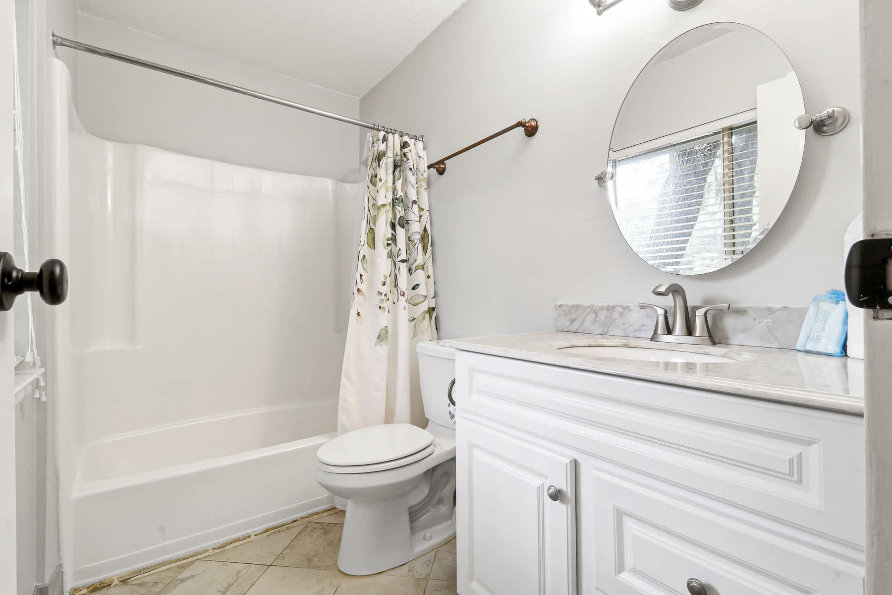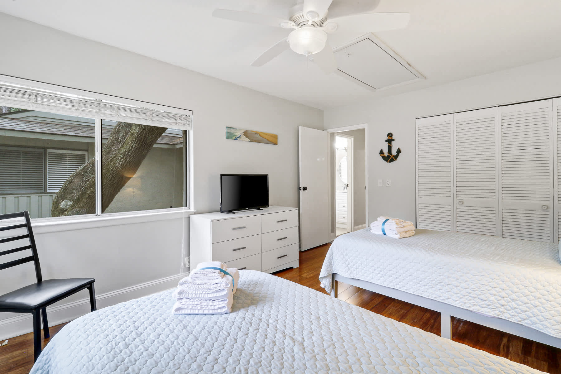Second Bedroom: Two plush twin beds, cable TV, and adjacent full bathroom with tub/shower combo.