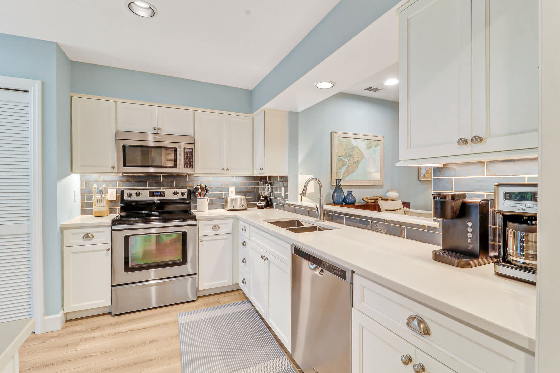 Chef’s Kitchen: Stainless steel appliances, dining nook, cookware, dishware, Keurig, and standard drip coffee maker.