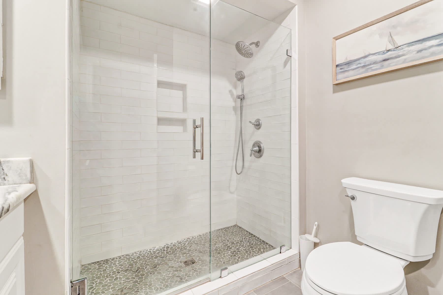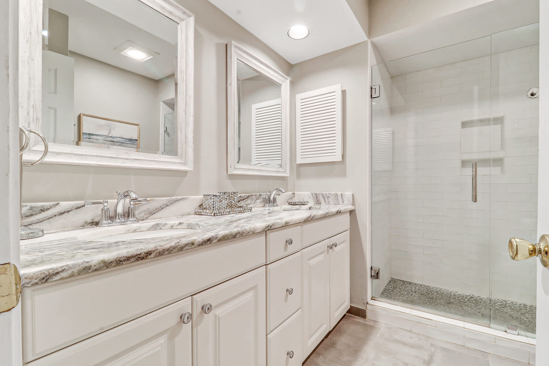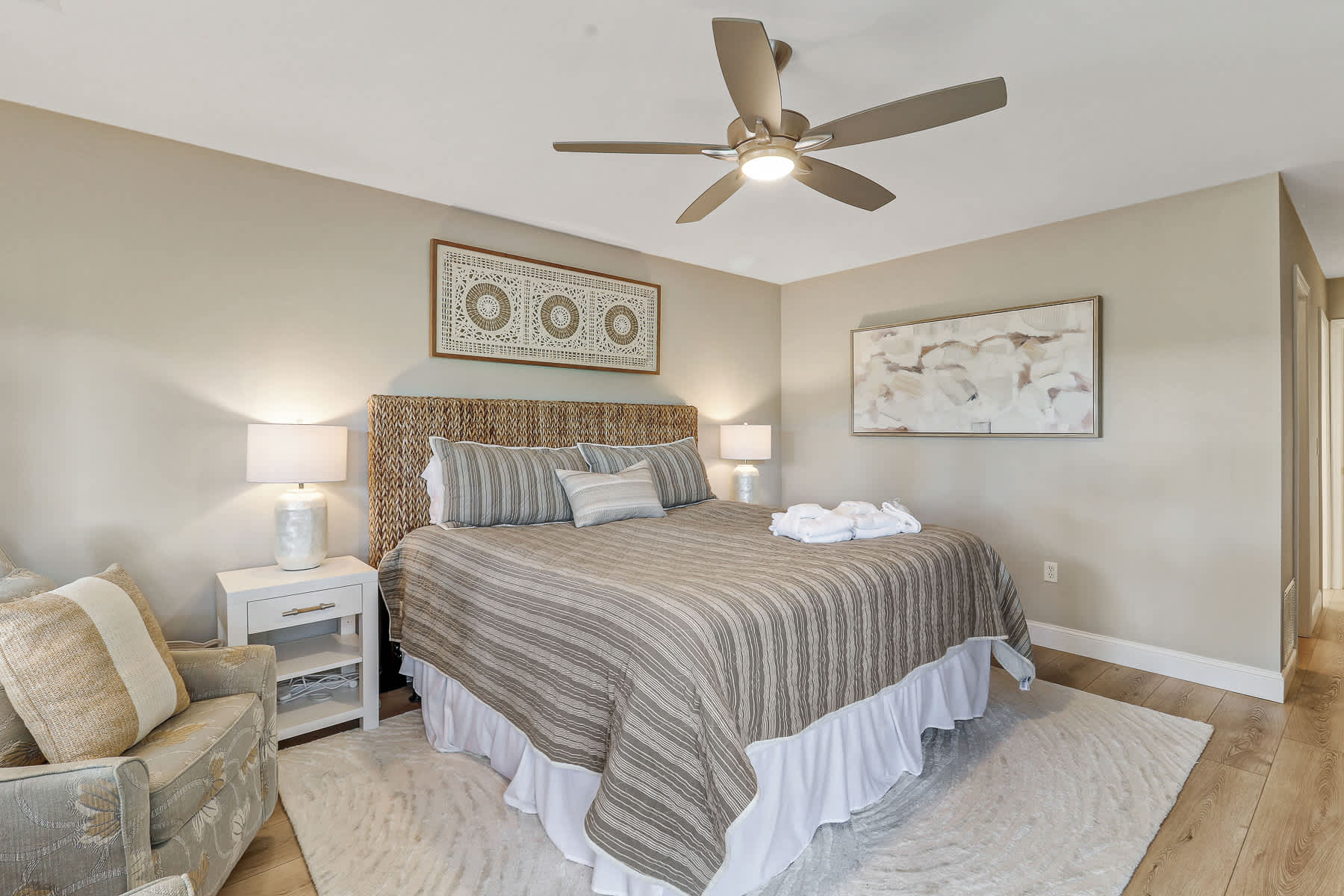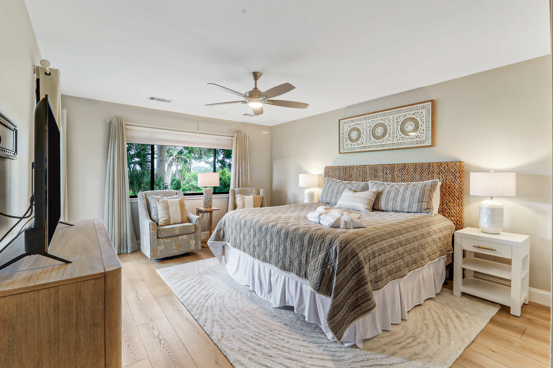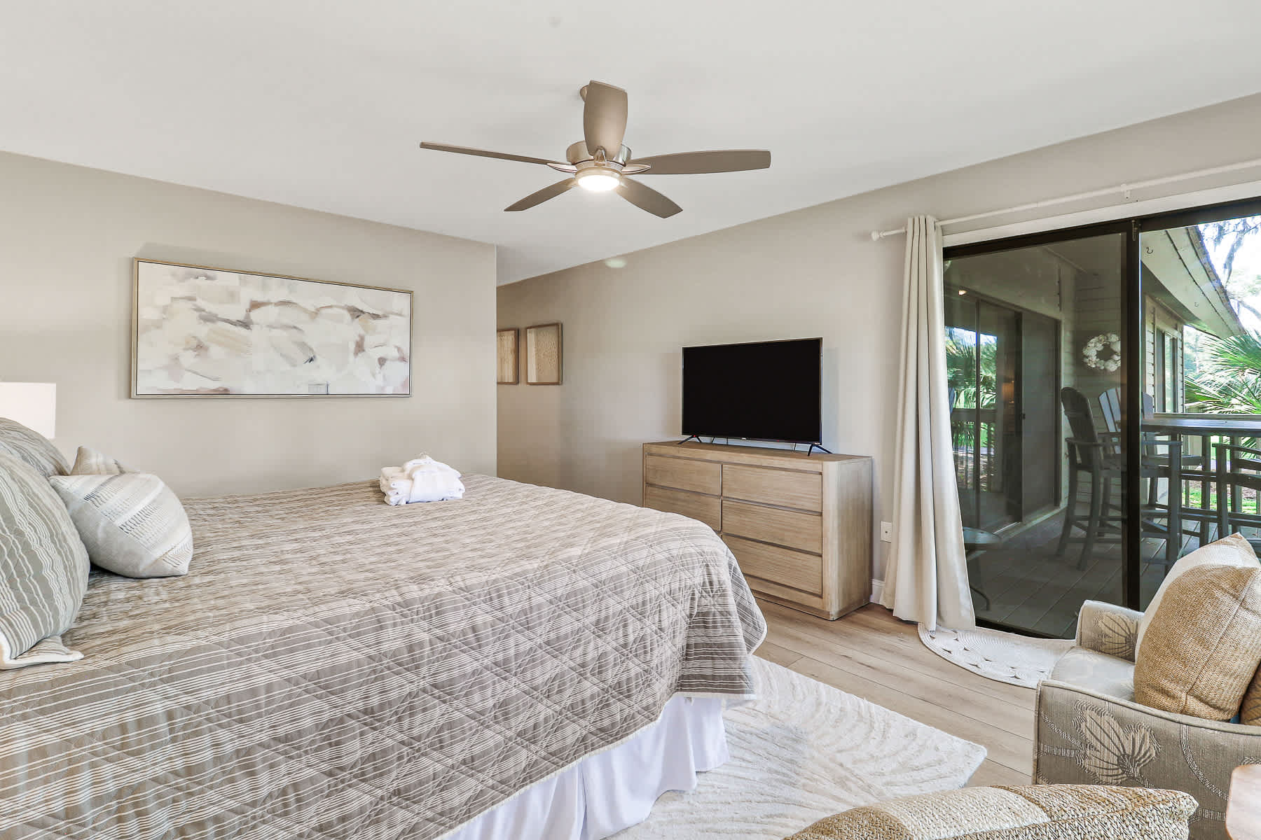 Primary Suite: King-sized bed, walk-out access to the private deck, large walk-in closet, Smart TV, and a newly renovated bathroom with a walk-in shower and double vanity.