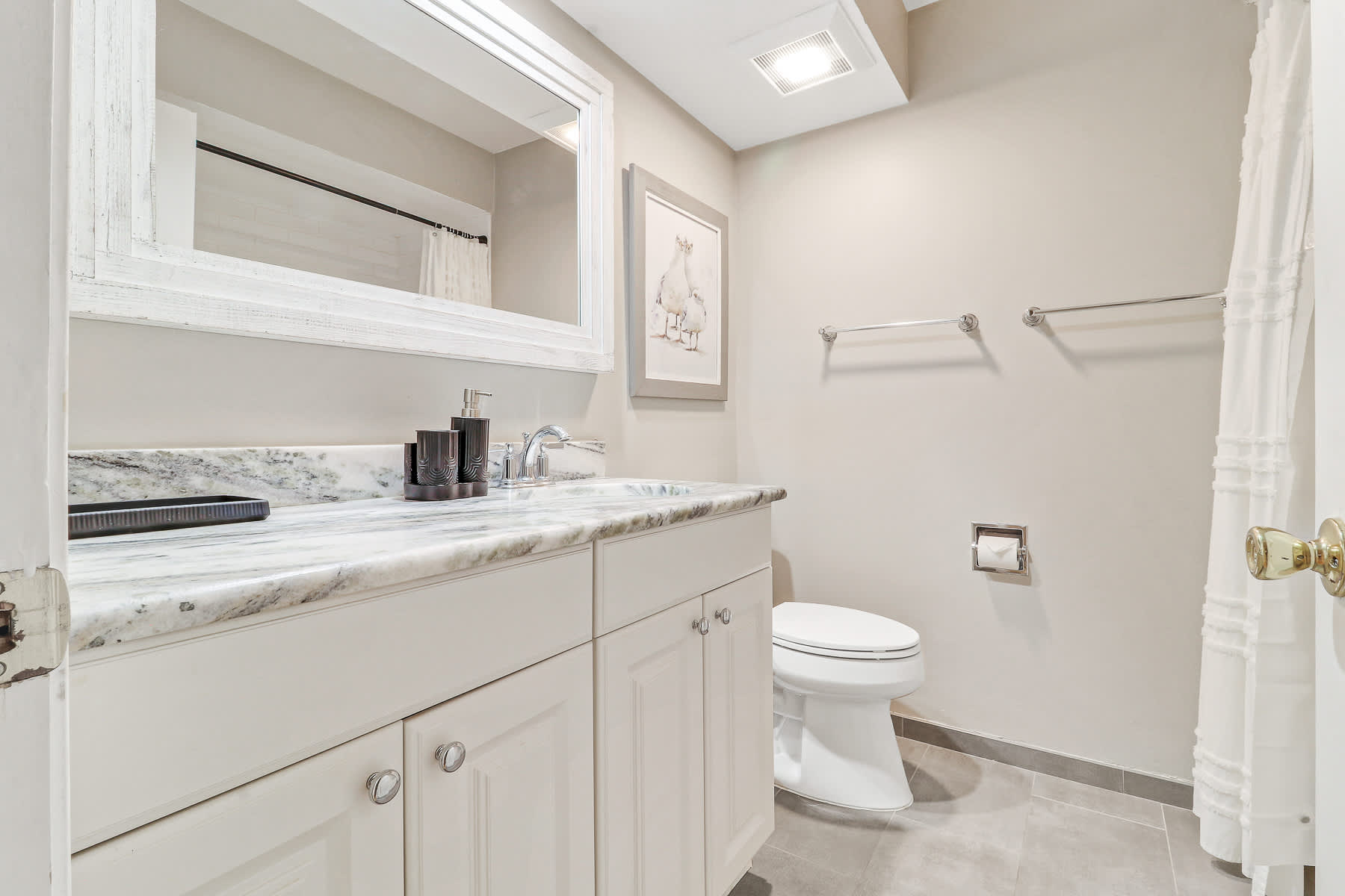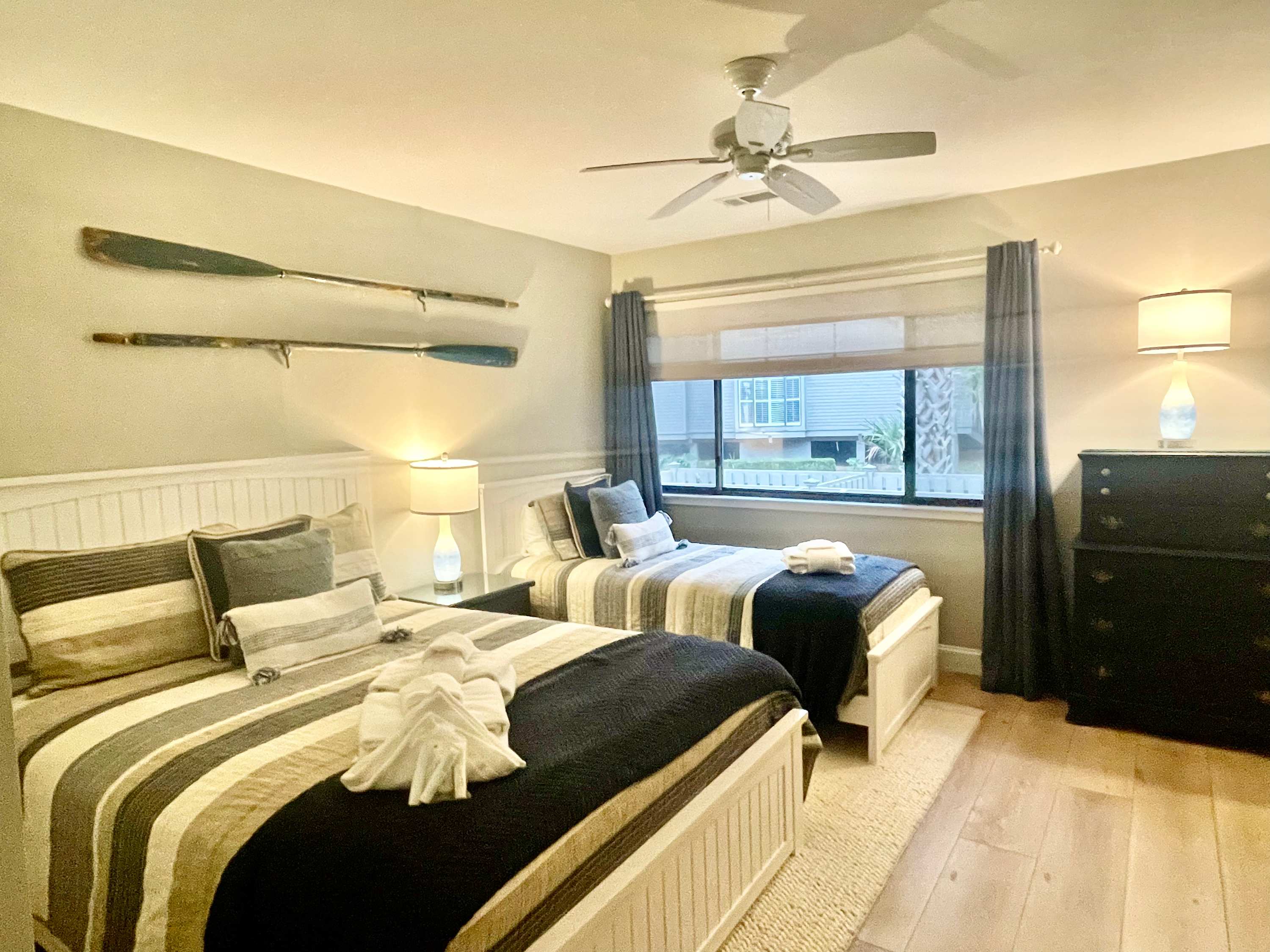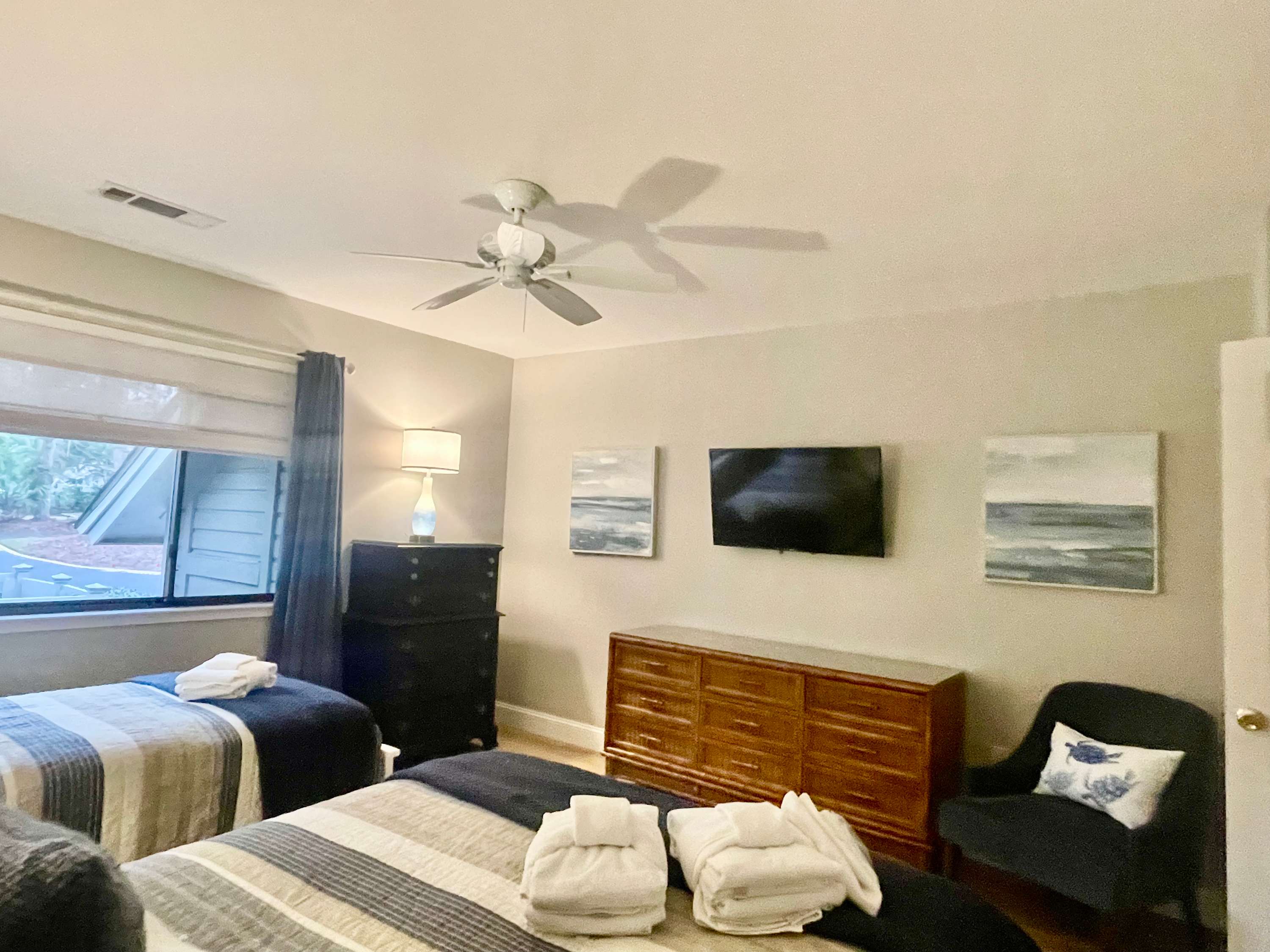 Guest Bedroom: Queen-sized bed and twin XL bed, full closet, dresser, Smart TV, and adjacent full bath with shower/tub combo.