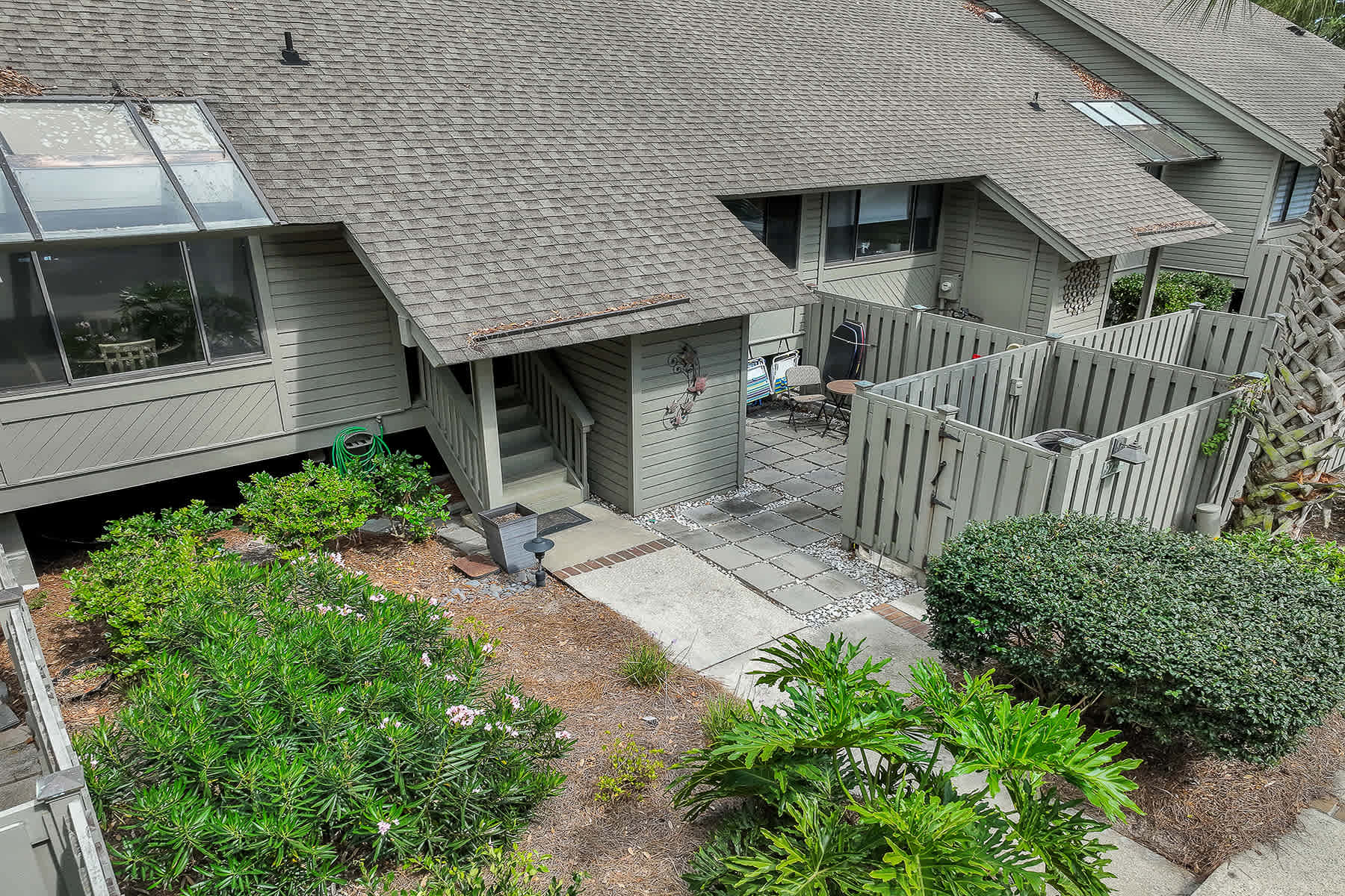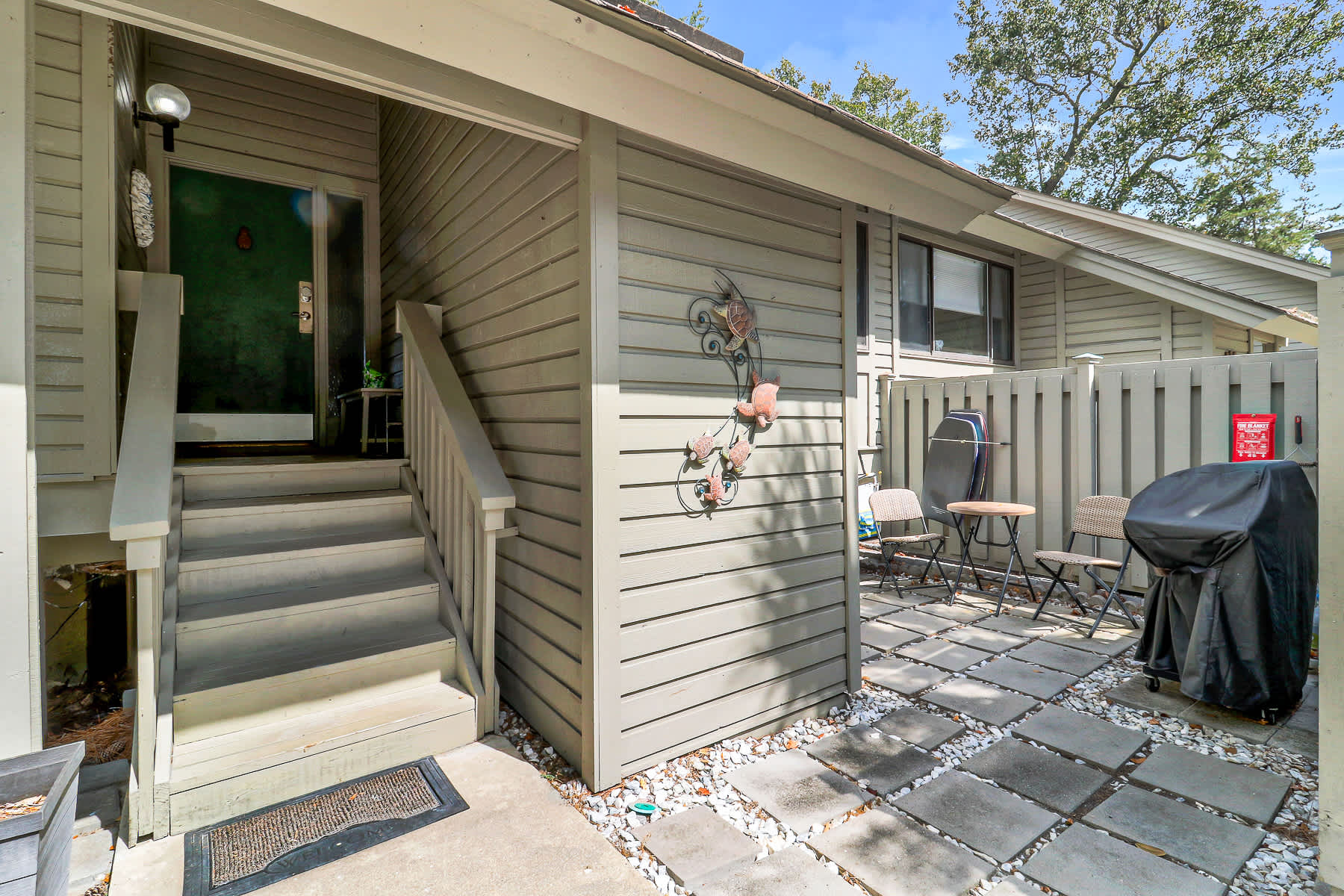 Front Courtyard: Includes a beach wagon and chairs for guest use.