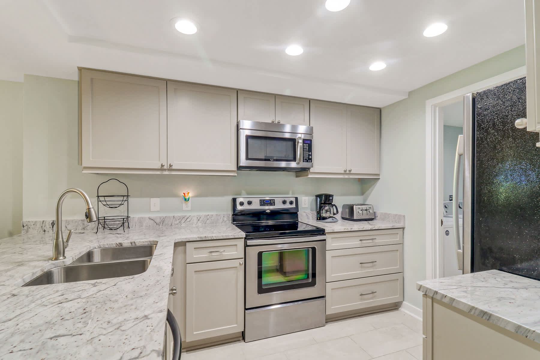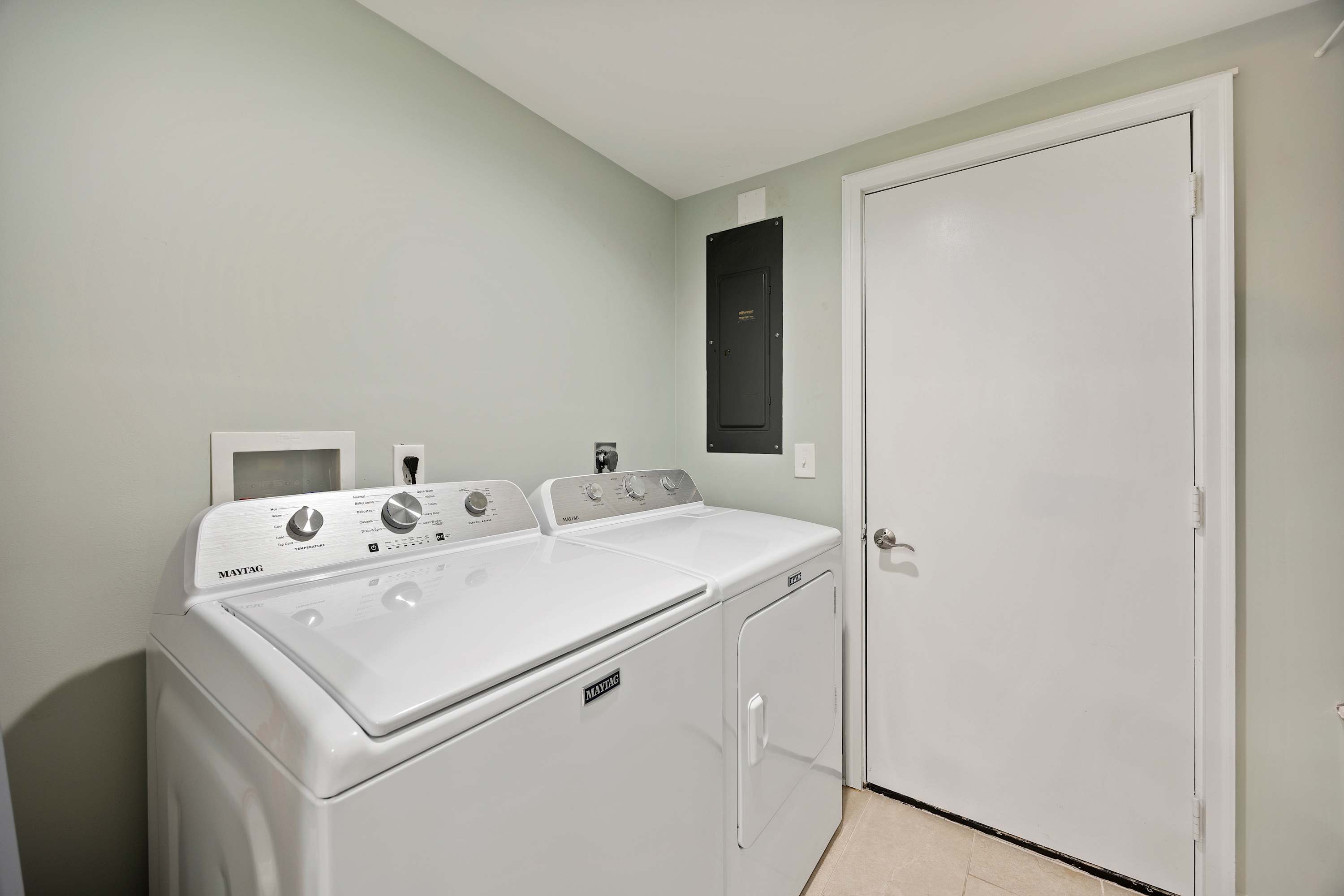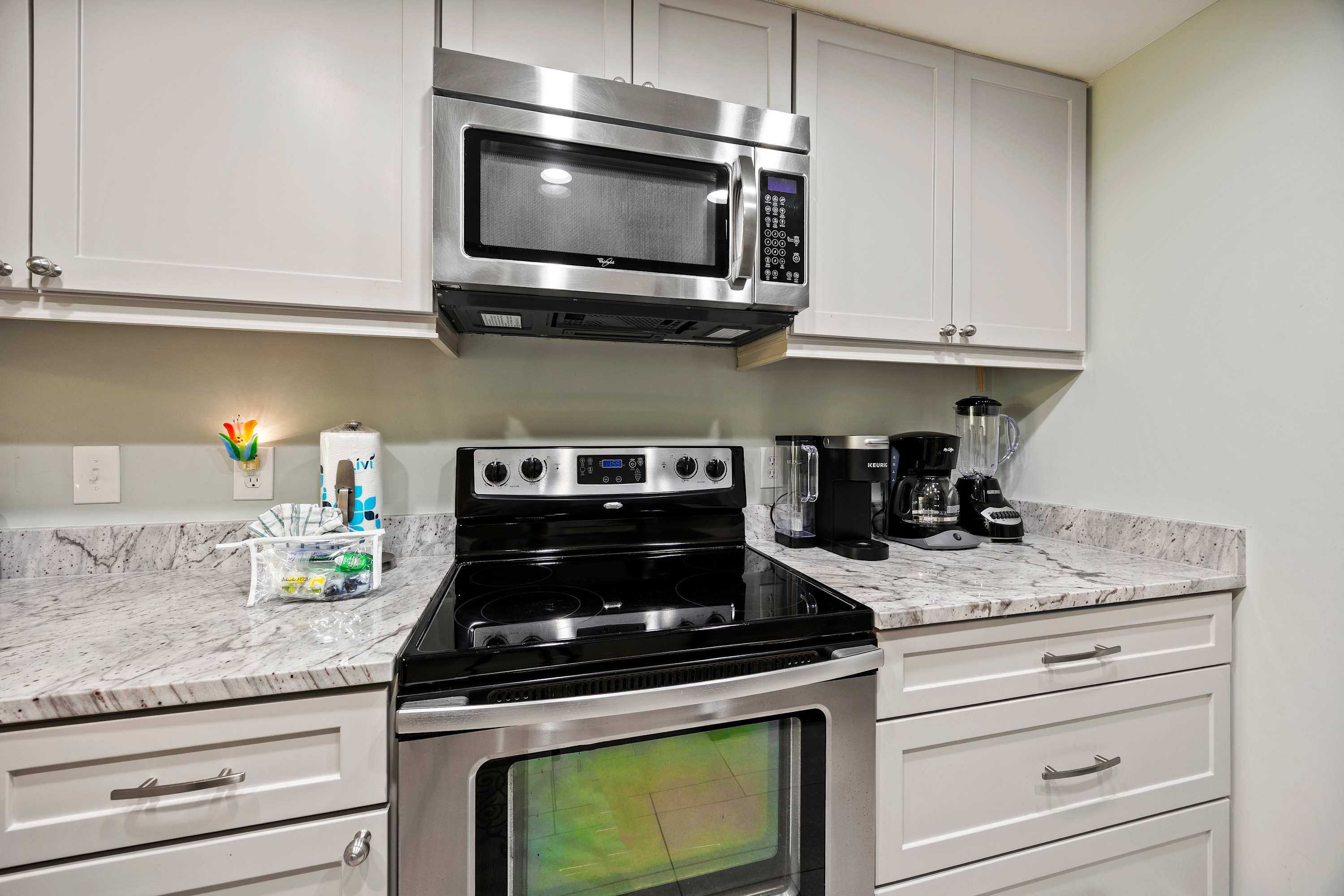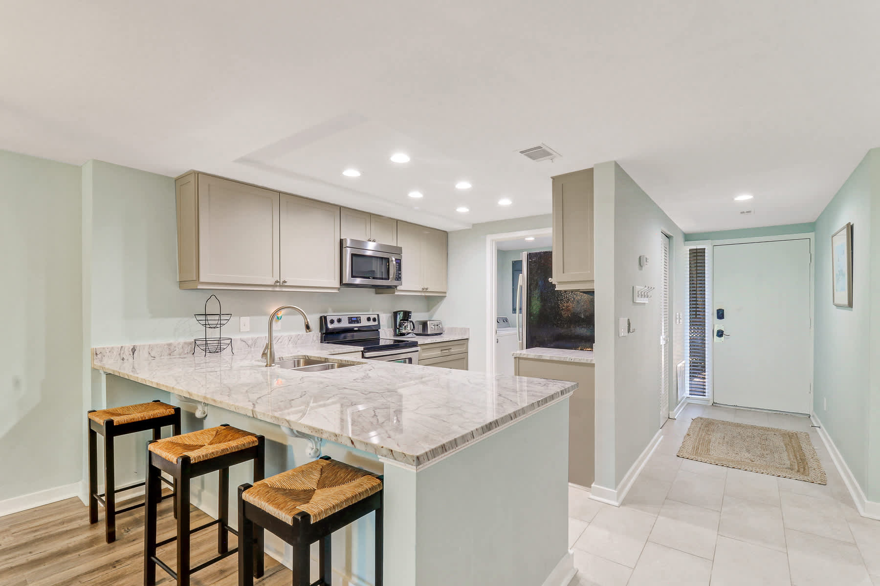 Fully Equipped Kitchen: Everything you need, including full-sized appliances, a traditional coffee maker, blender, and cooking utensils. Conveniently located with washer and dryer with ironing essentials in the utility closet.