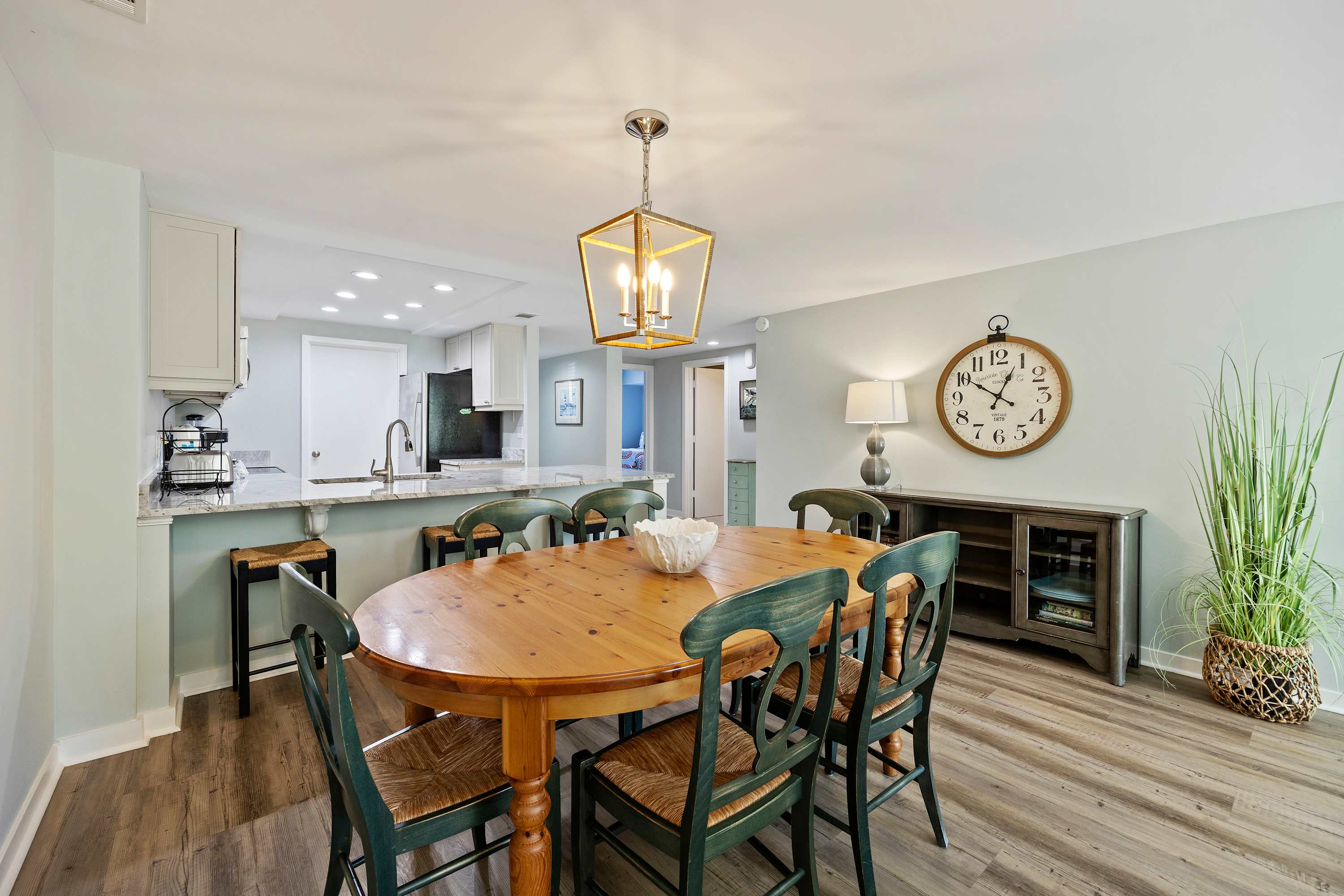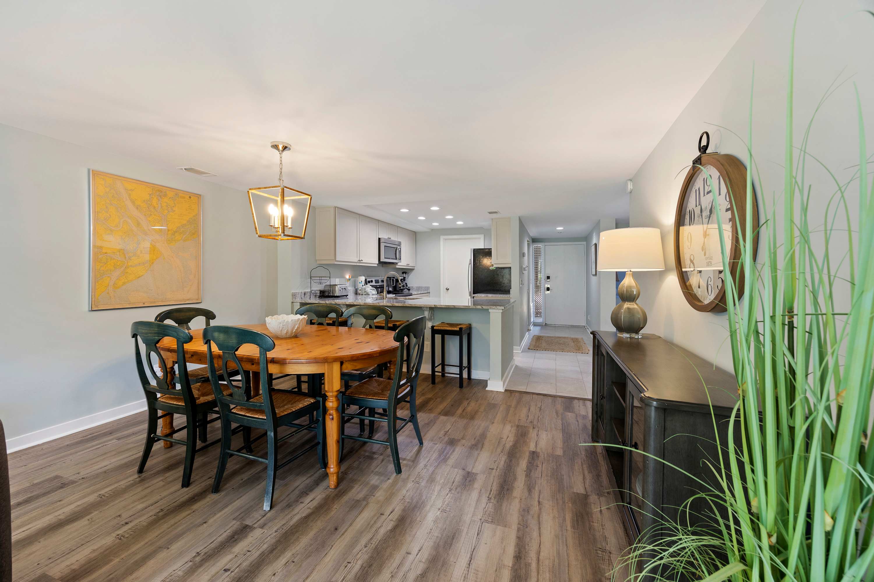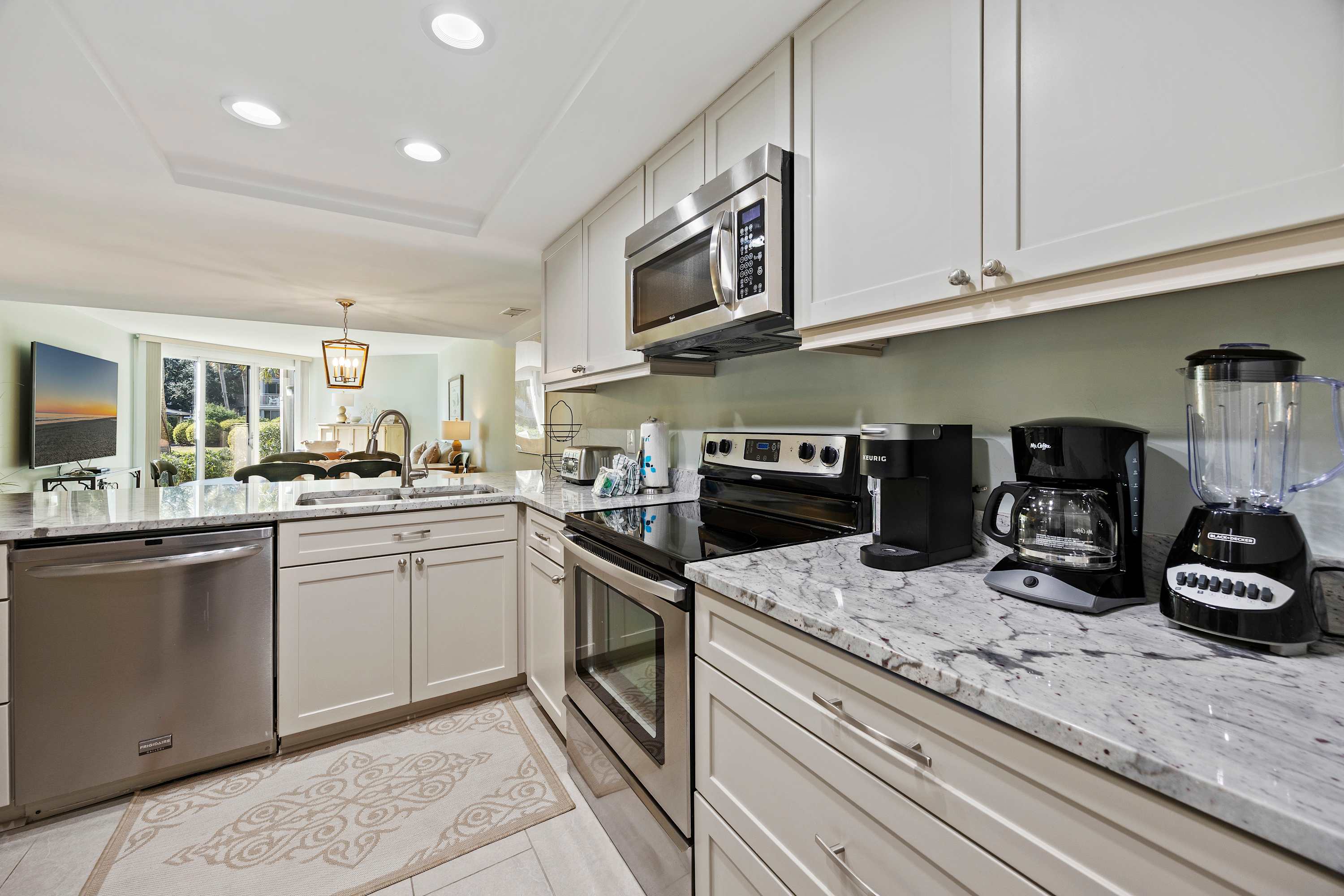 Fully Equipped Kitchen: Everything you need, including full-sized appliances, a traditional coffee maker, blender, and cooking utensils. Conveniently located with washer and dryer with ironing essentials in the utility closet.