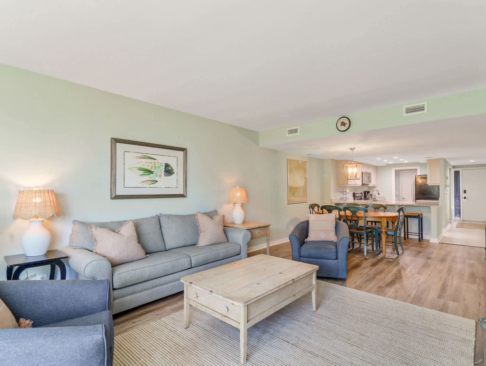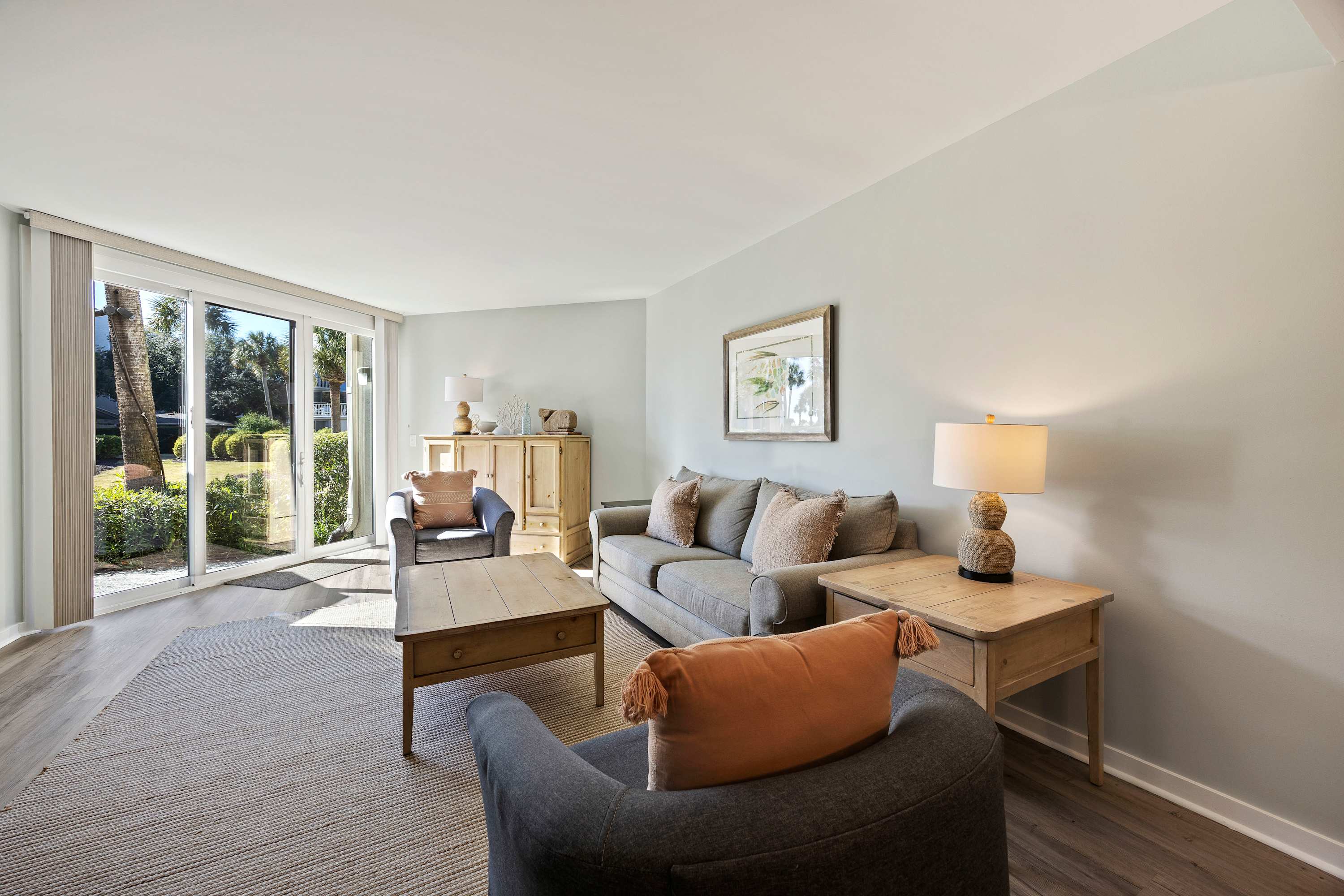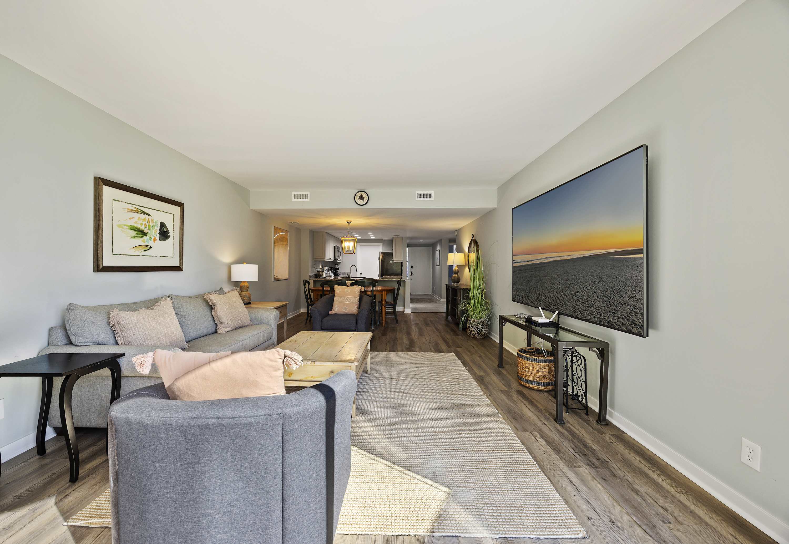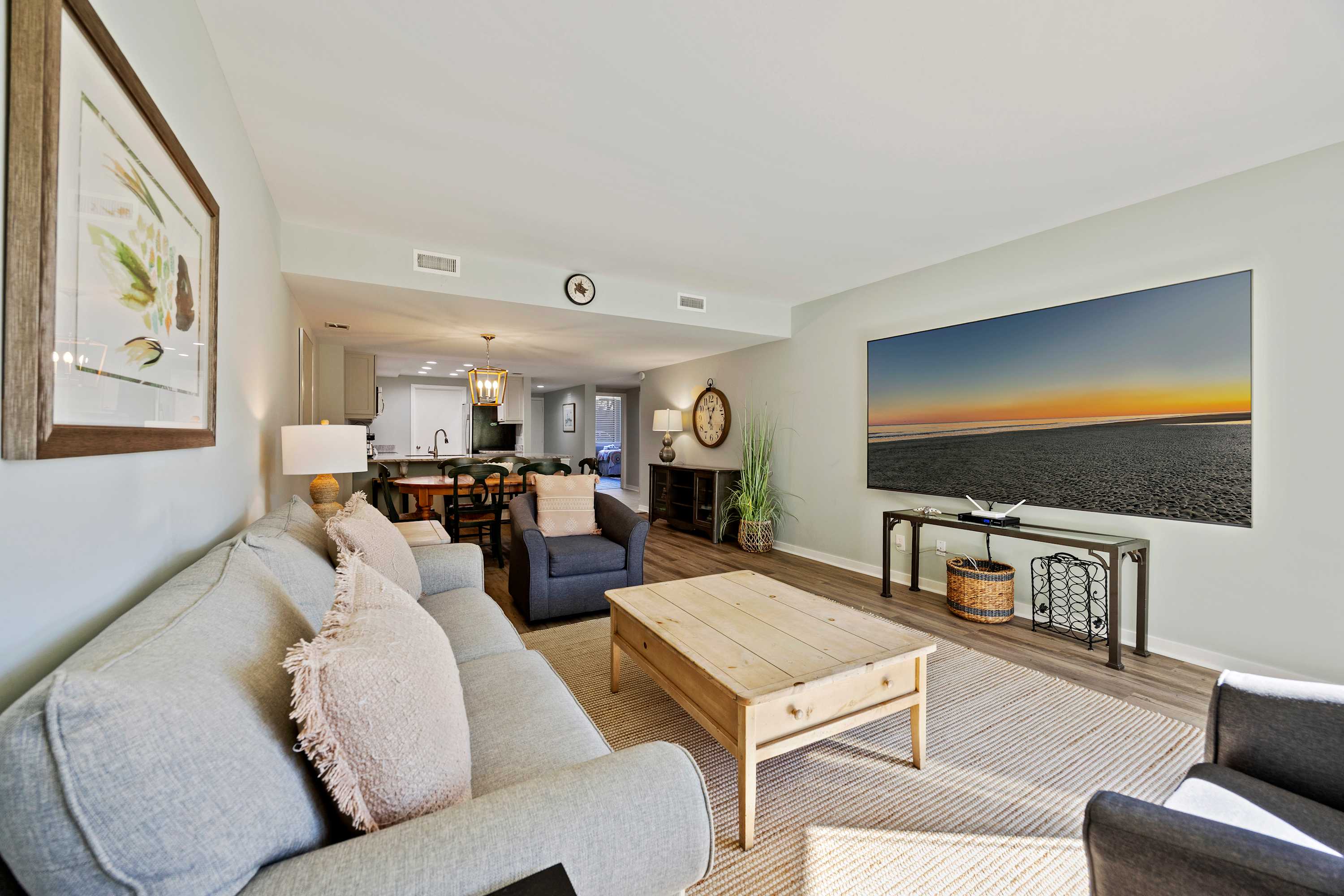 Open-Concept Living Area: Comfortable sleeper sofa, stylish chairs, accent tables, Smart TV with Spectrum cable.