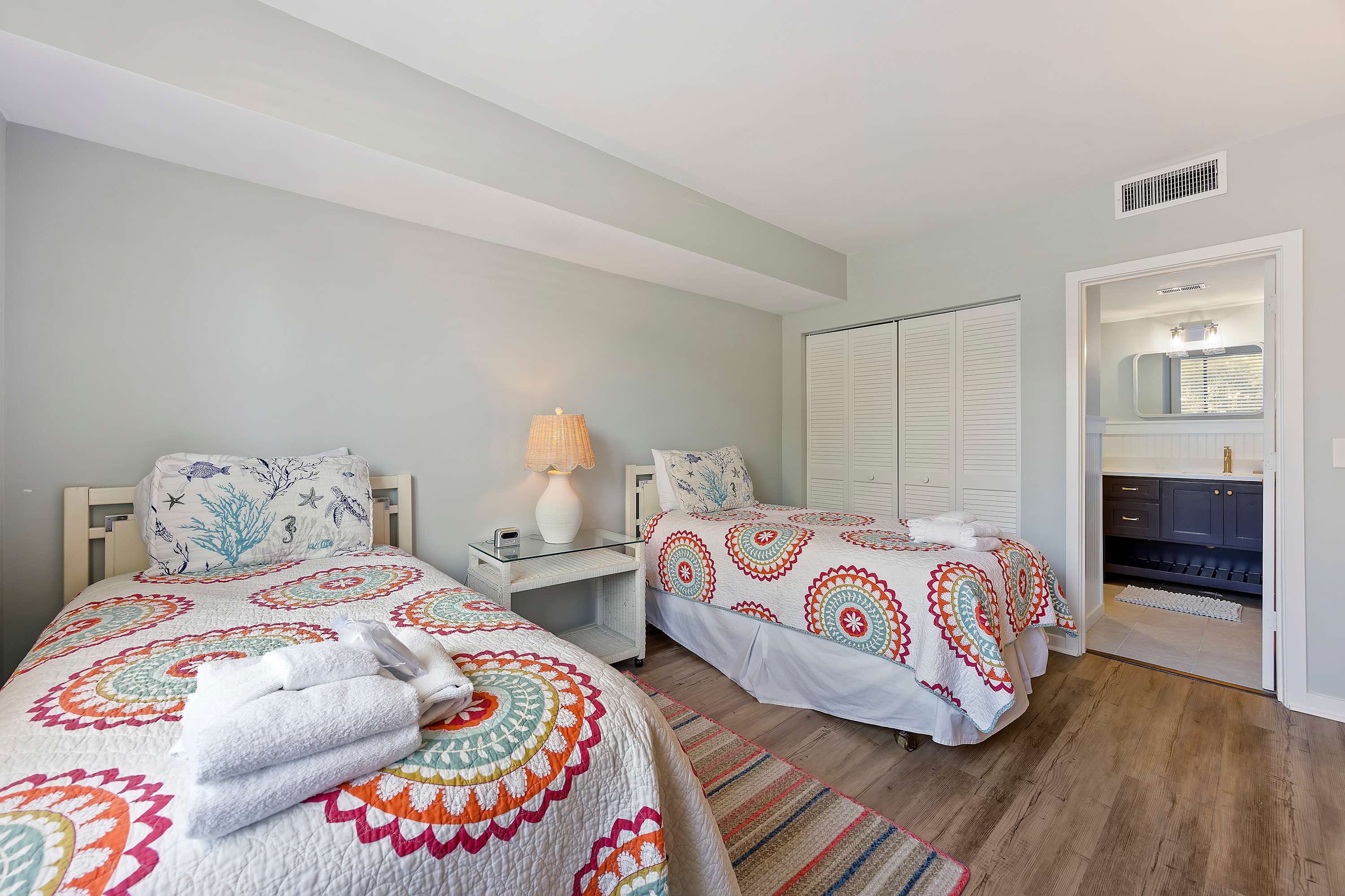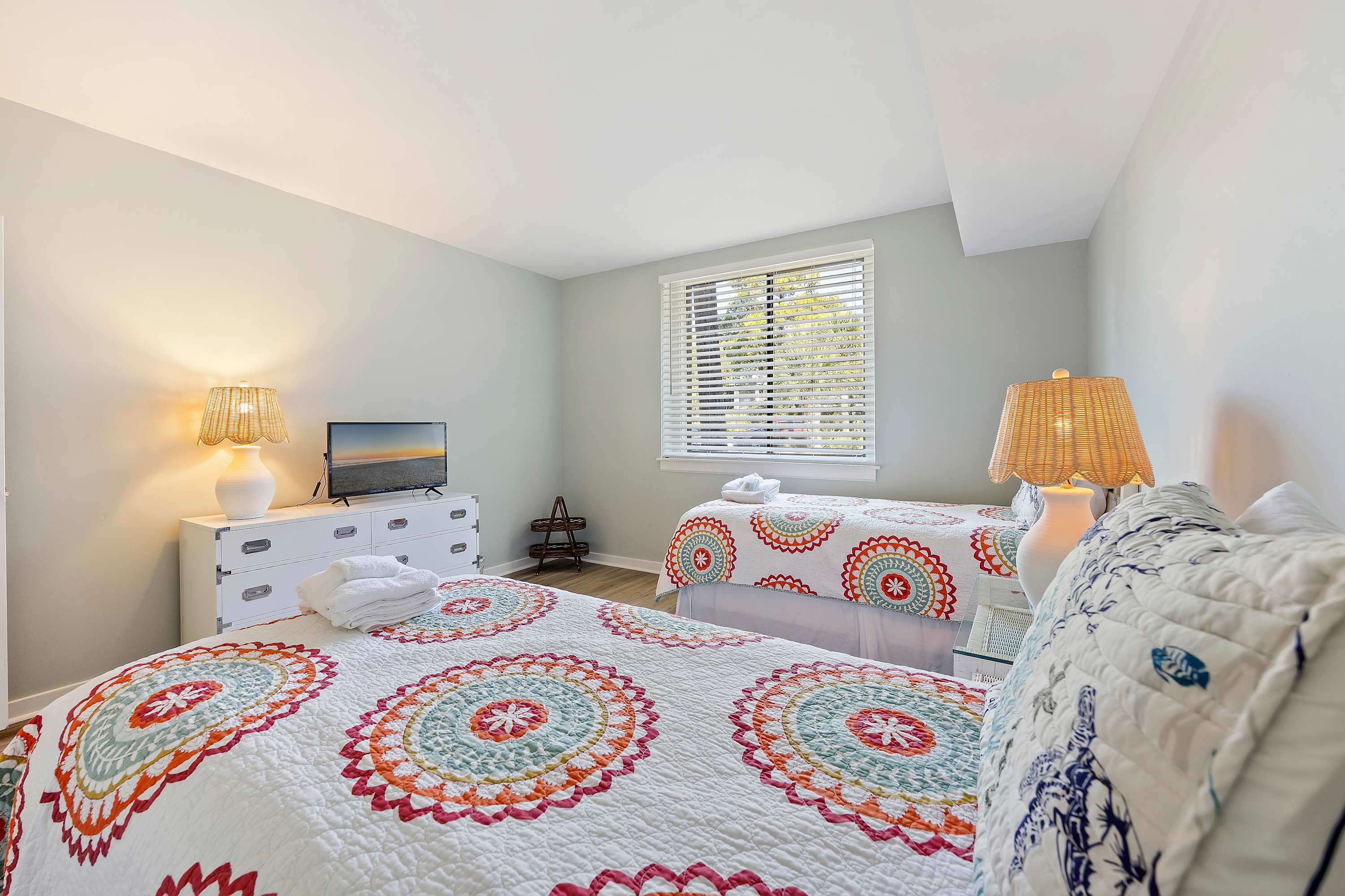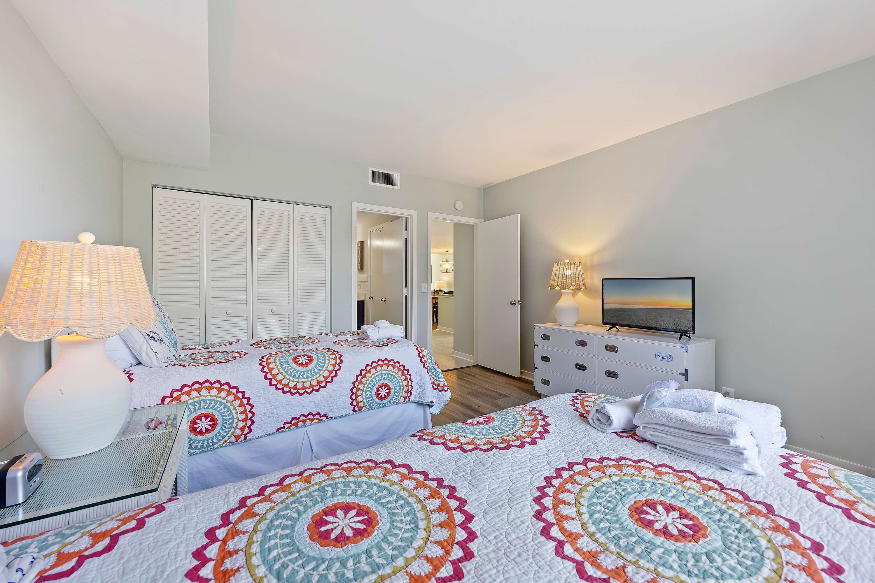 Second Bedroom: Two Twin-sized beds, Smart TV with cable, and ample storage with ensuite bathroom. Bedding, linens, and towels provided for our guests.