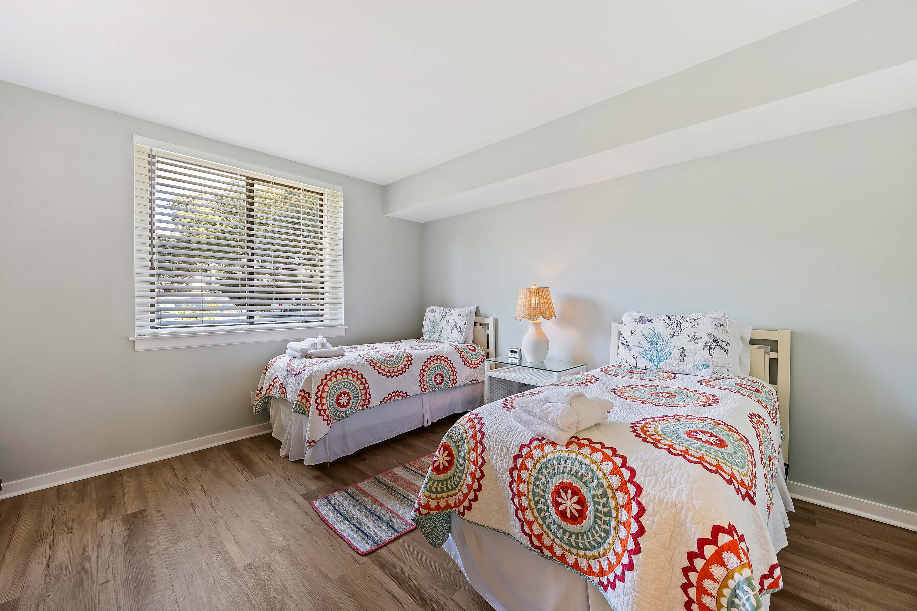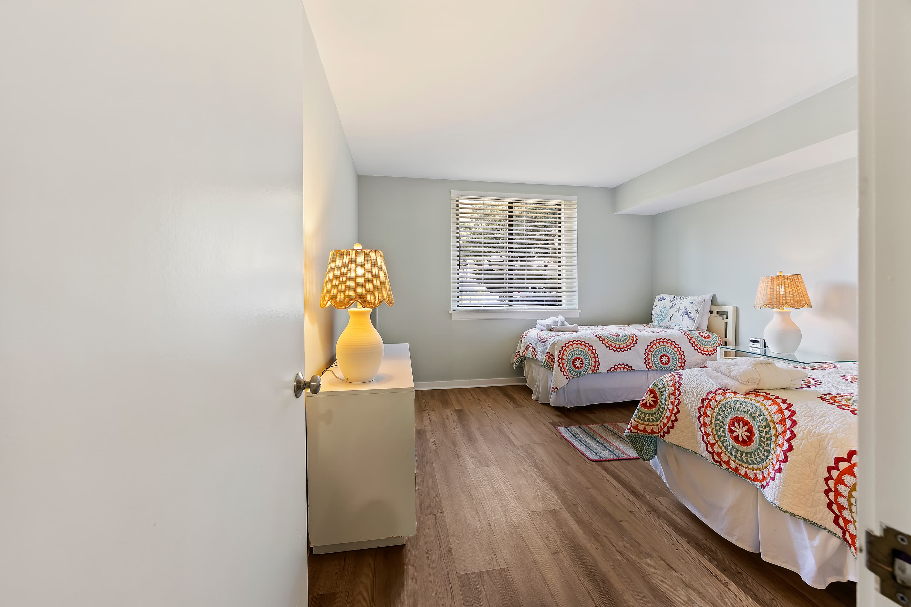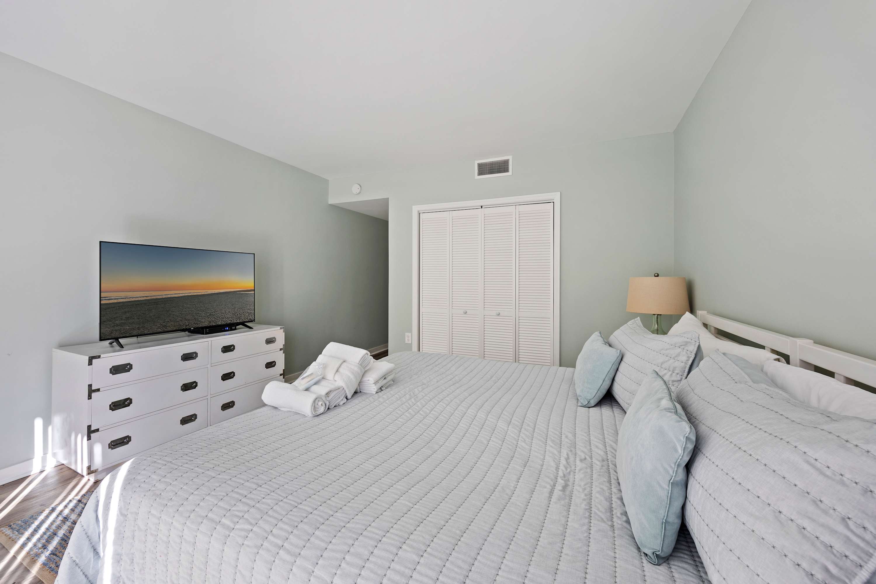 Second Bedroom: Two Twin-sized beds, Smart TV with cable, and ample storage with ensuite bathroom. Bedding, linens, and towels provided for our guests.