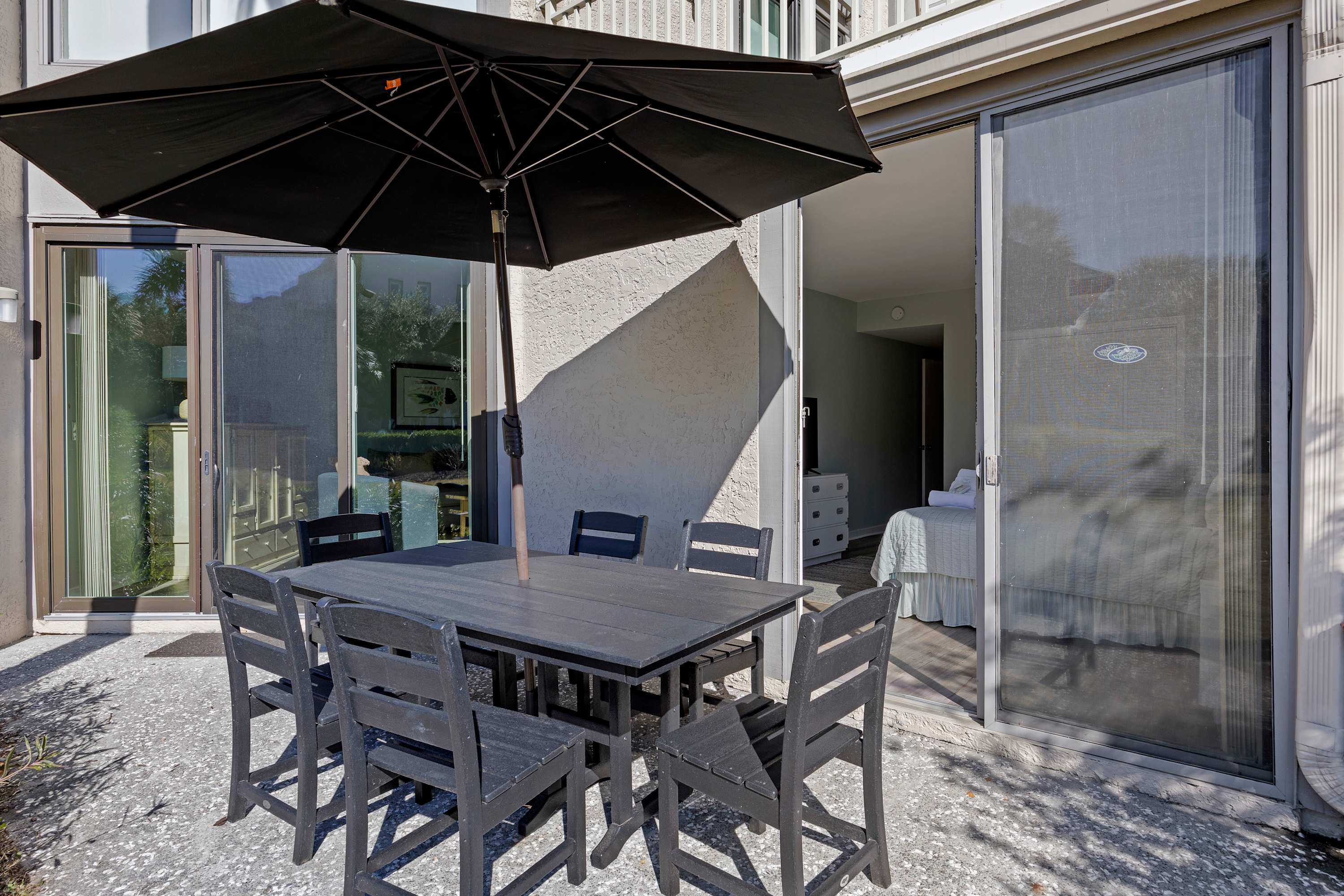 Outdoor Patio: Perfect for al fresco dining, morning coffee, or cocktails, with seating and stunning views of the pool. Accessible from living room or Primary bedroom.