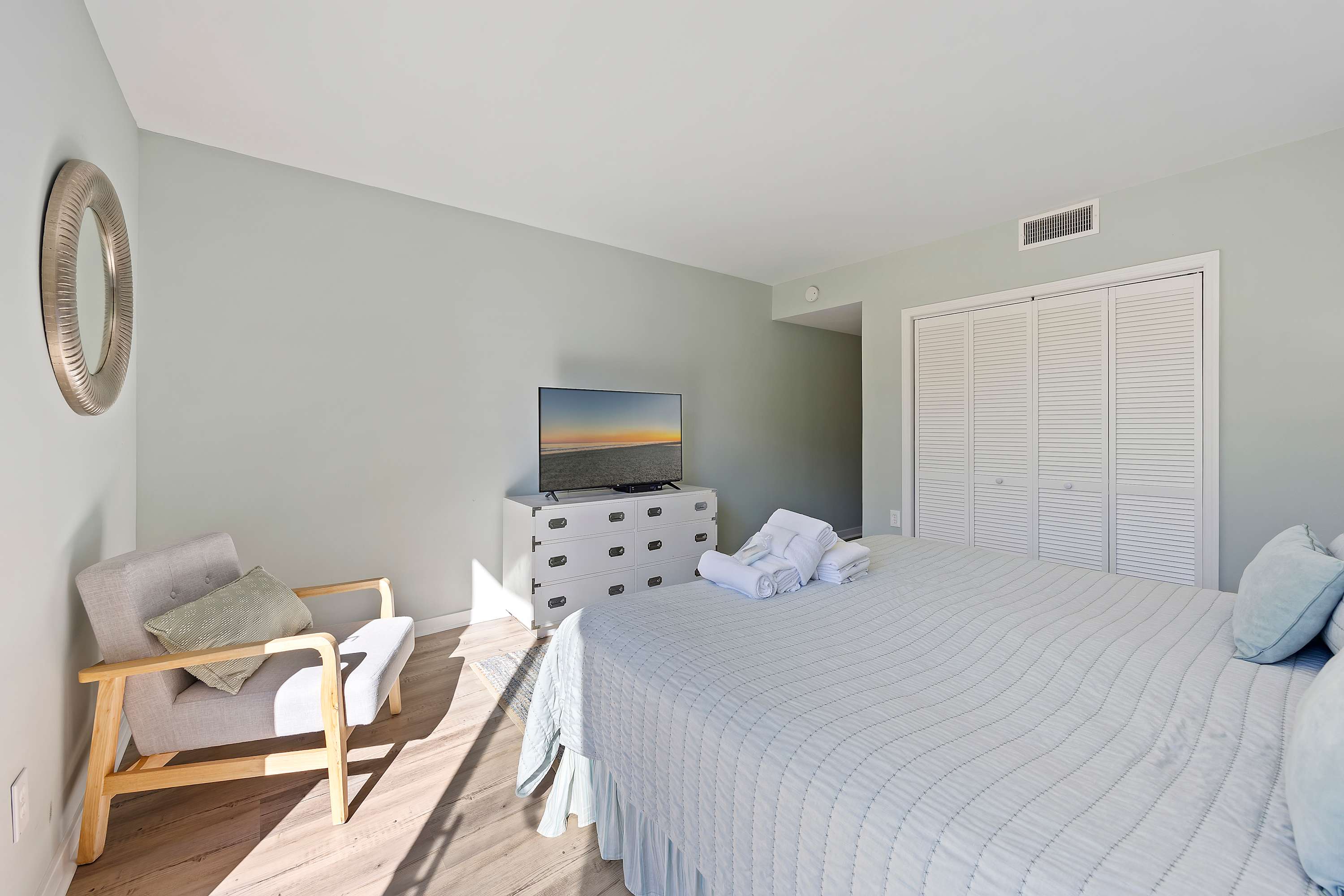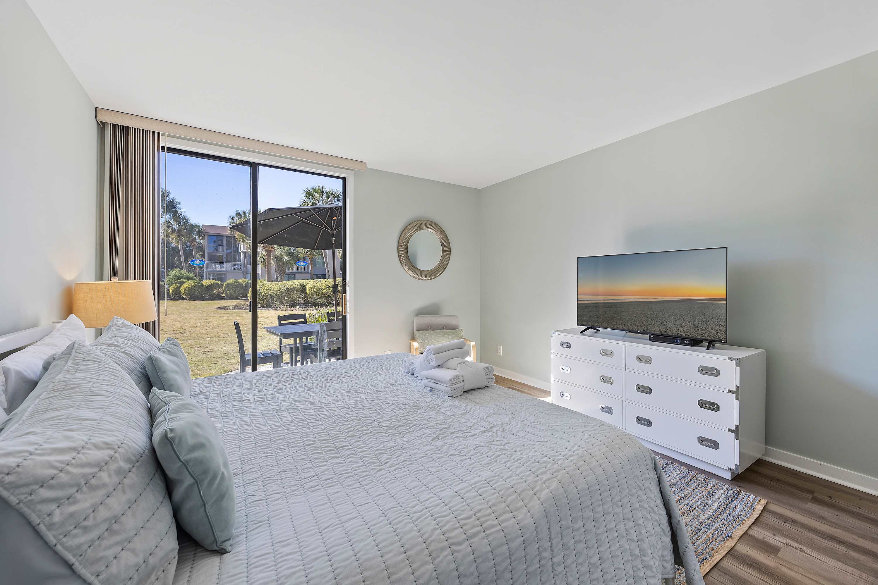 Spacious Master Suite: King-sized bed, Smart TV, ensuite bath with walk in shower, cable TV, and walk-out patio access, and picturesque views of the community.