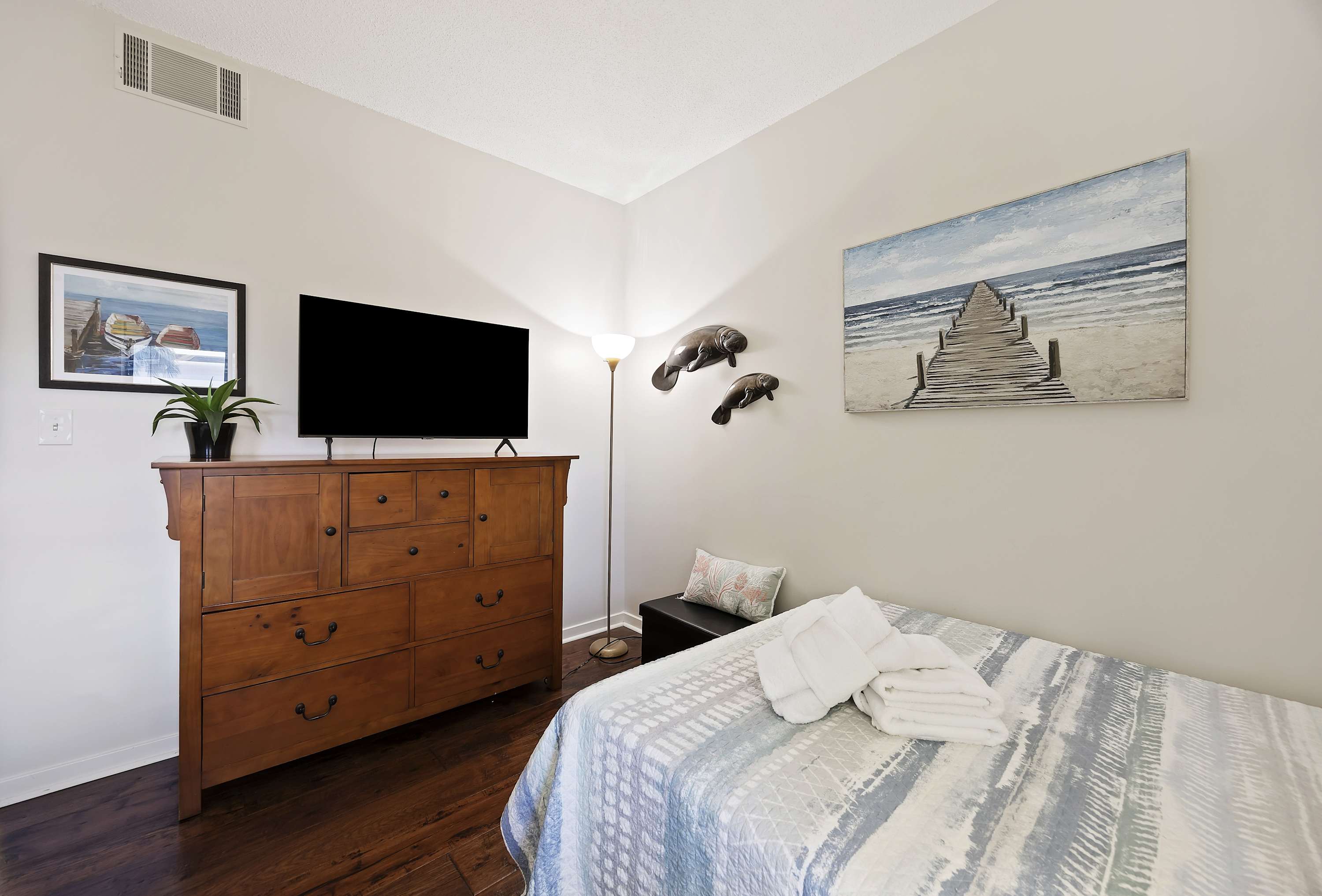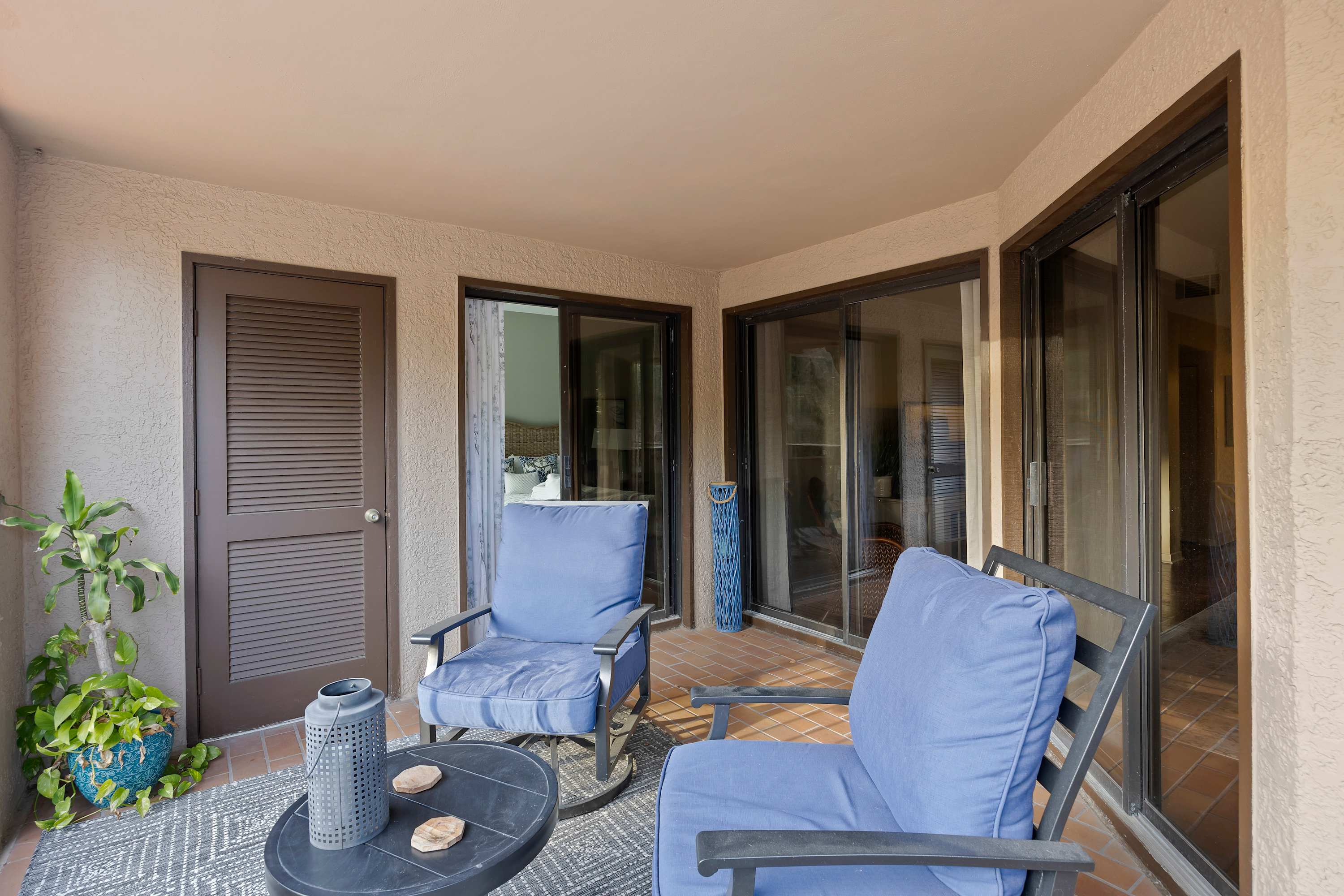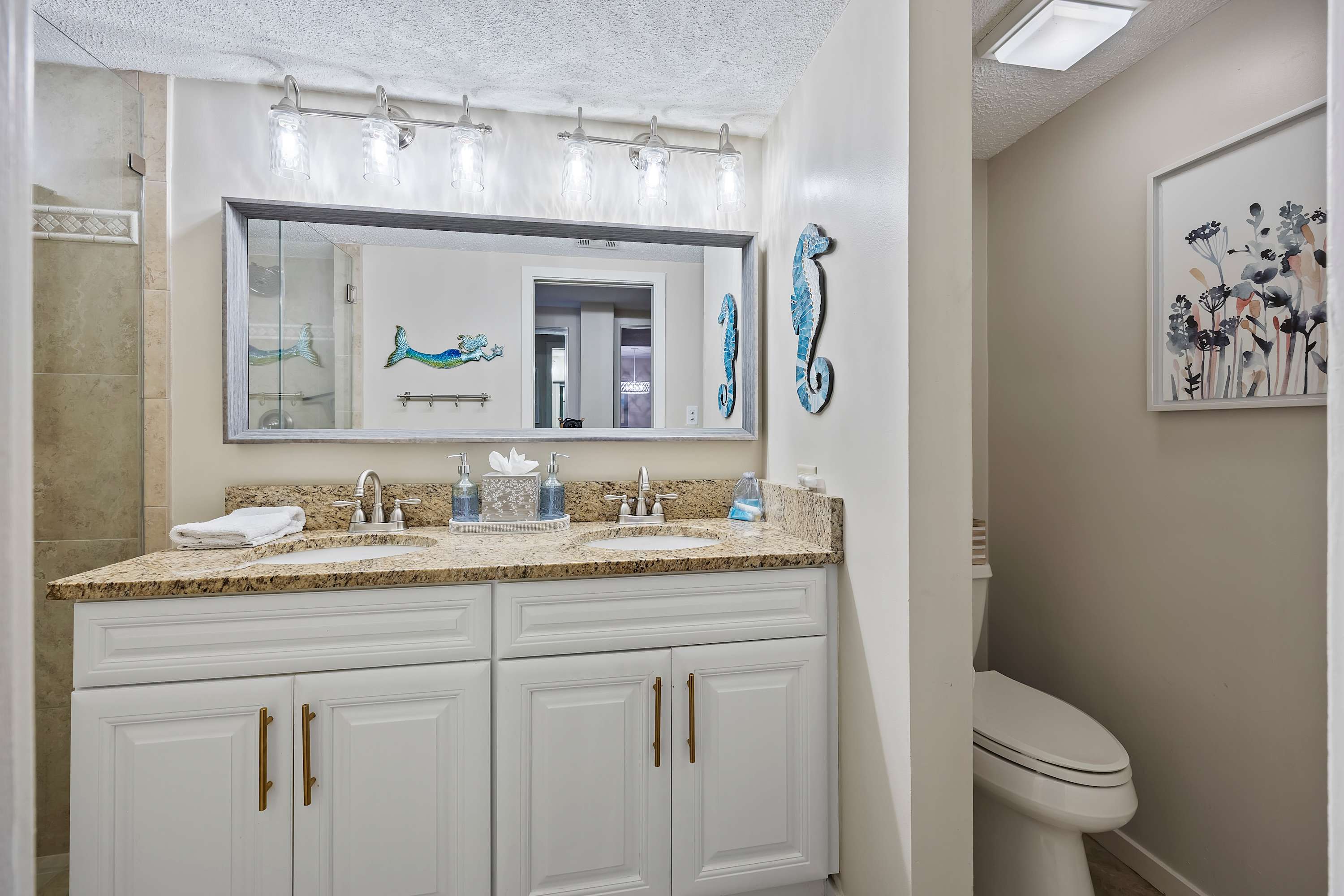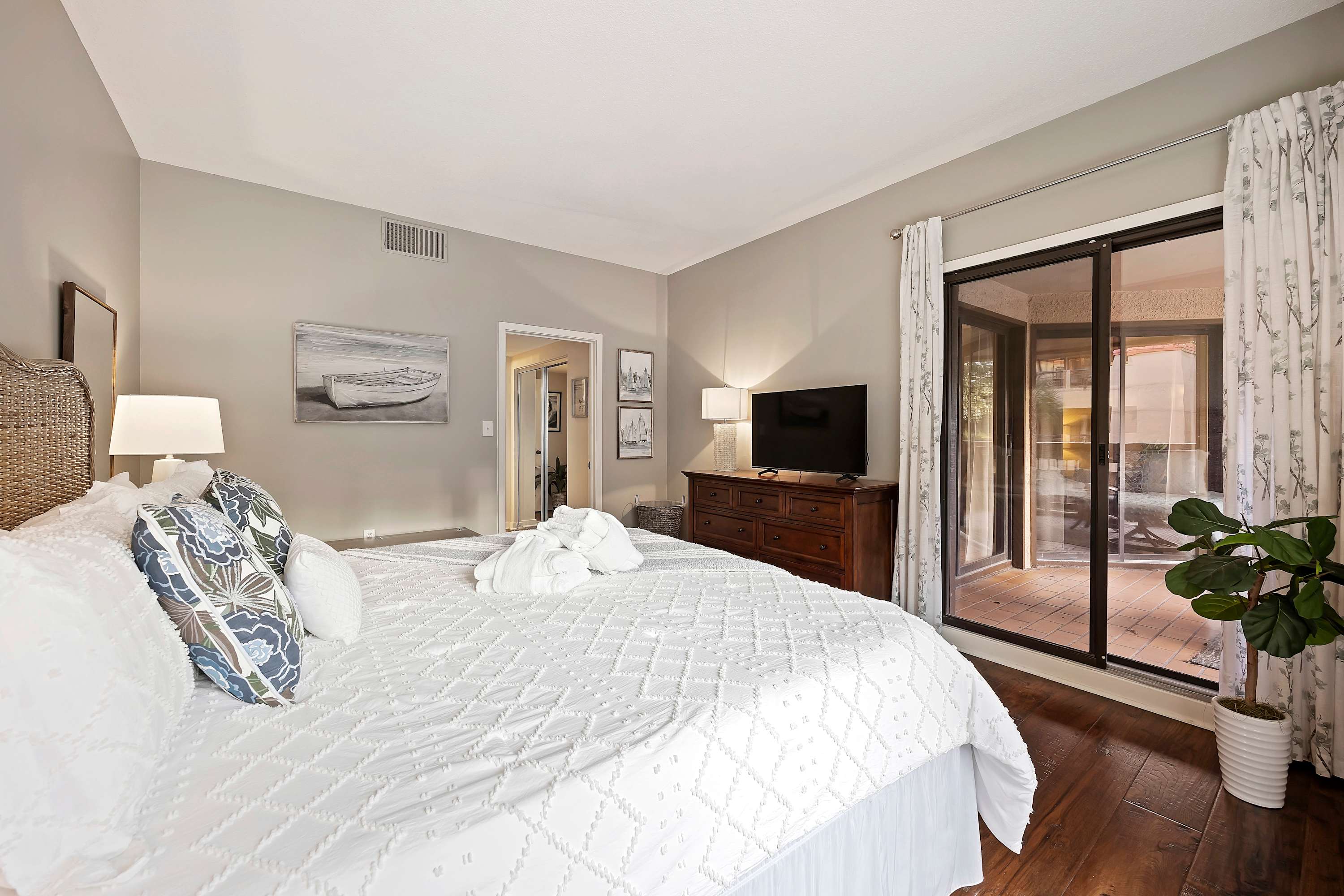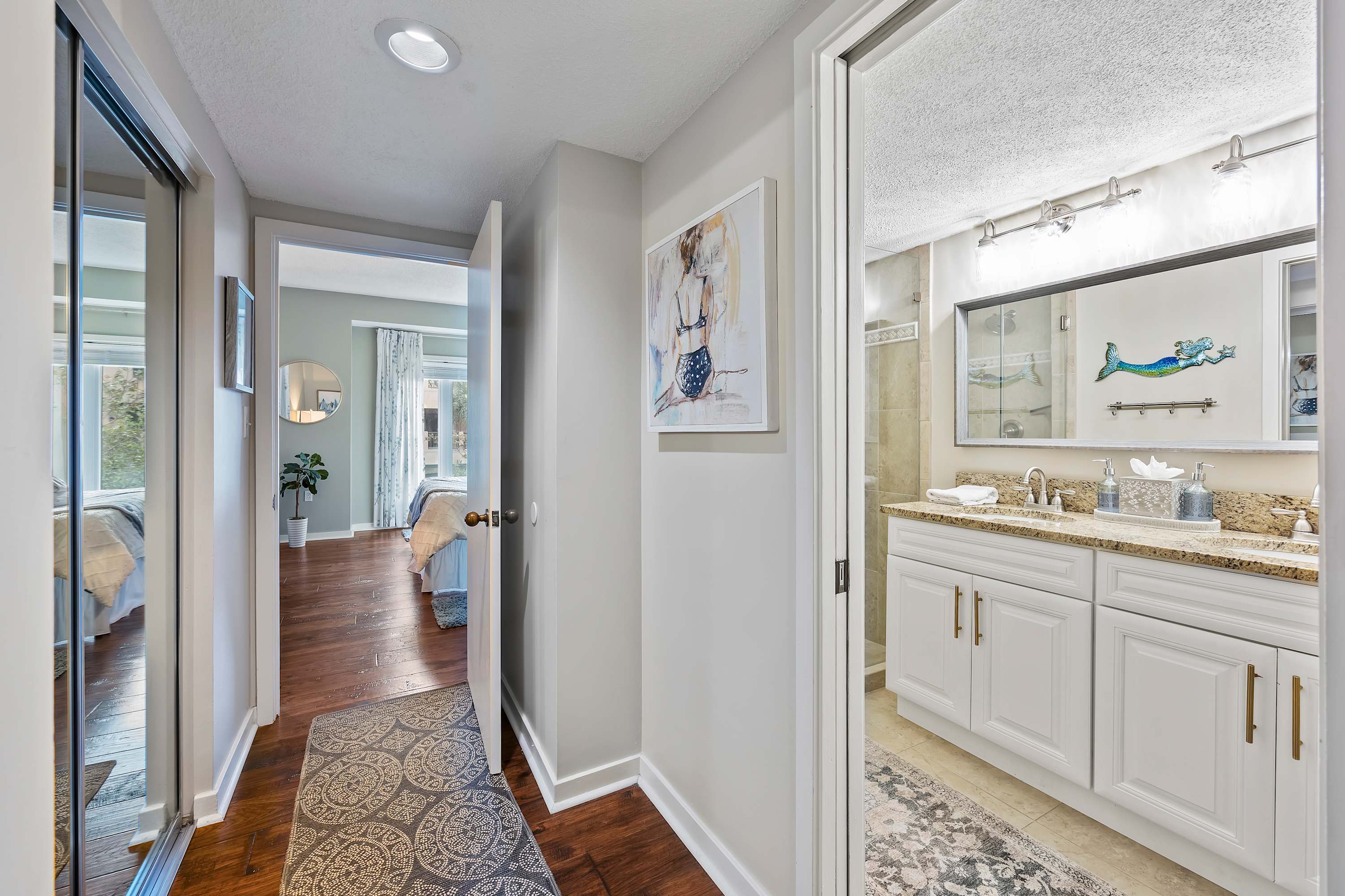Step out onto the spacious private balcony, furnished for outdoor dining and relaxing. Overlooking the iconic Mermaid Statue, the balcony sits just above the marina’s shops and restaurants, making it easy to stroll below for waterfront dining, live music, and sunset walks. A handy balcony closet is stocked with beach gear and beach towels for guest use.