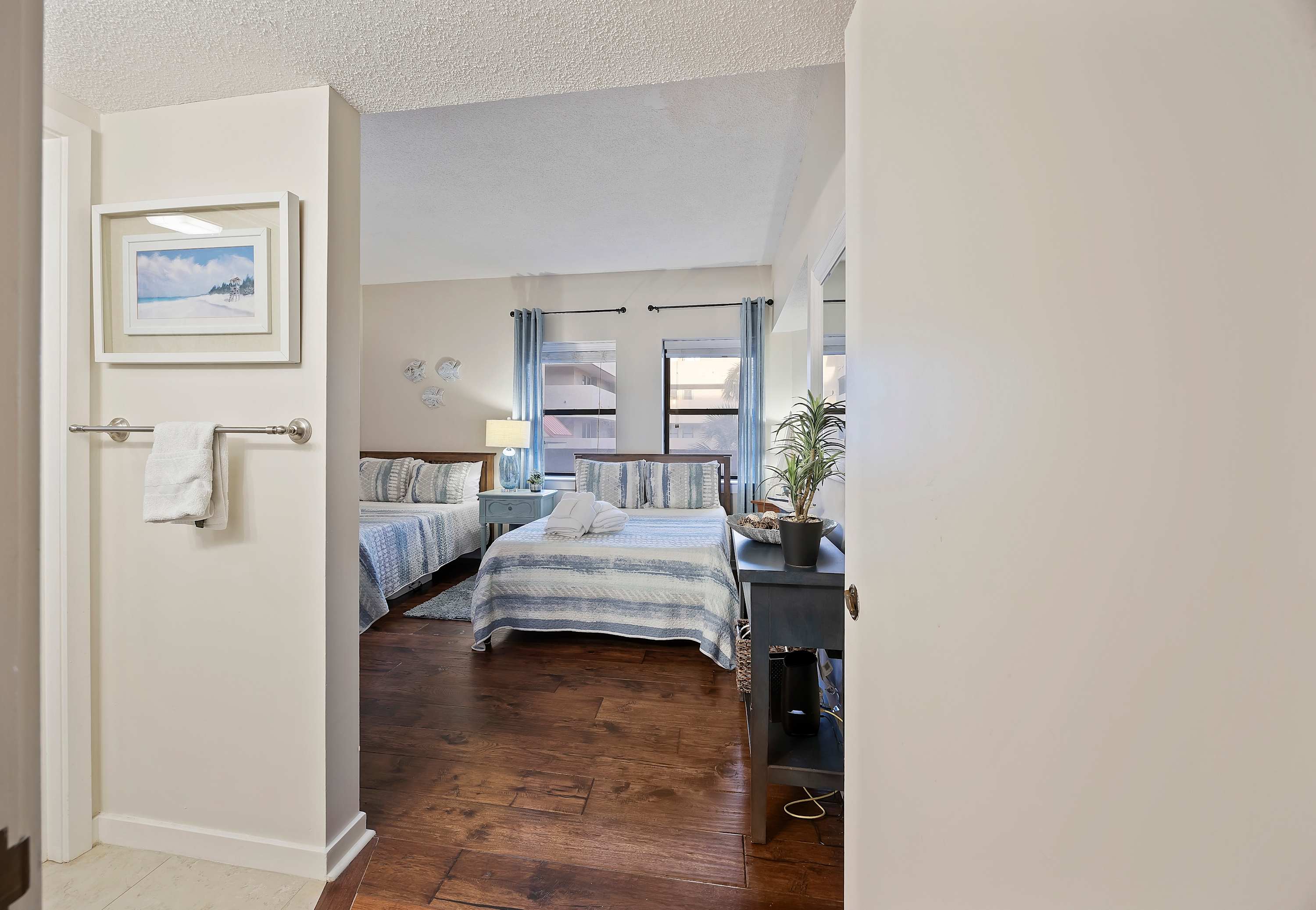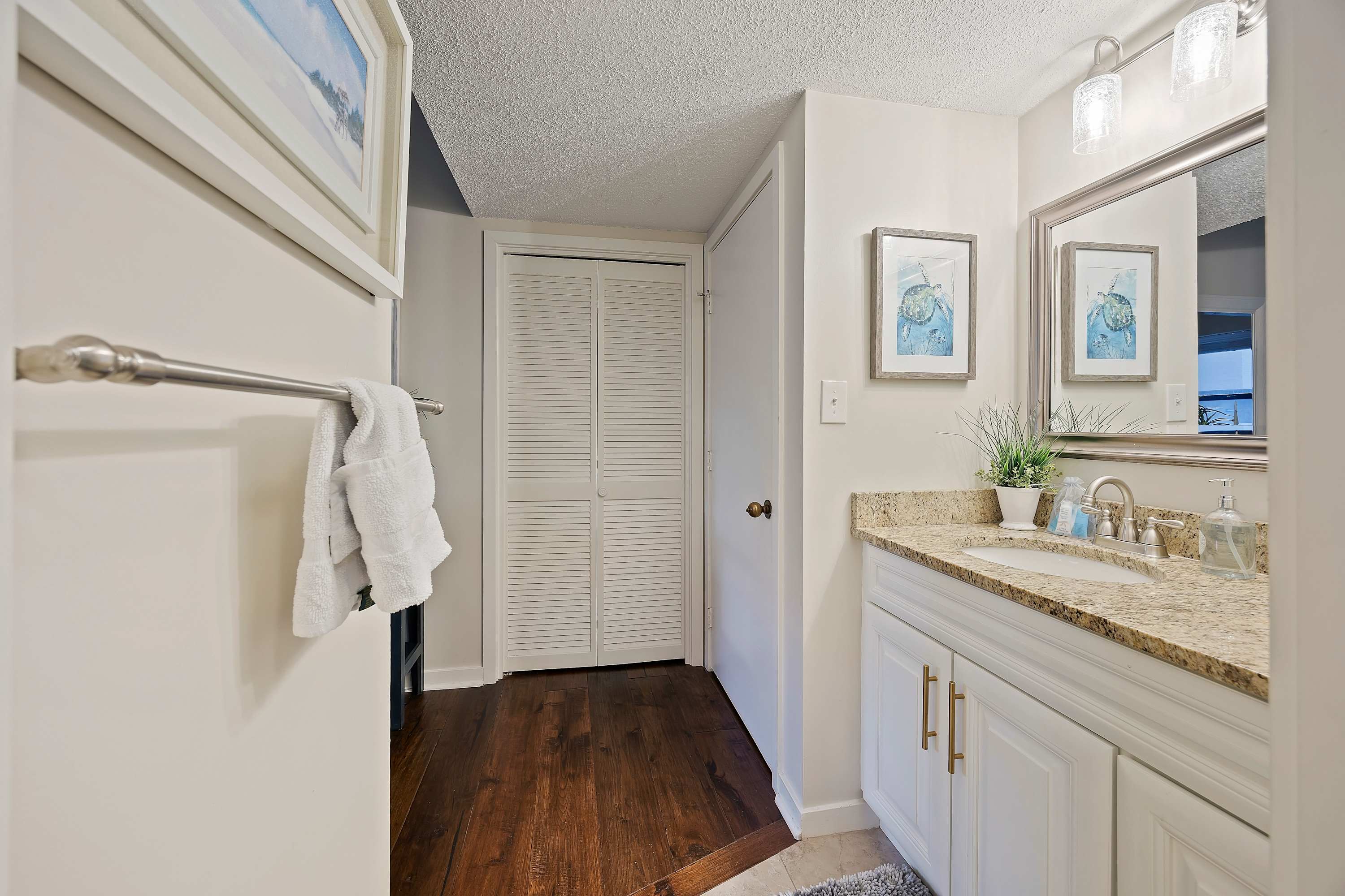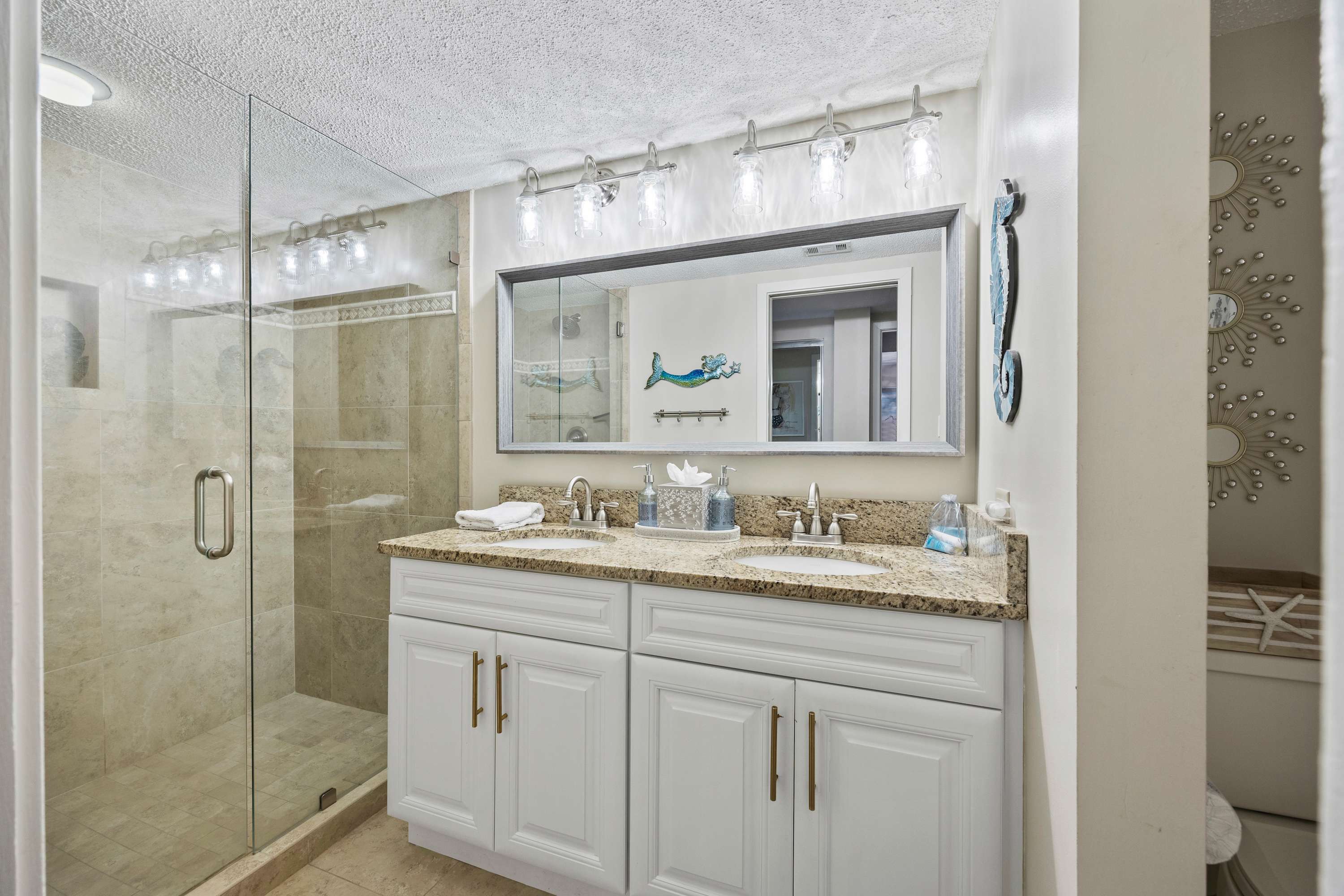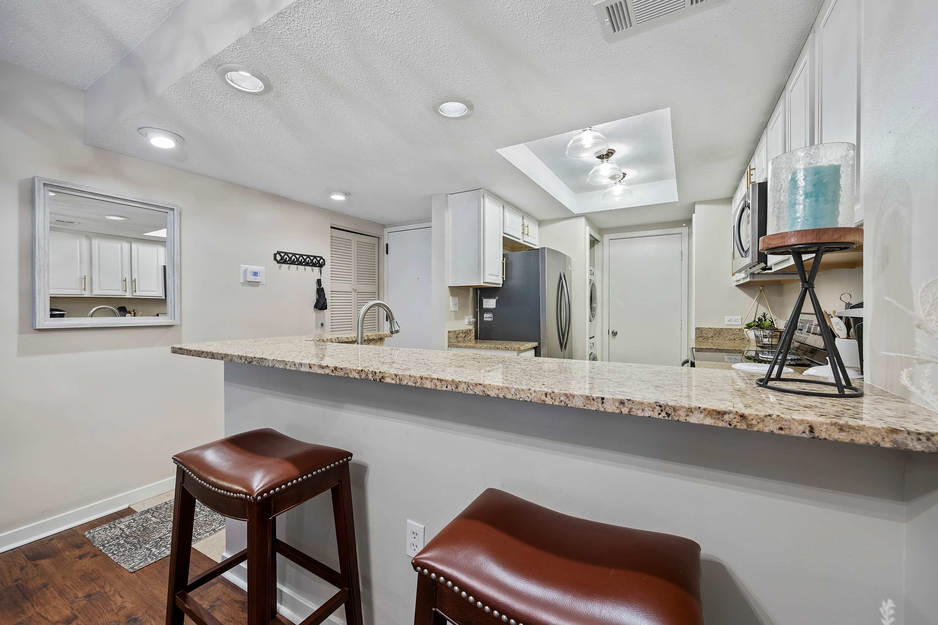 Step out onto the spacious private balcony, furnished for outdoor dining and relaxing. Overlooking the iconic Mermaid Statue, the balcony sits just above the marina’s shops and restaurants, making it easy to stroll below for waterfront dining, live music, and sunset walks. A handy balcony closet is stocked with beach gear and beach towels for guest use.