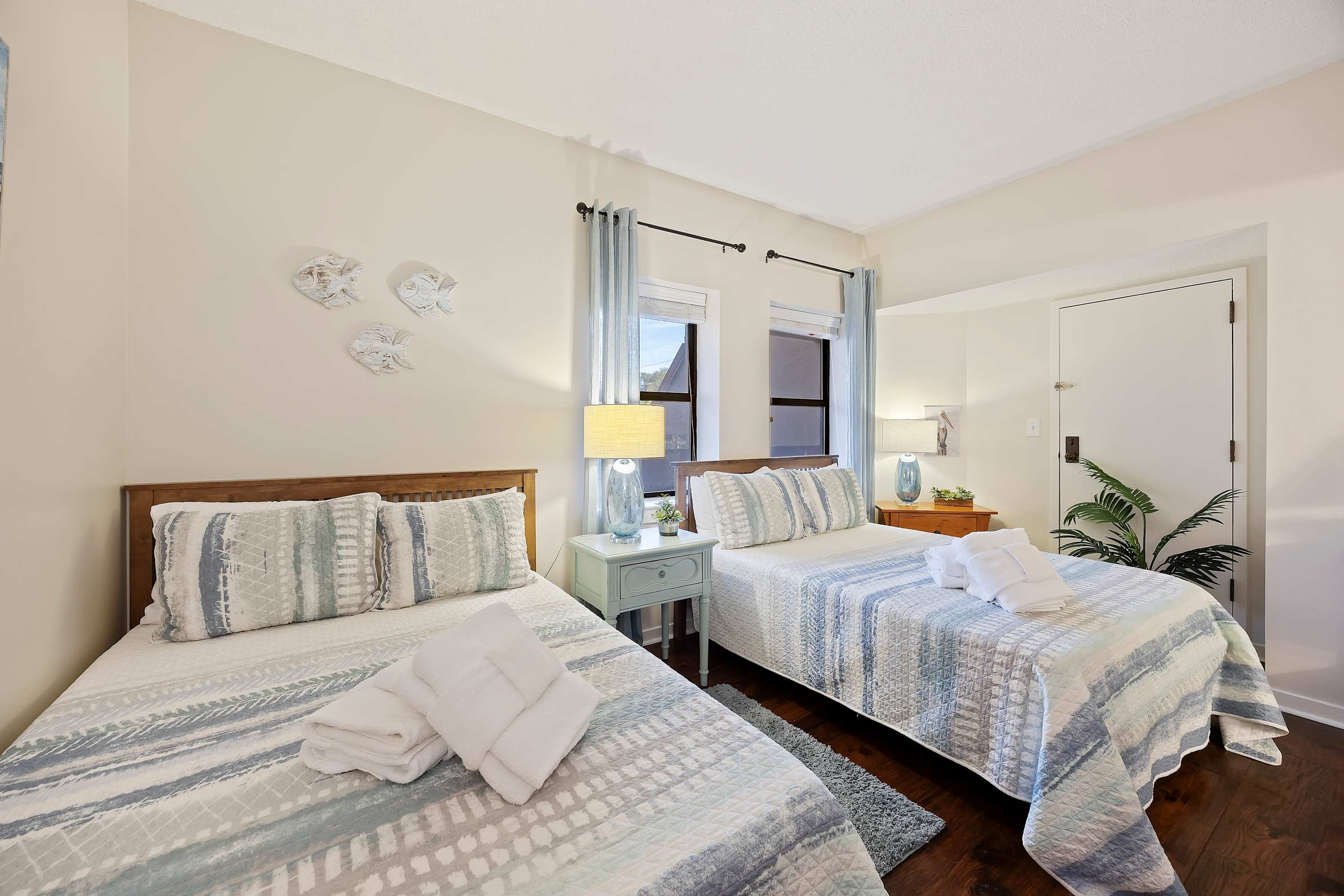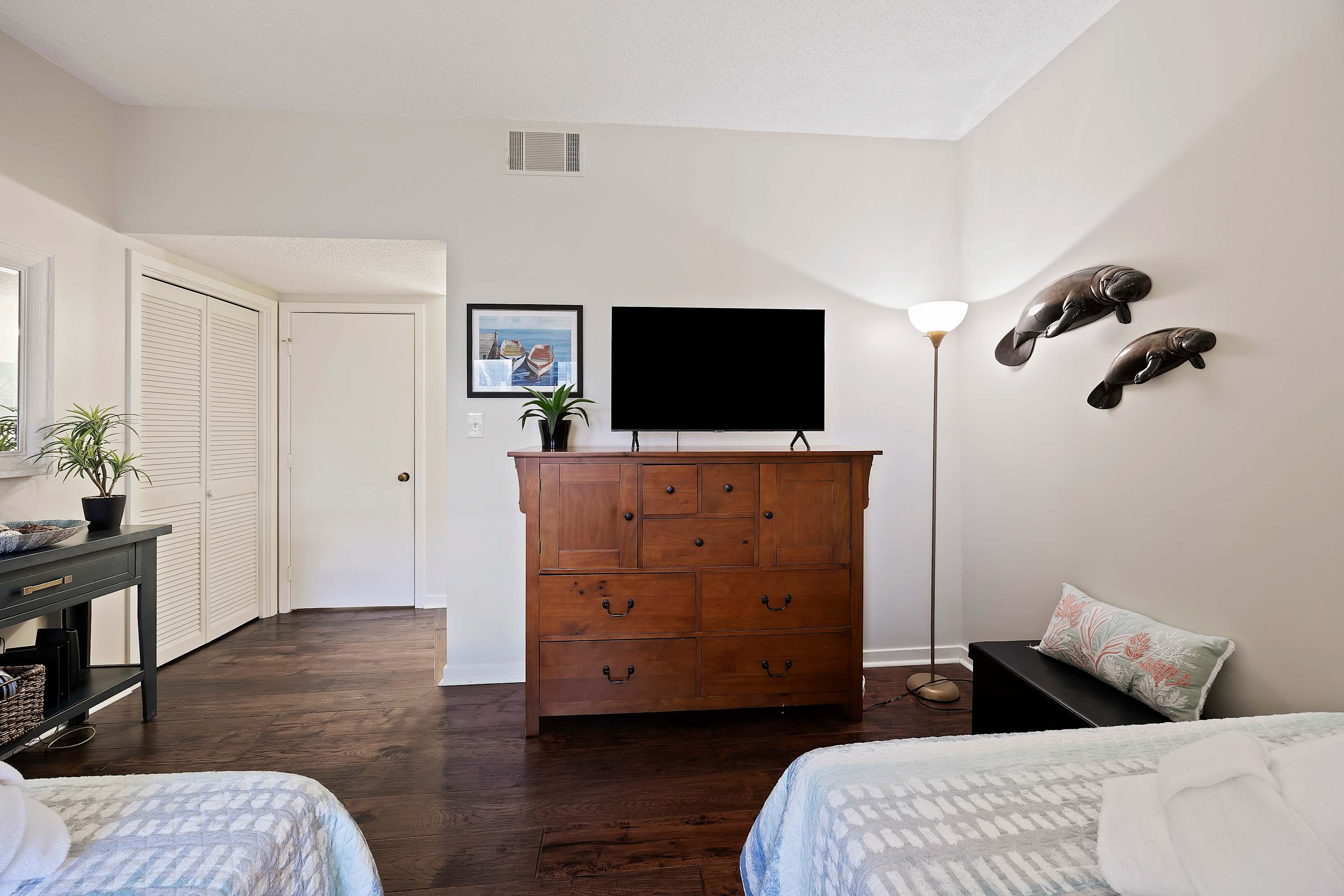 Guest Bedroom: Two full-size beds, TV, and ensuite bathroom with tub/shower
