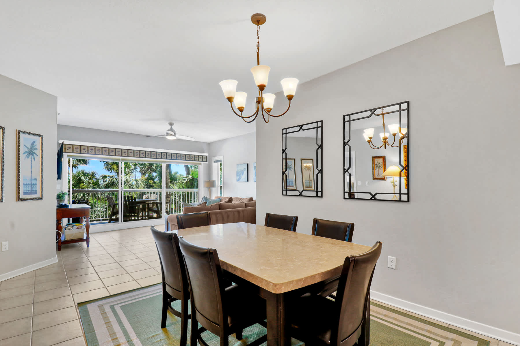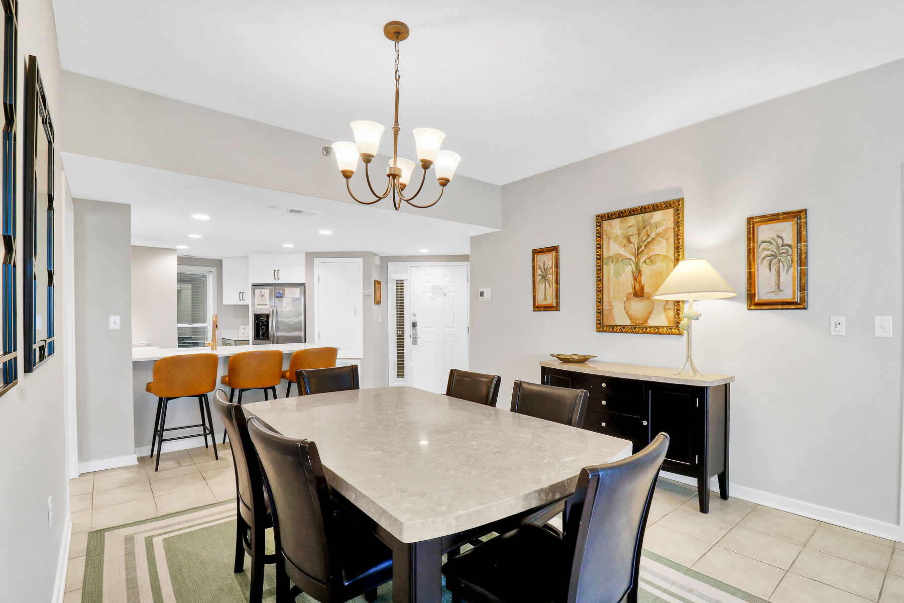 Dining Area: Seating for six, with additional space at the counter height bar for casual dining or work.