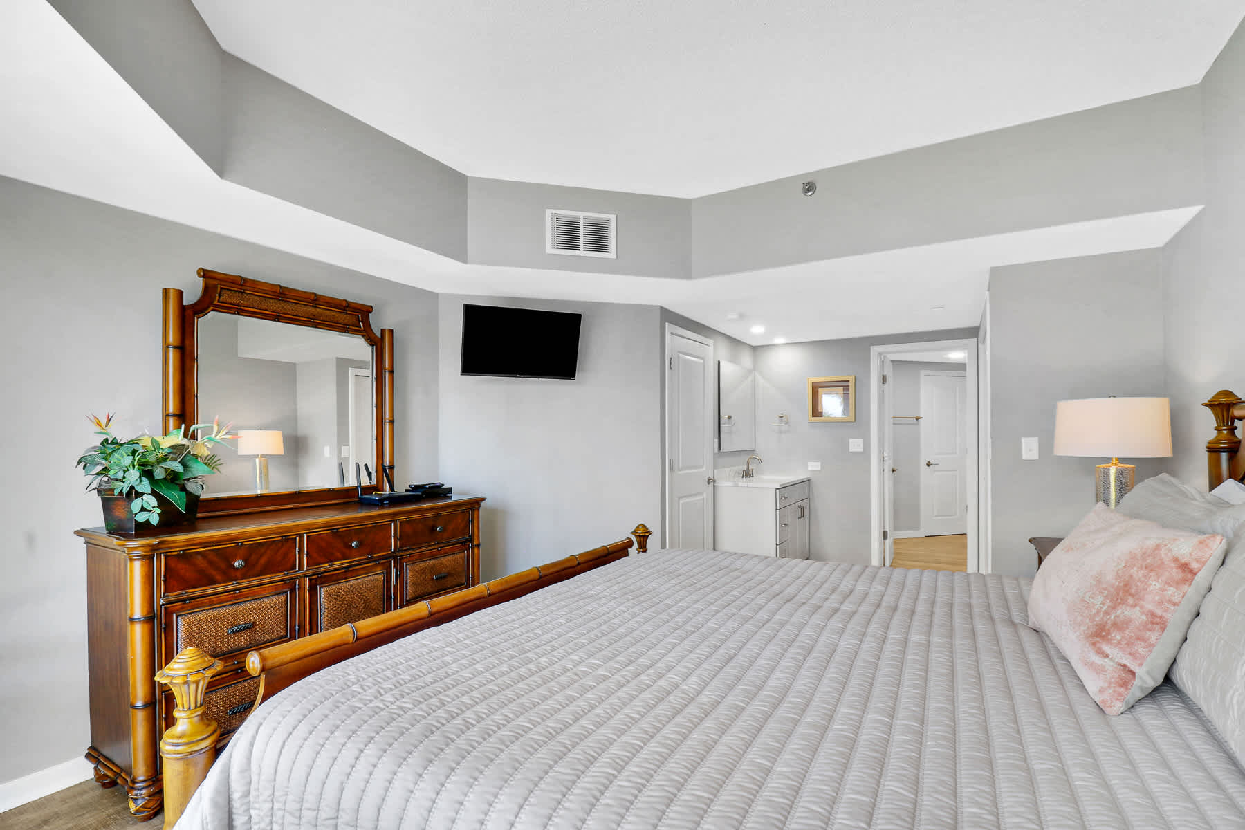 Master Suite: King-sized bed, Roku TV, private balcony access, and an en-suite bath with an oversized tub/shower and additional vanity space.