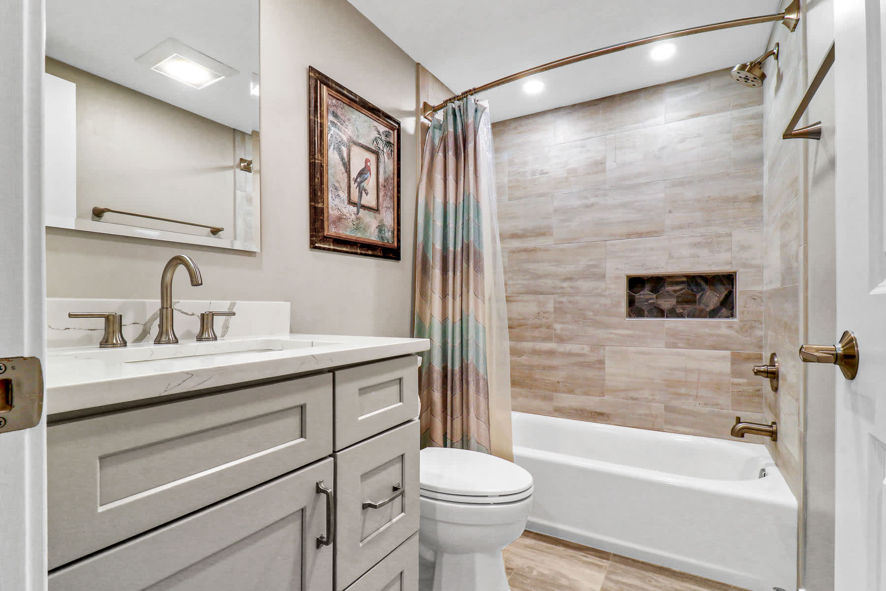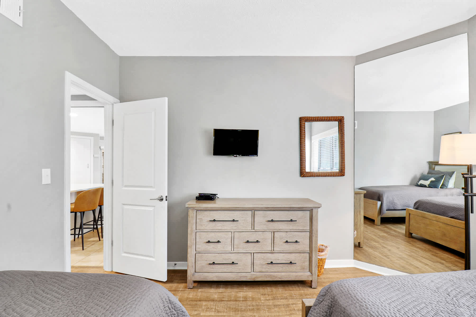Second Bedroom: Twin-sized bed and full-sized bed, Roku TV, sunny windows, and easy access to a spacious full bathroom with a tub/shower combo.