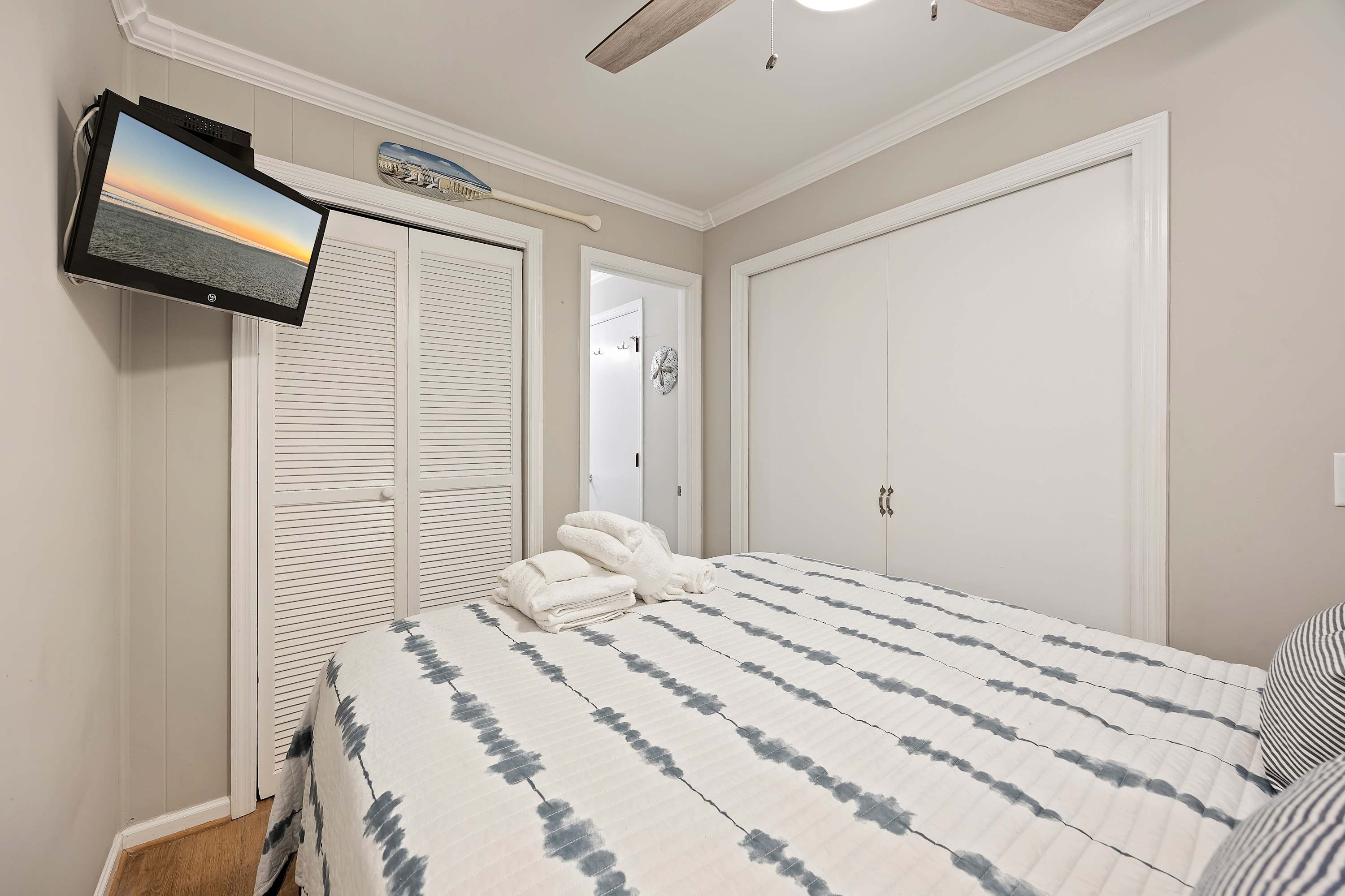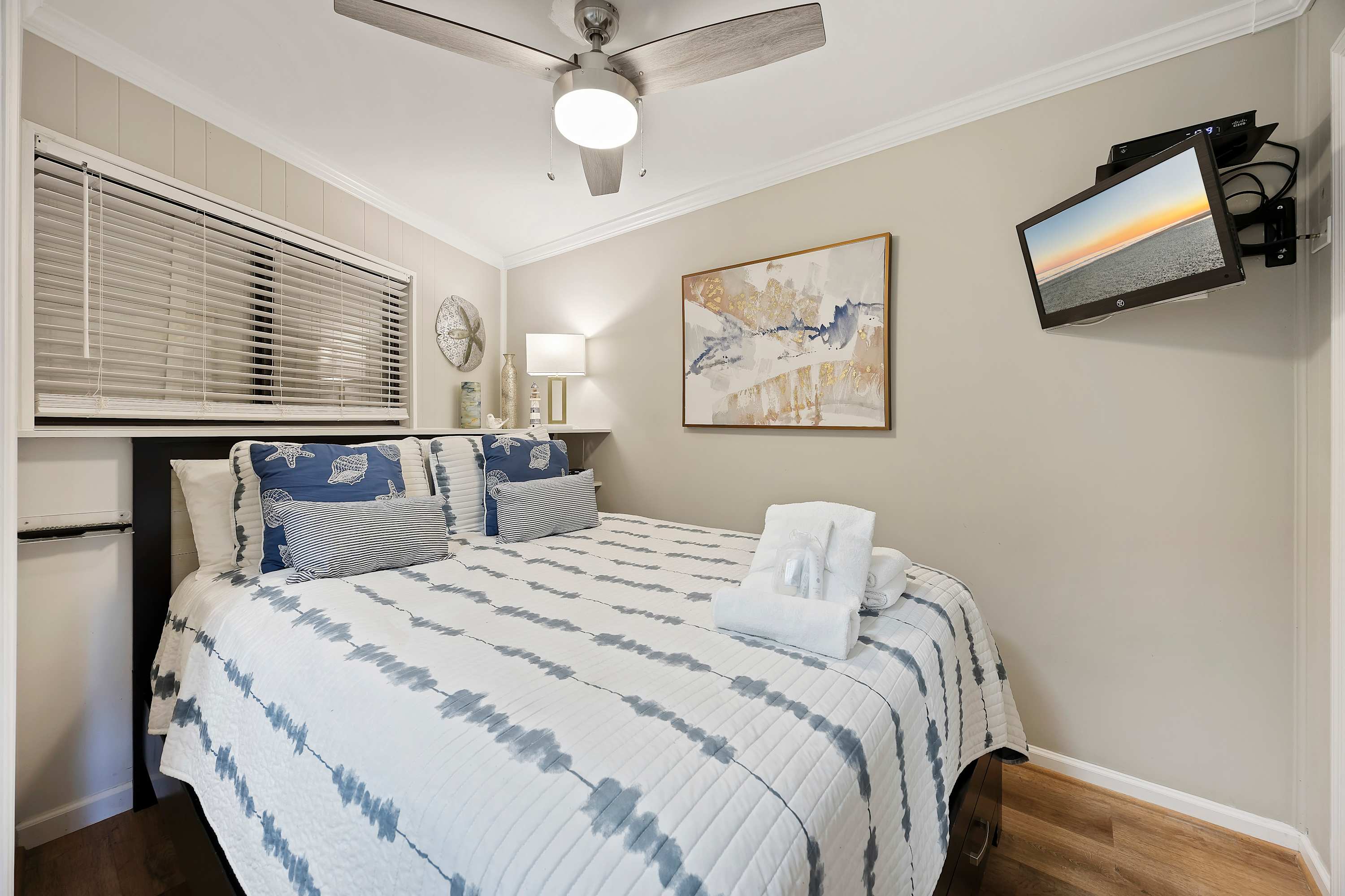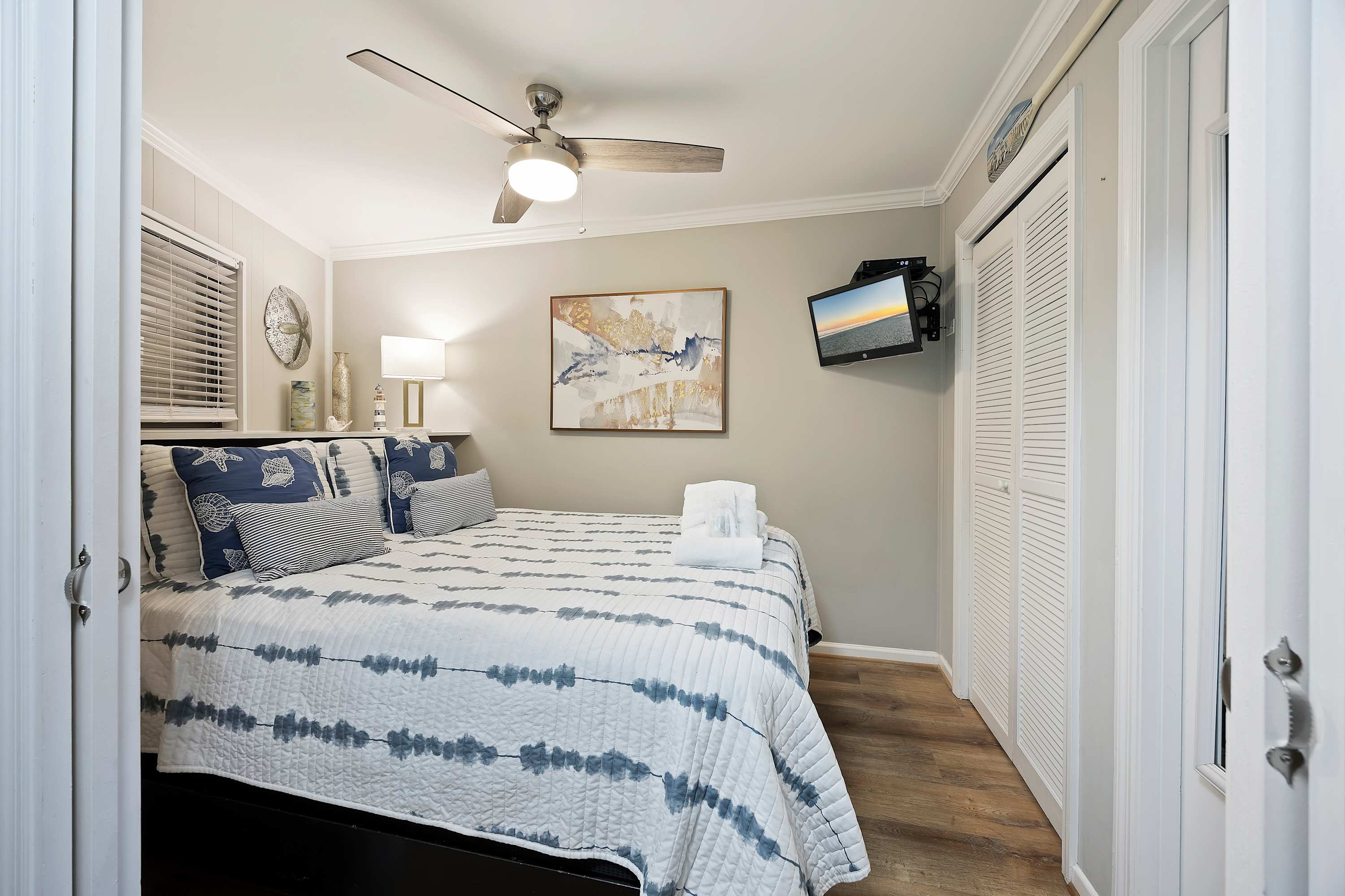 Master Bedroom: Queen-sized bed with fresh linens and a flat-screen TV.