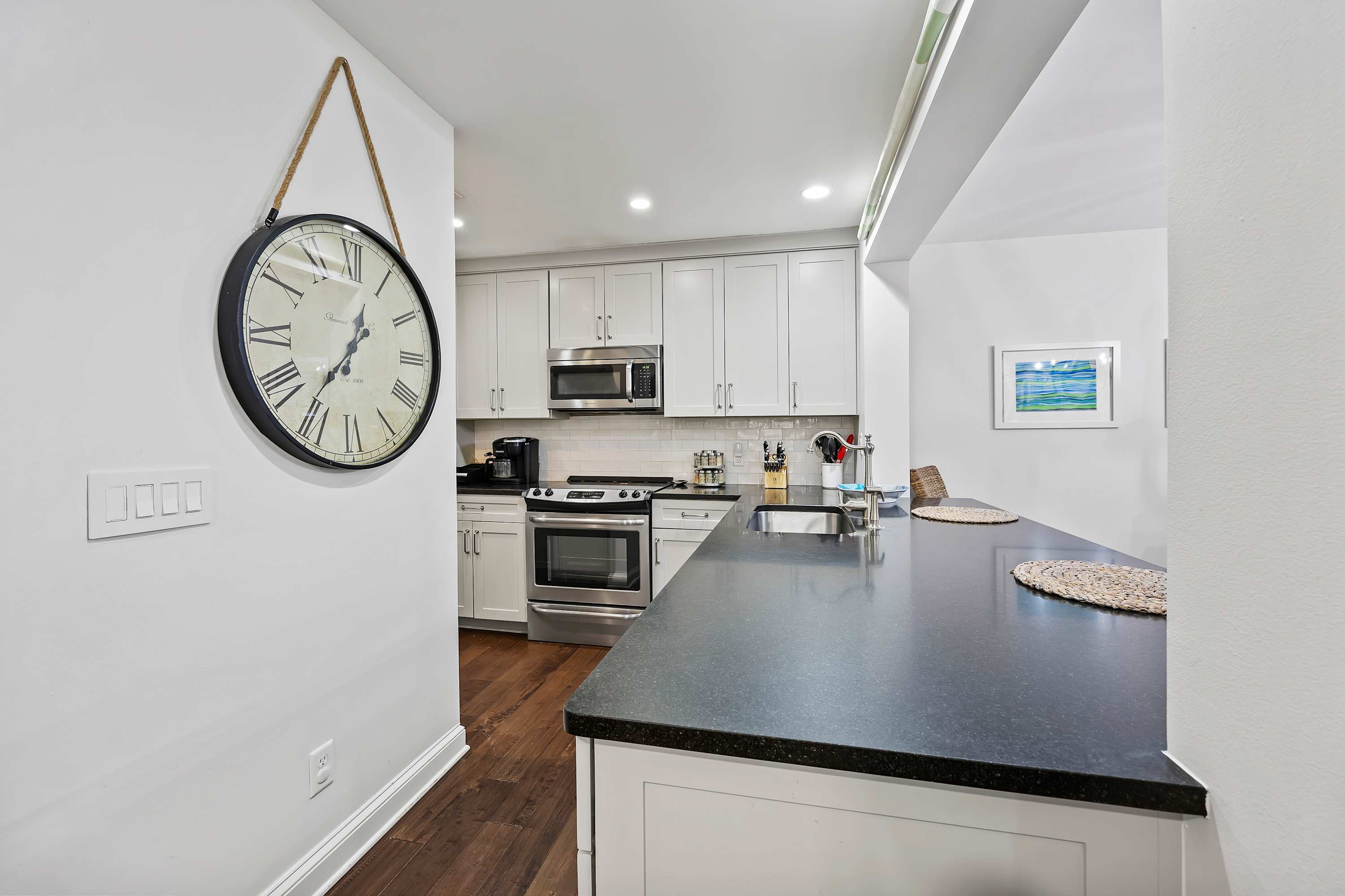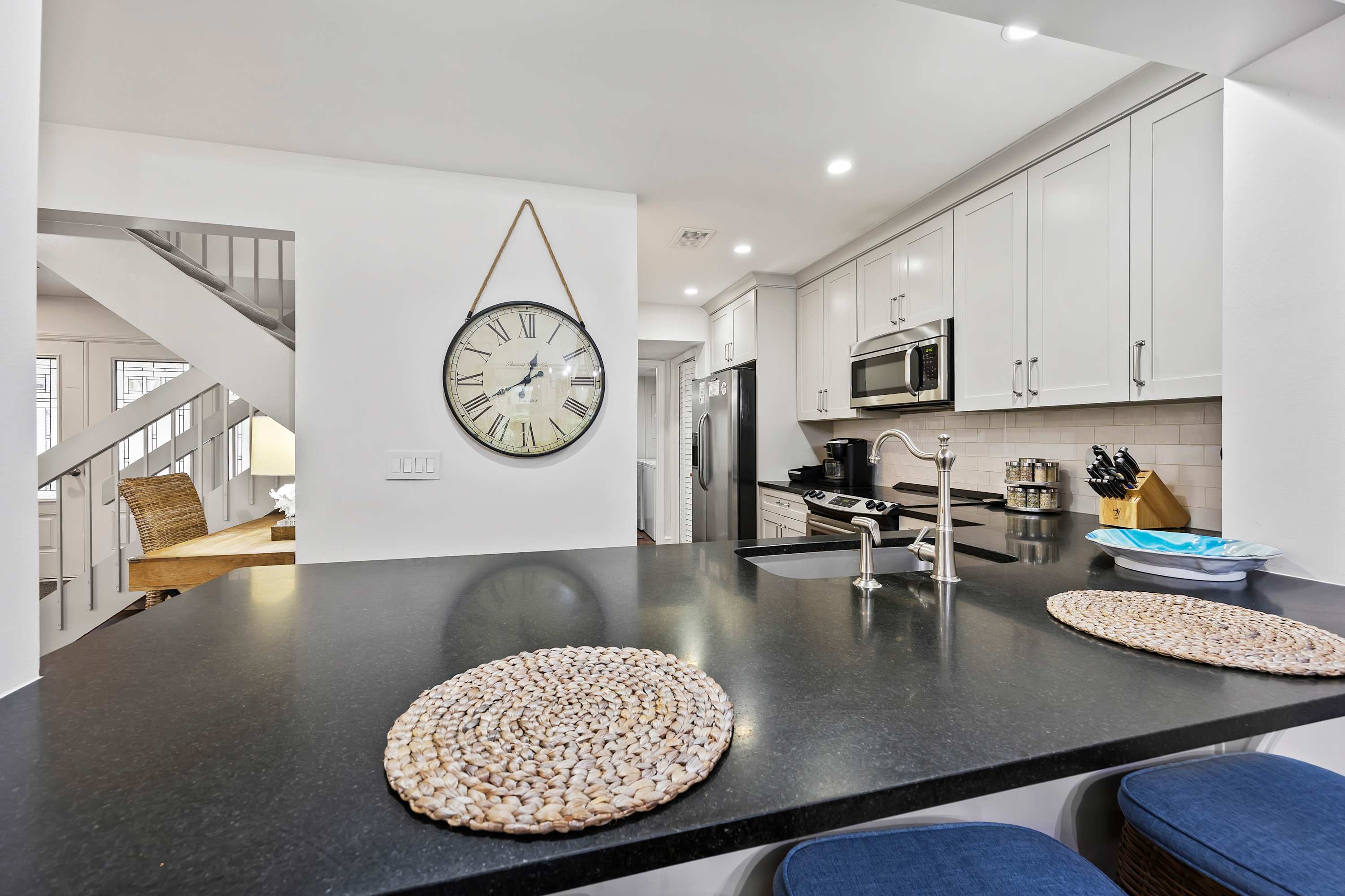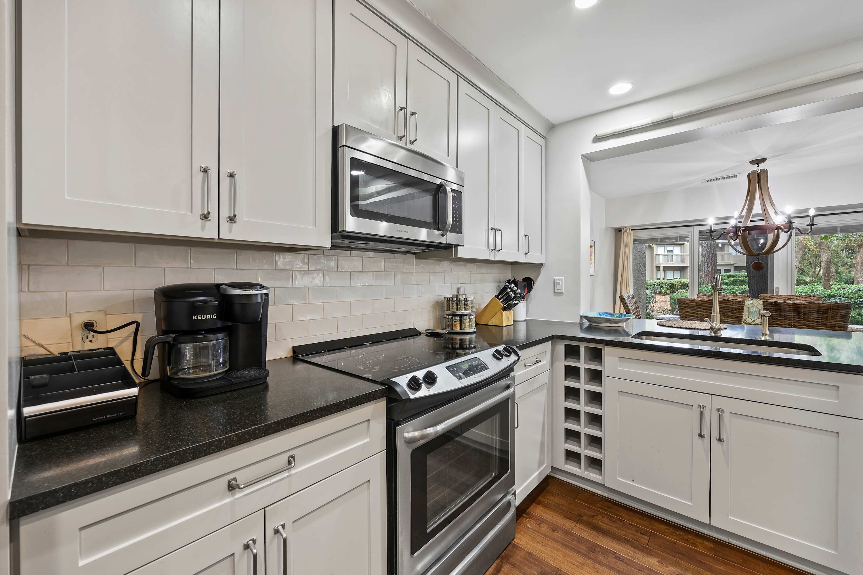 Renovated Kitchen: Features stainless steel appliances, granite countertops, a breakfast bar, and a dry bar with a drip coffee maker and Keurig.