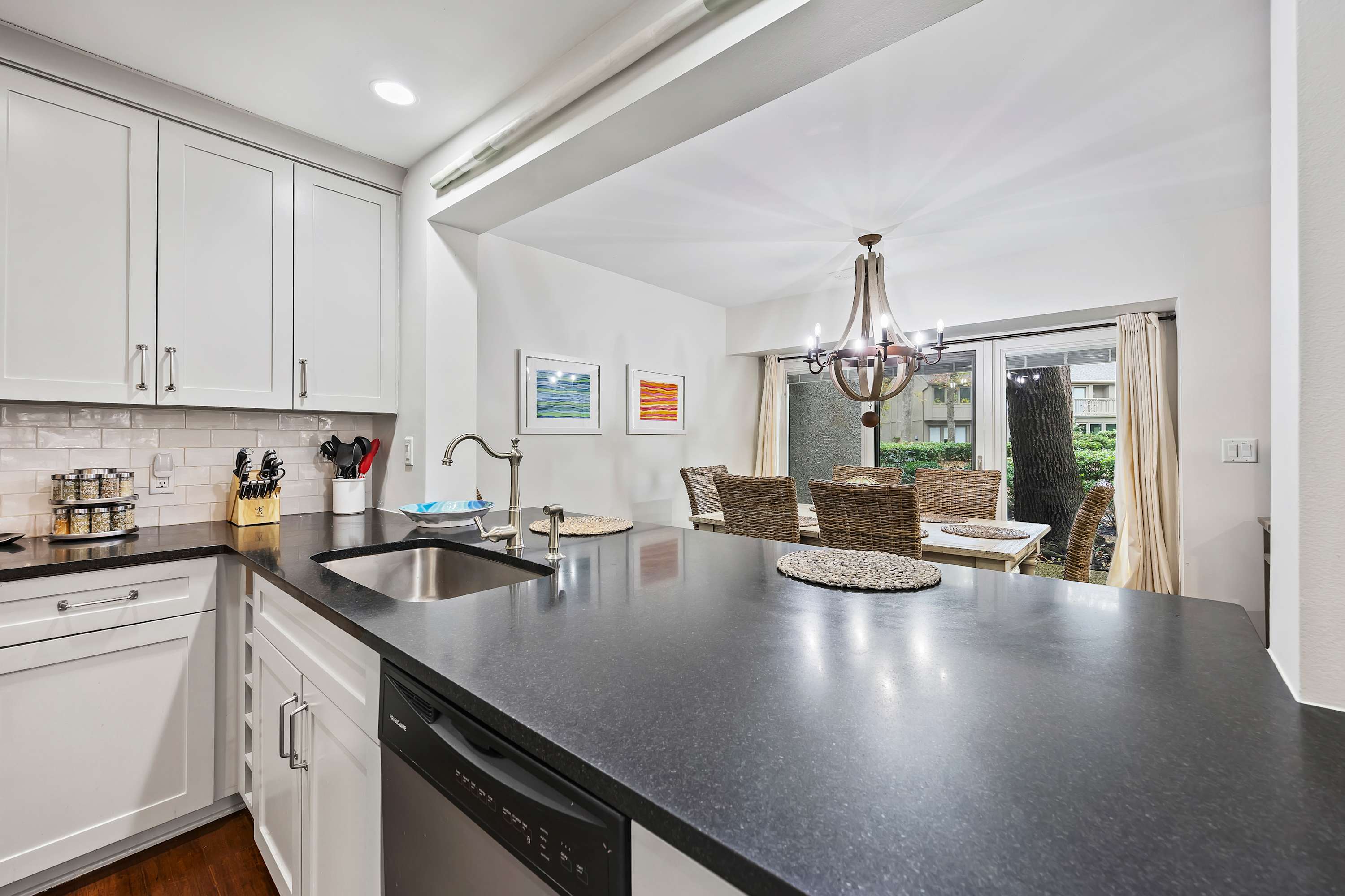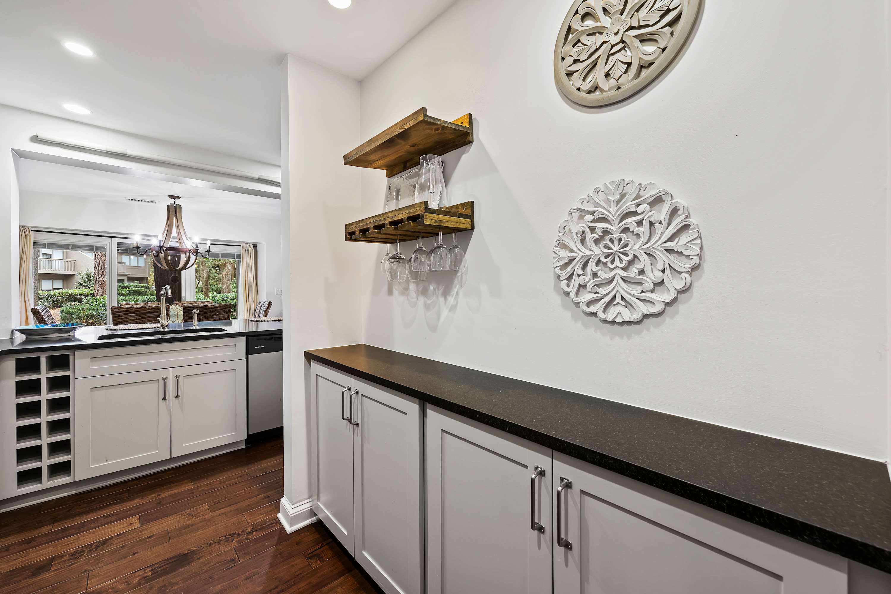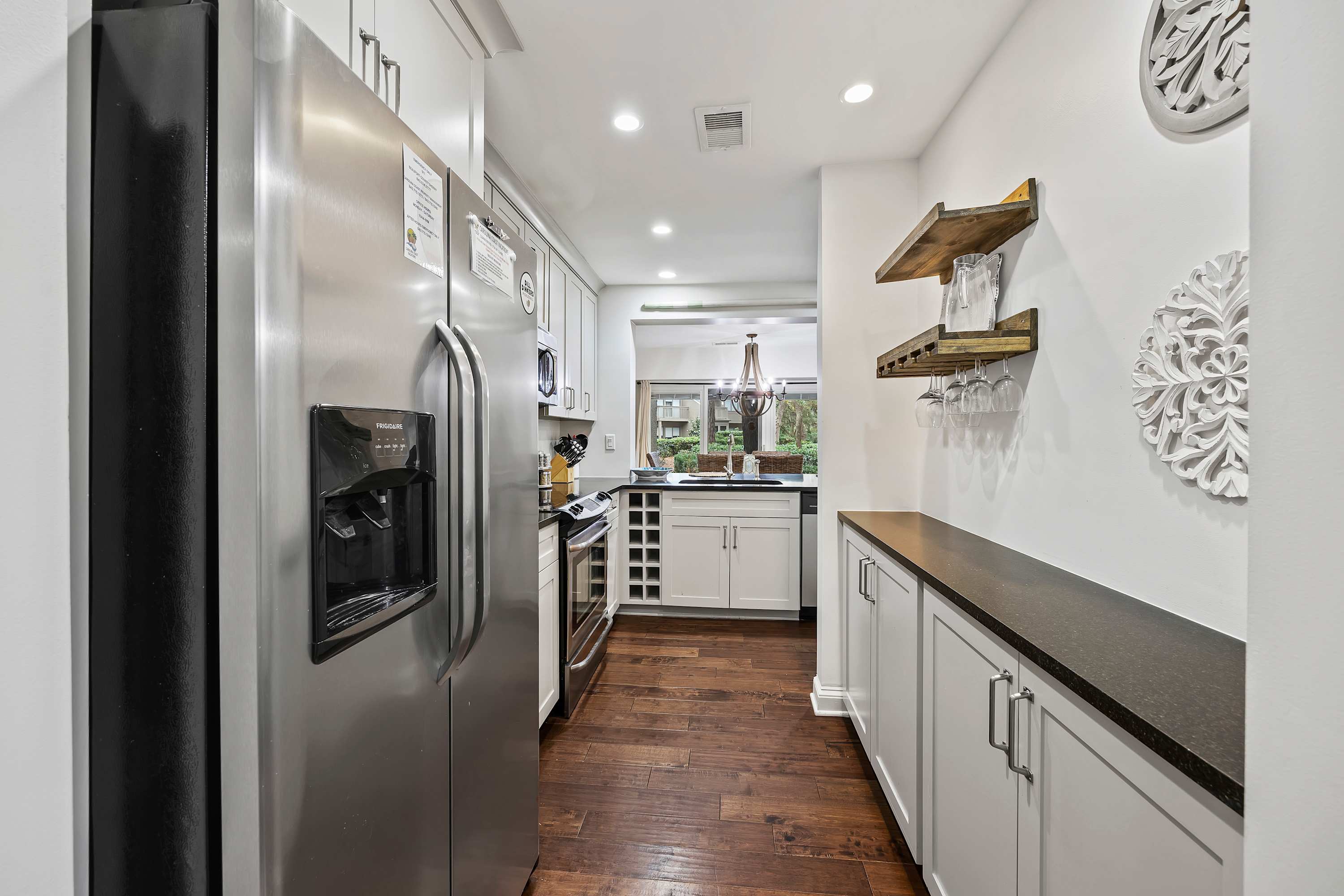 Renovated Kitchen: Features stainless steel appliances, granite countertops, a breakfast bar, and a dry bar with a drip coffee maker and Keurig.