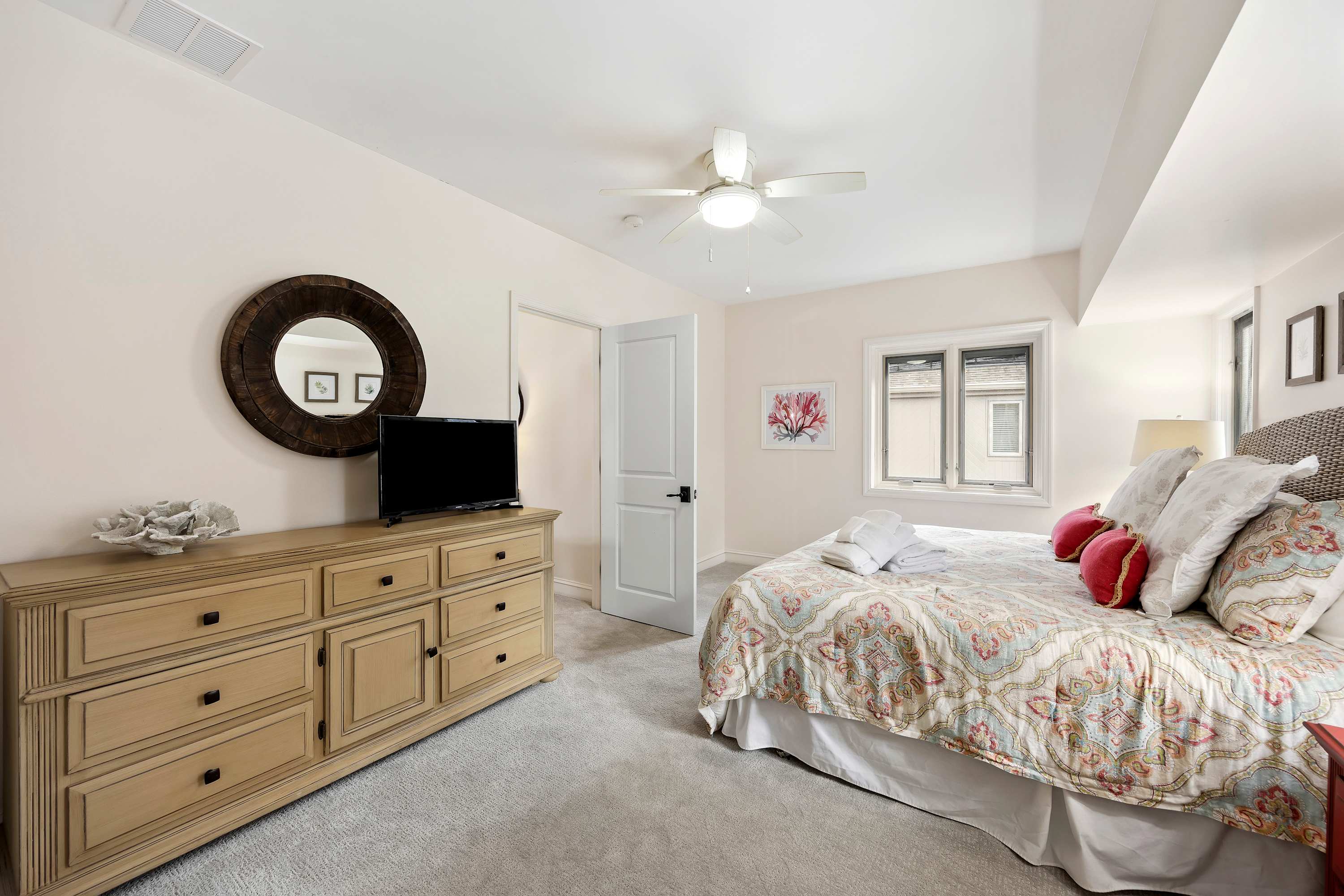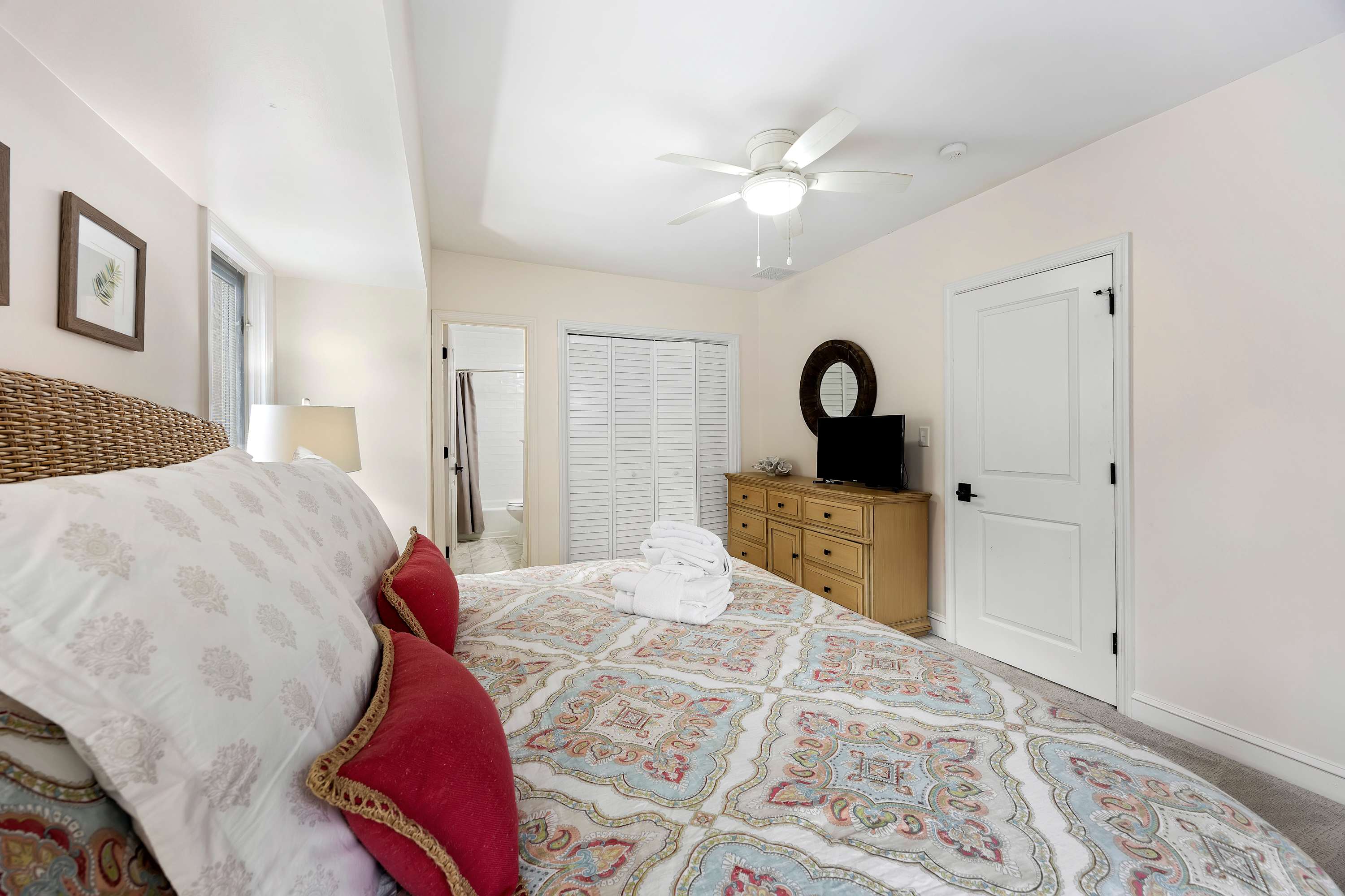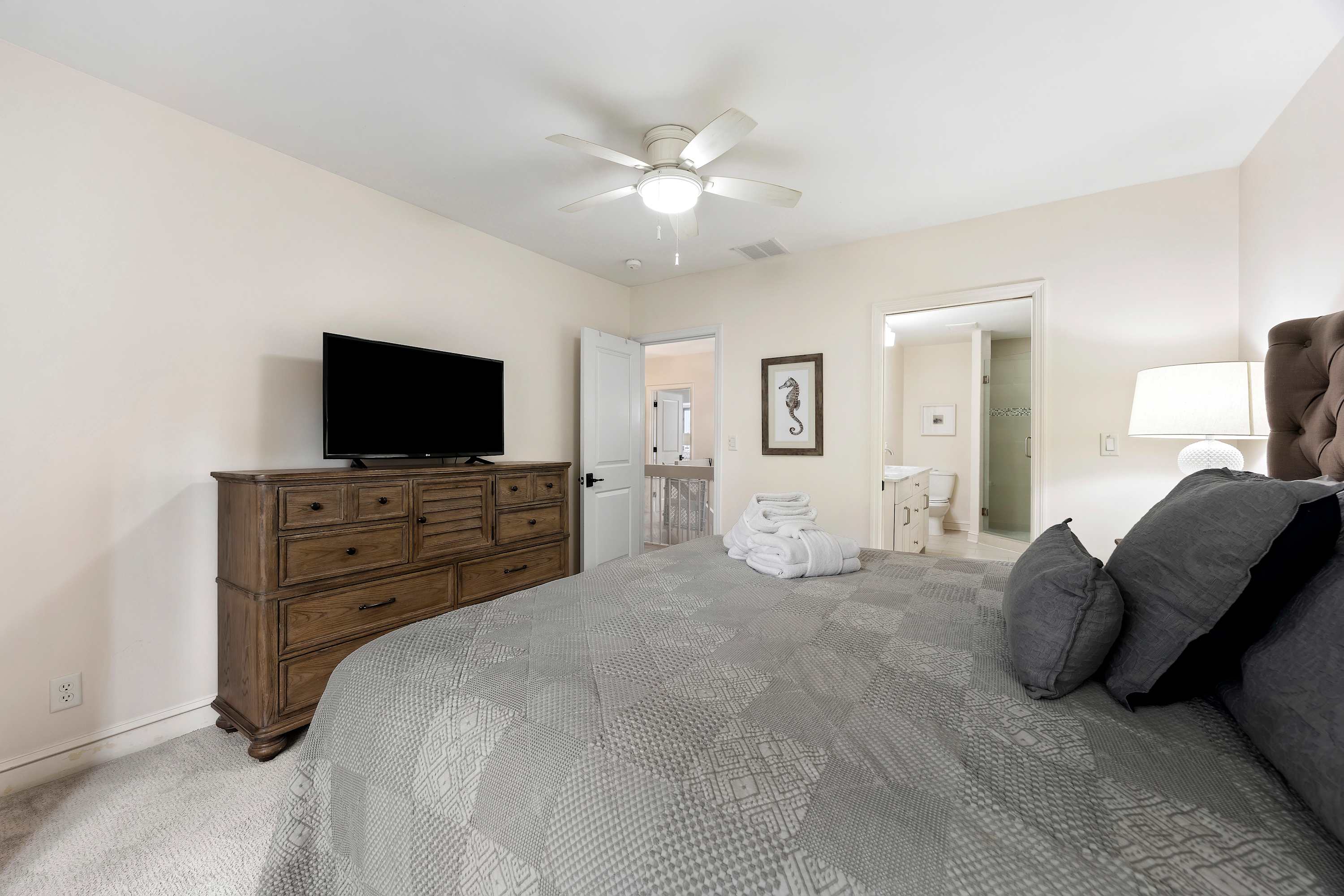 Second Owner’s Suite: King-sized bed, Smart TV, and ensuite bathroom with shower/tub combo.
