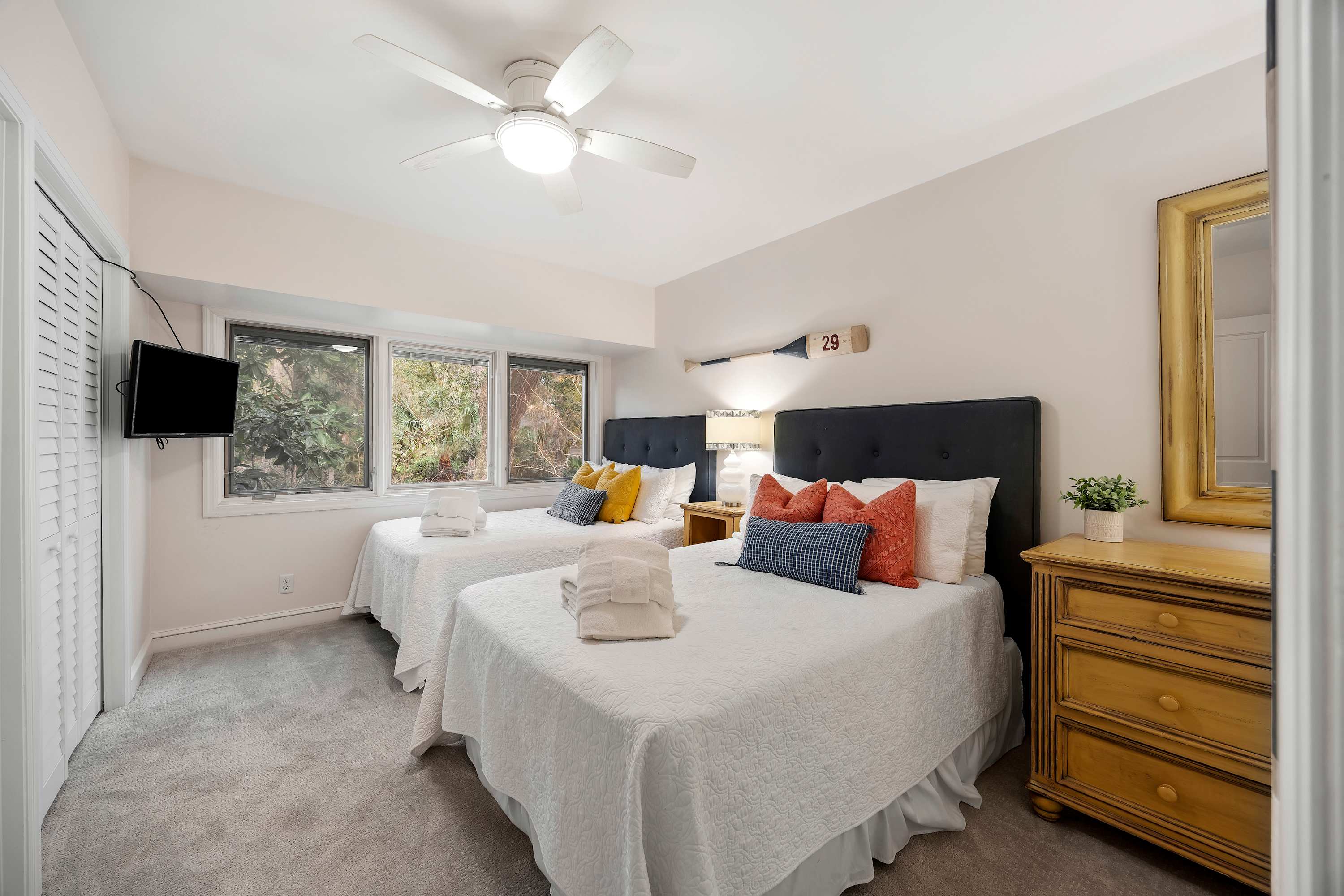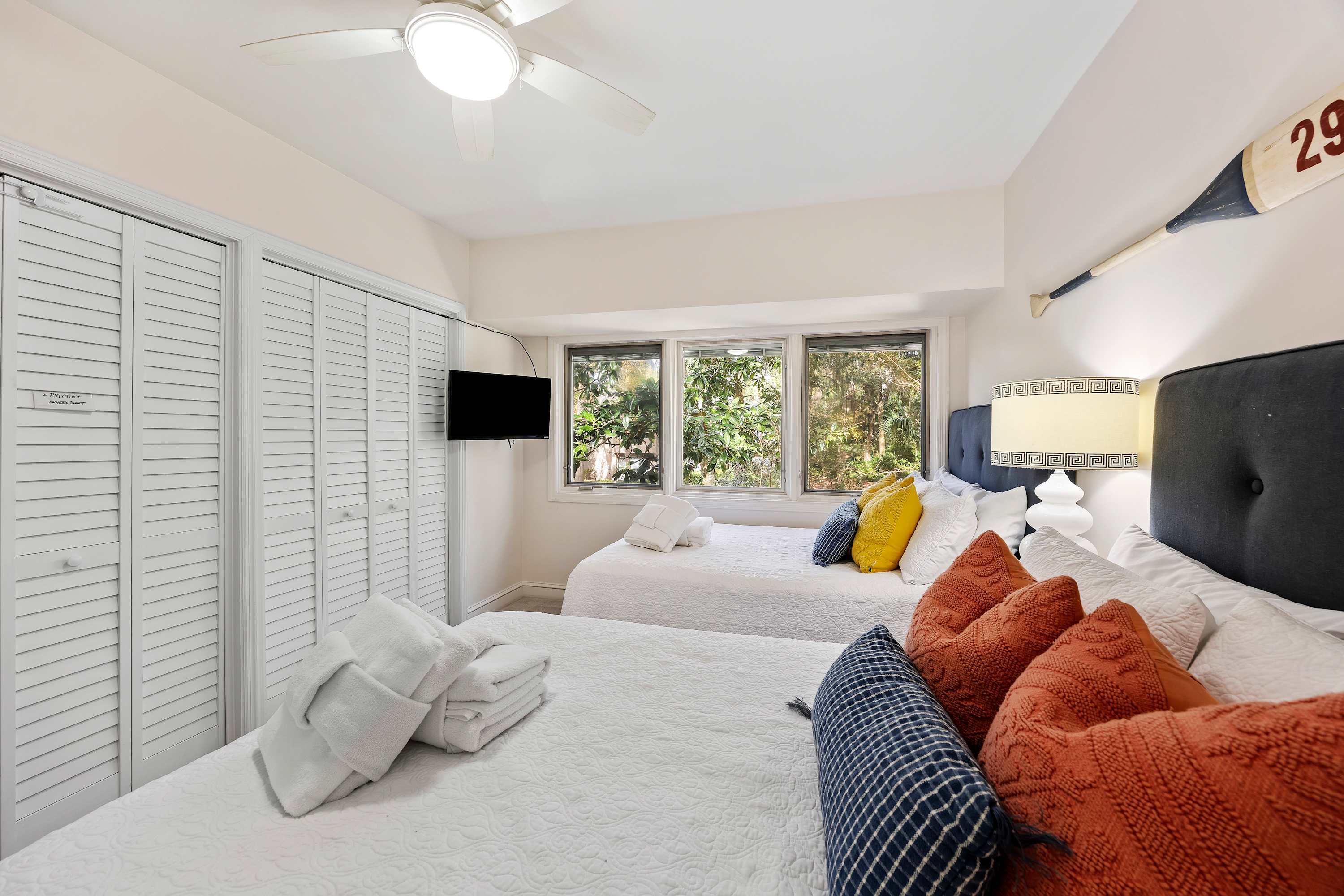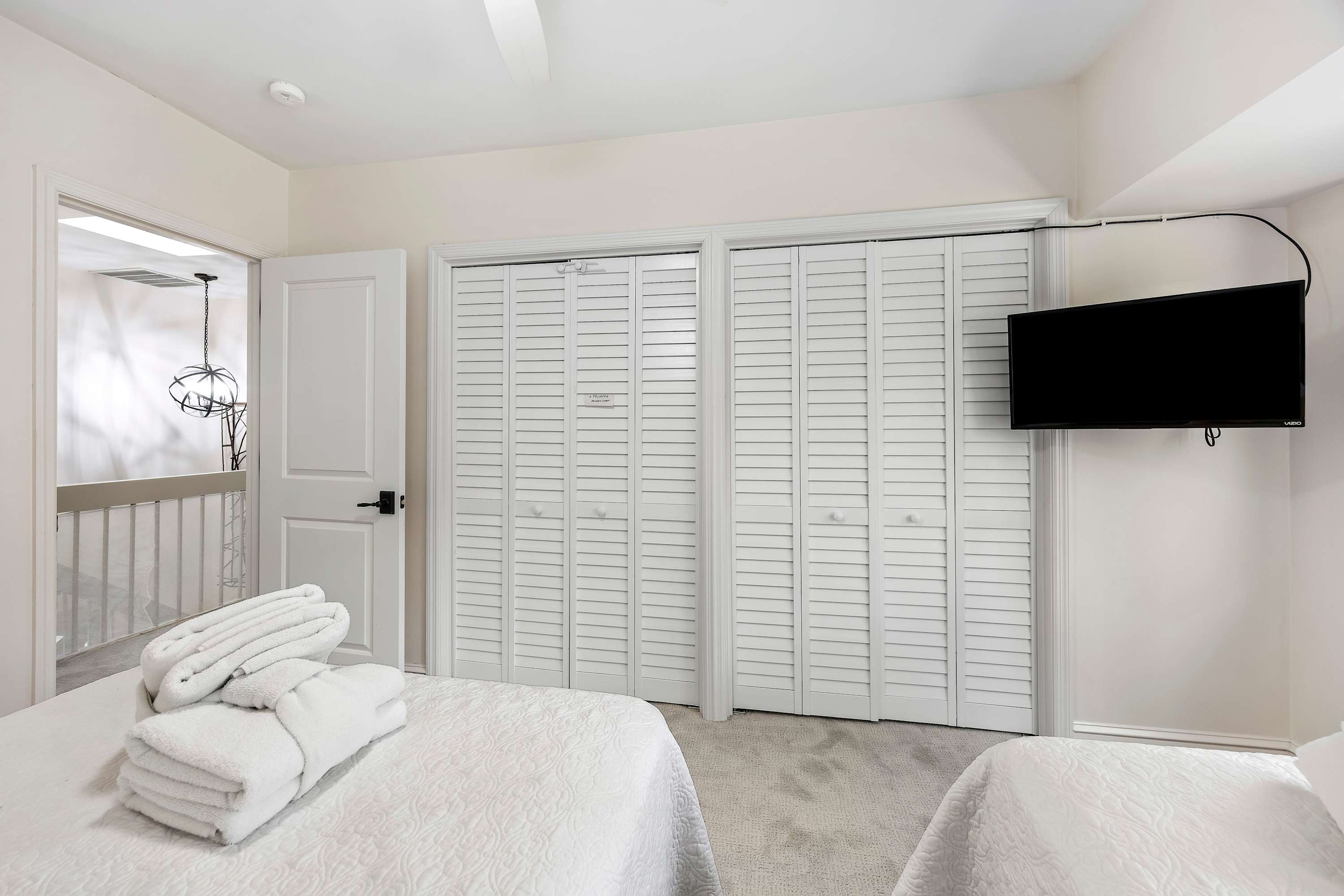 Third Bedroom: Two queen-sized beds, Smart TV, ample closet space, and ensuite bathroom with shower/tub combo.