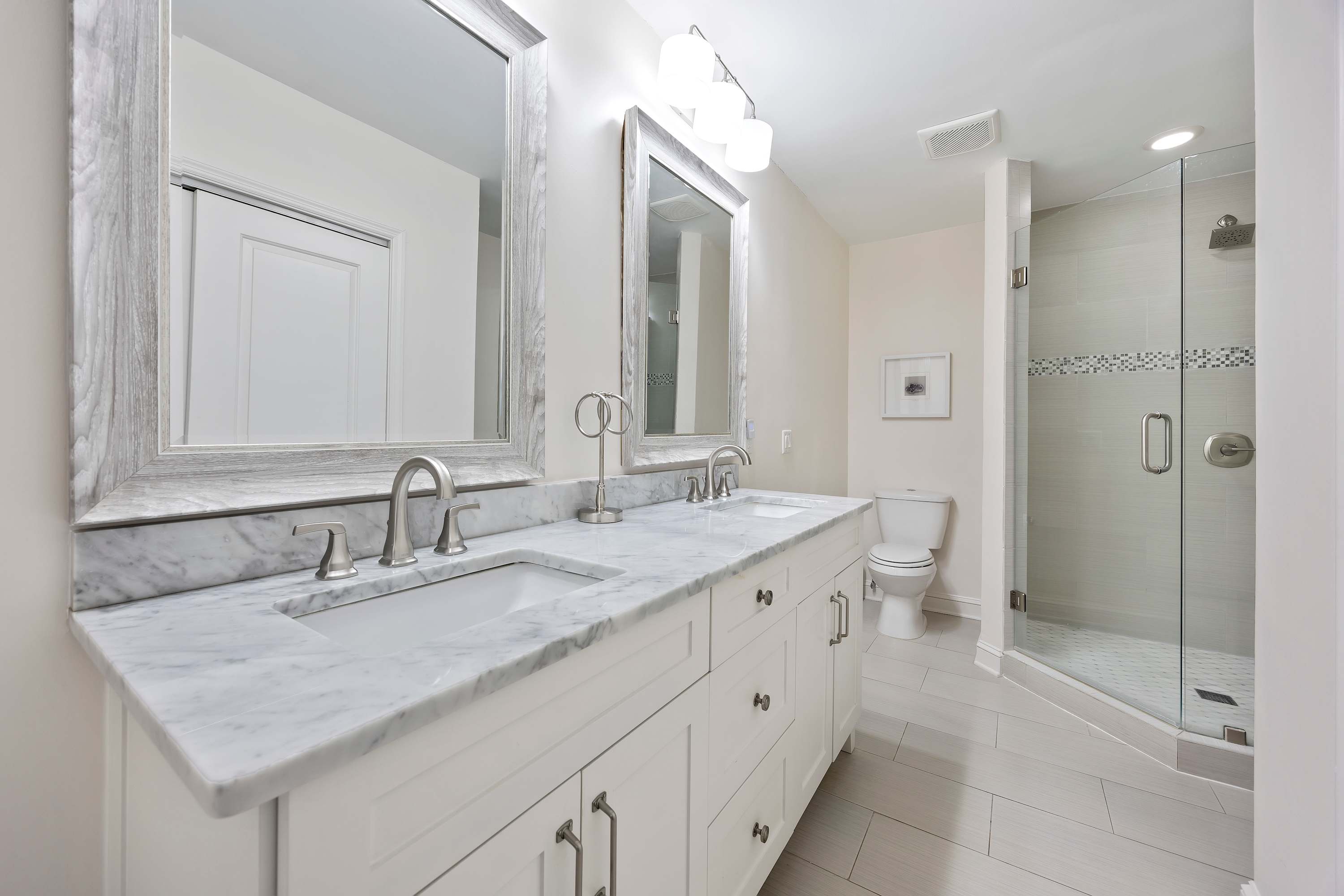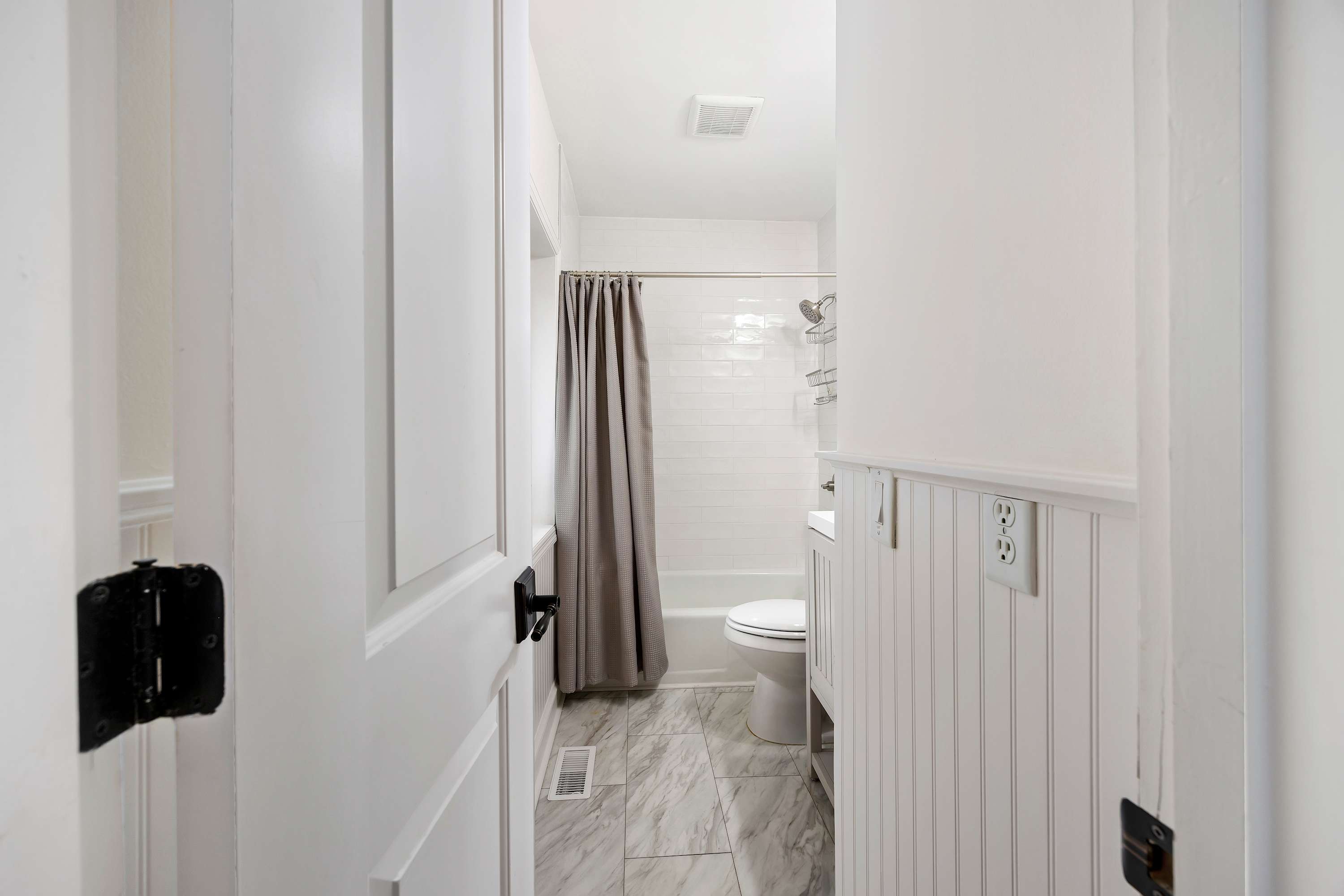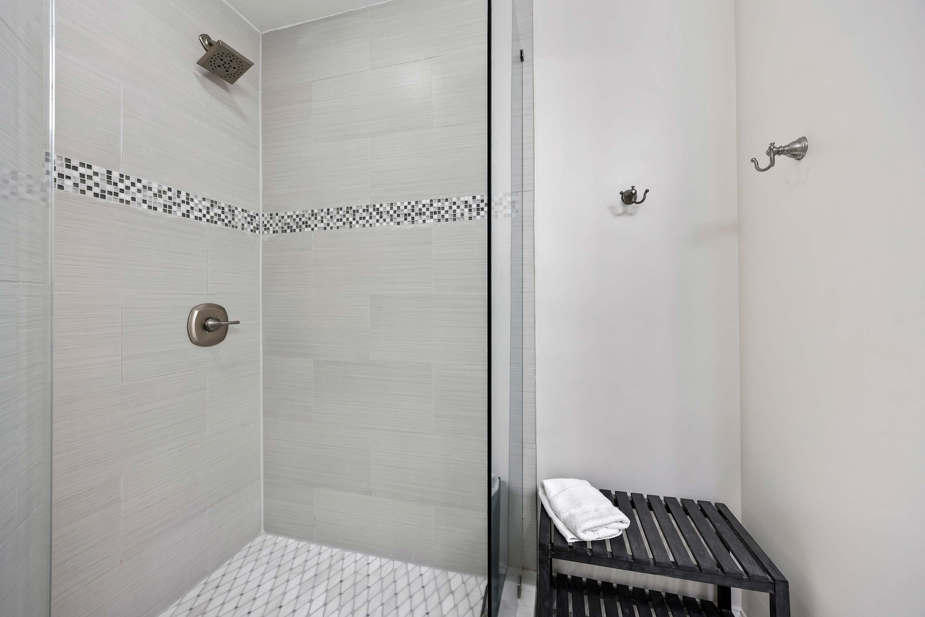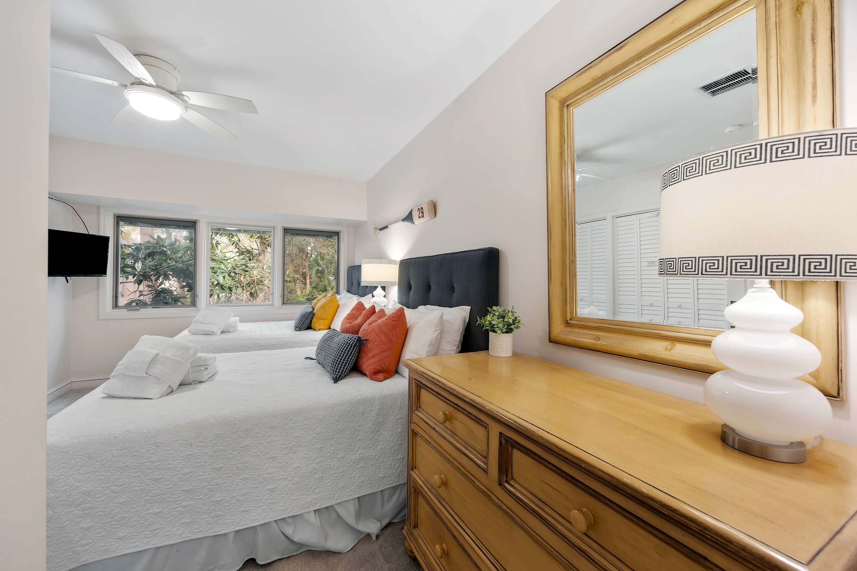 Third Bedroom: Two queen-sized beds, Smart TV, ample closet space, and ensuite bathroom with shower/tub combo.