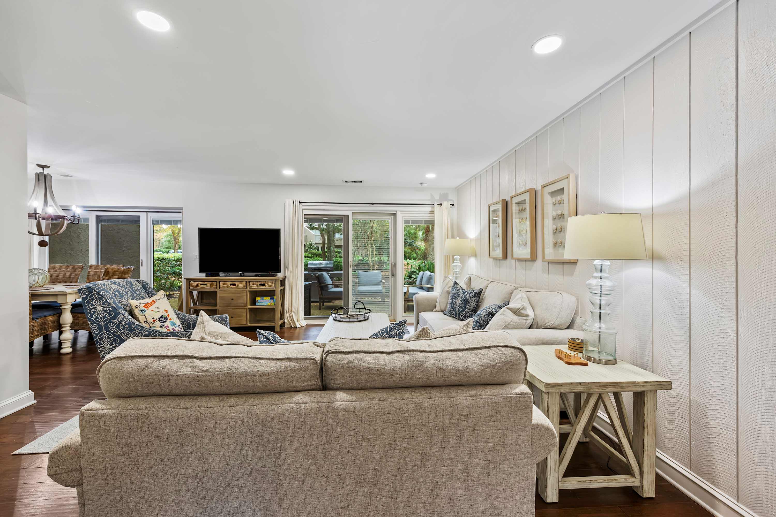 Living Area: Hardwood floors, shiplap accent walls, and sliding doors to a large patio with garden views.
