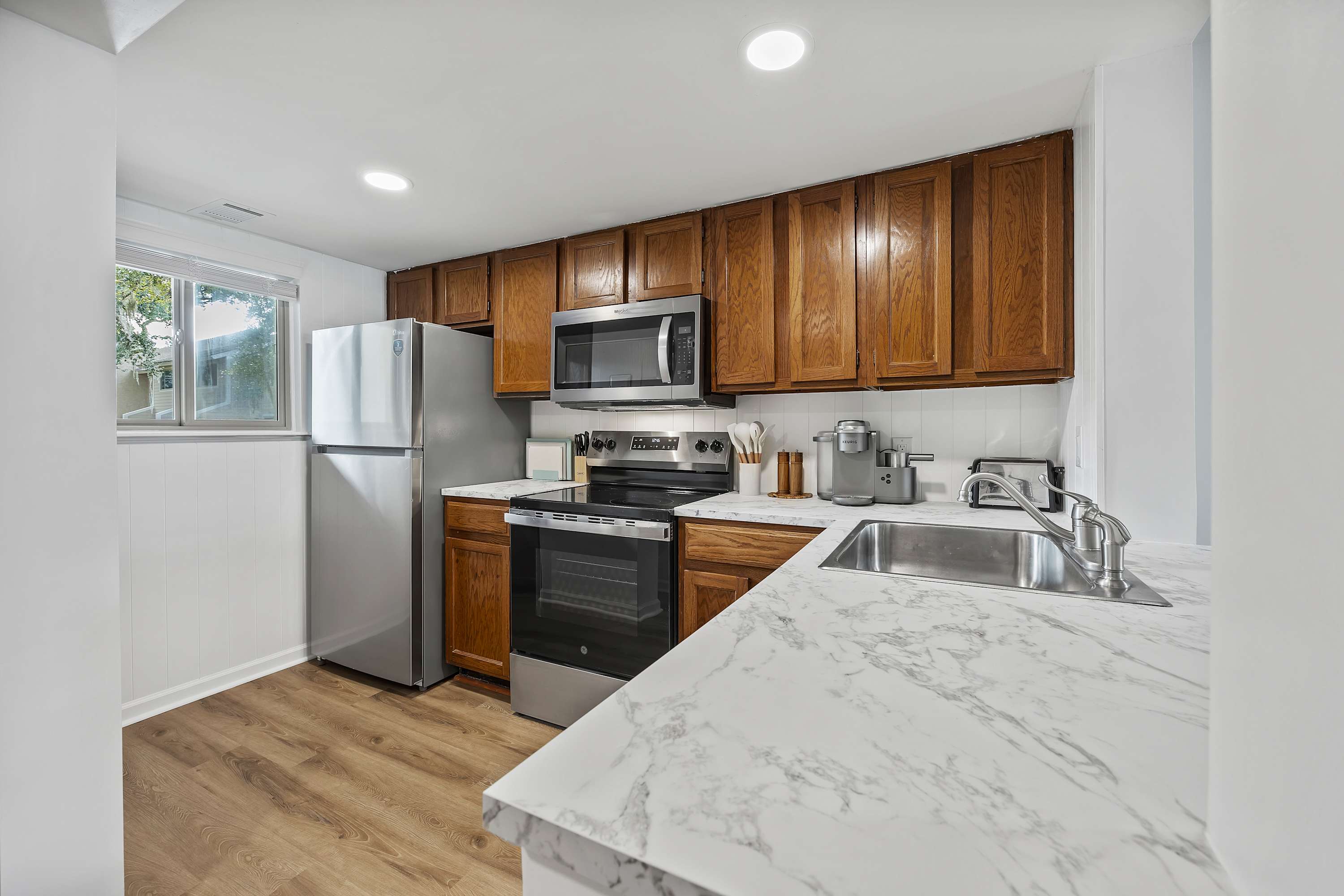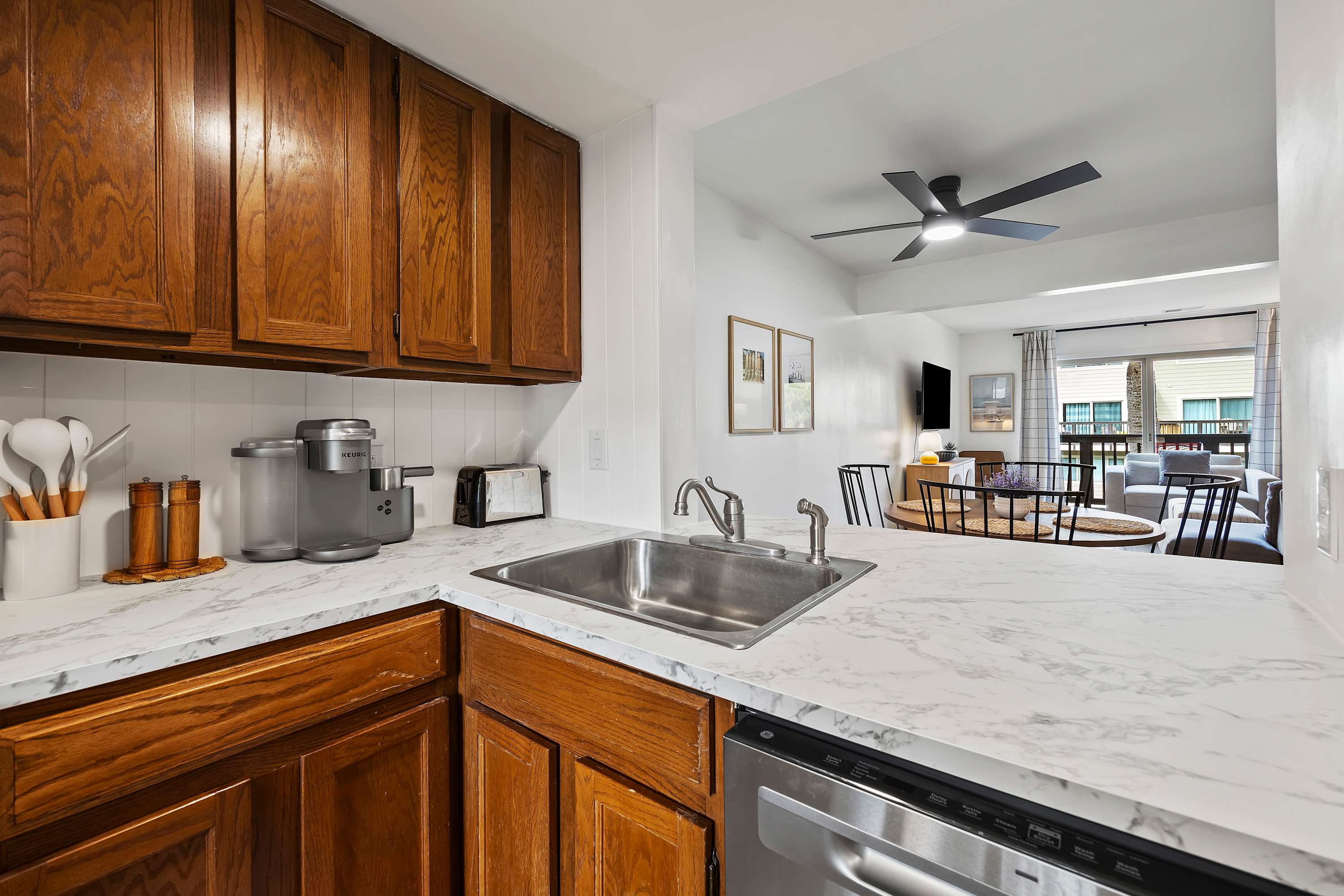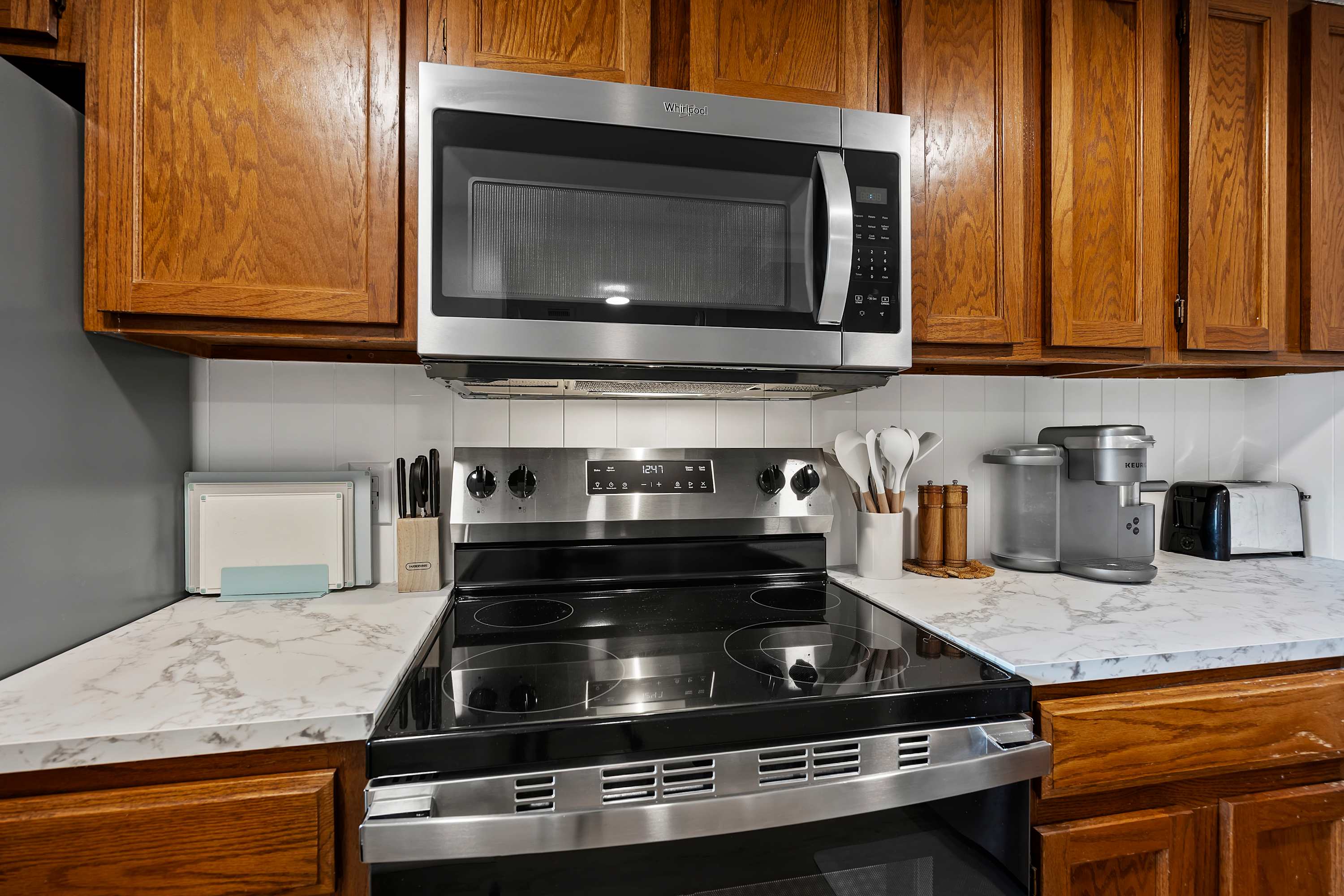 Modern Kitchen: Updated with new appliances. Fully stocked with cookware, dishware, a full pantry, and counter-height seating for casual dining or conversation.