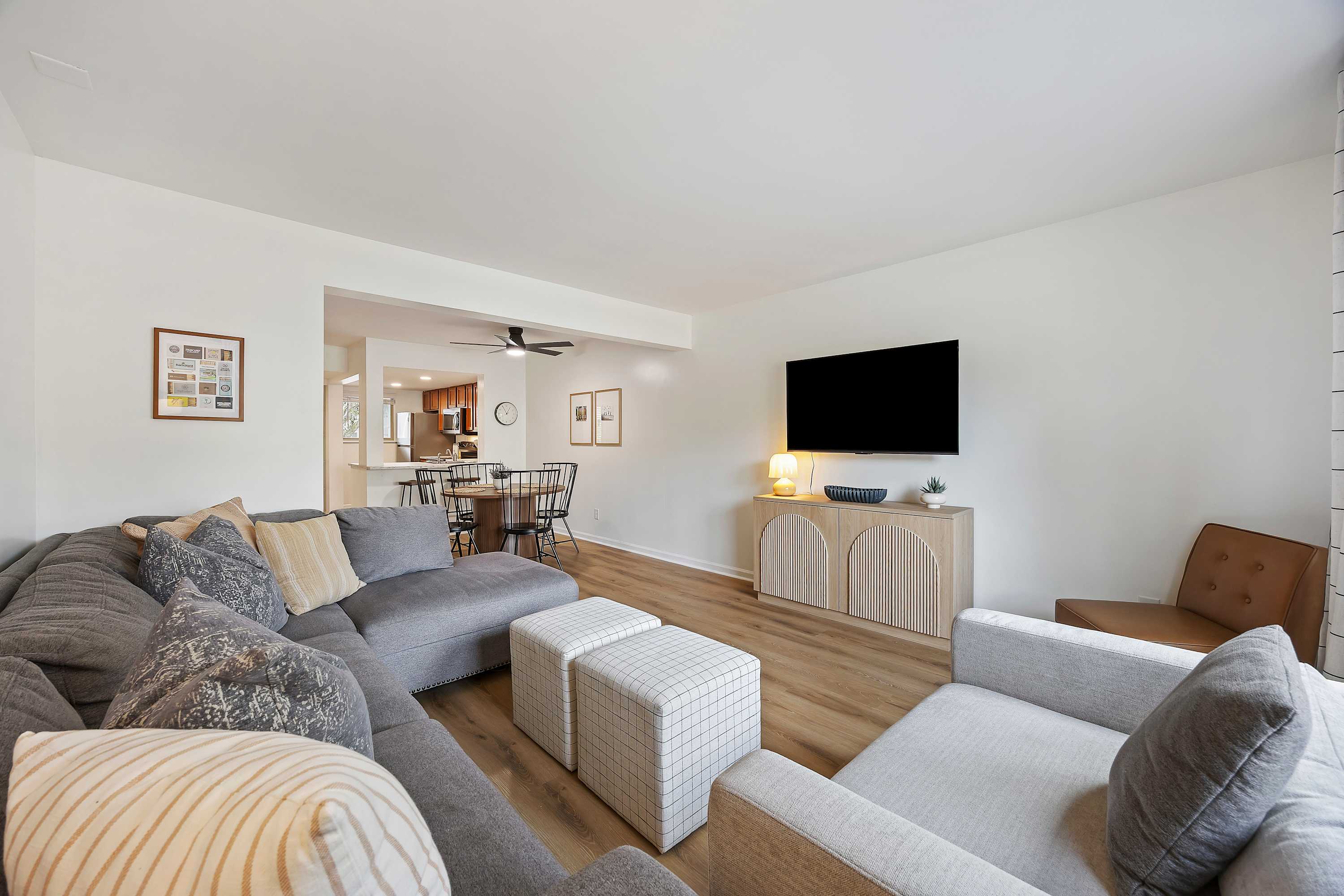 Cozy Living Room: Relax on a chaise sofa or oversized love seat that is a twin sofa sleeper. Enjoy entertainment on the Smart TV with cable and app streaming.