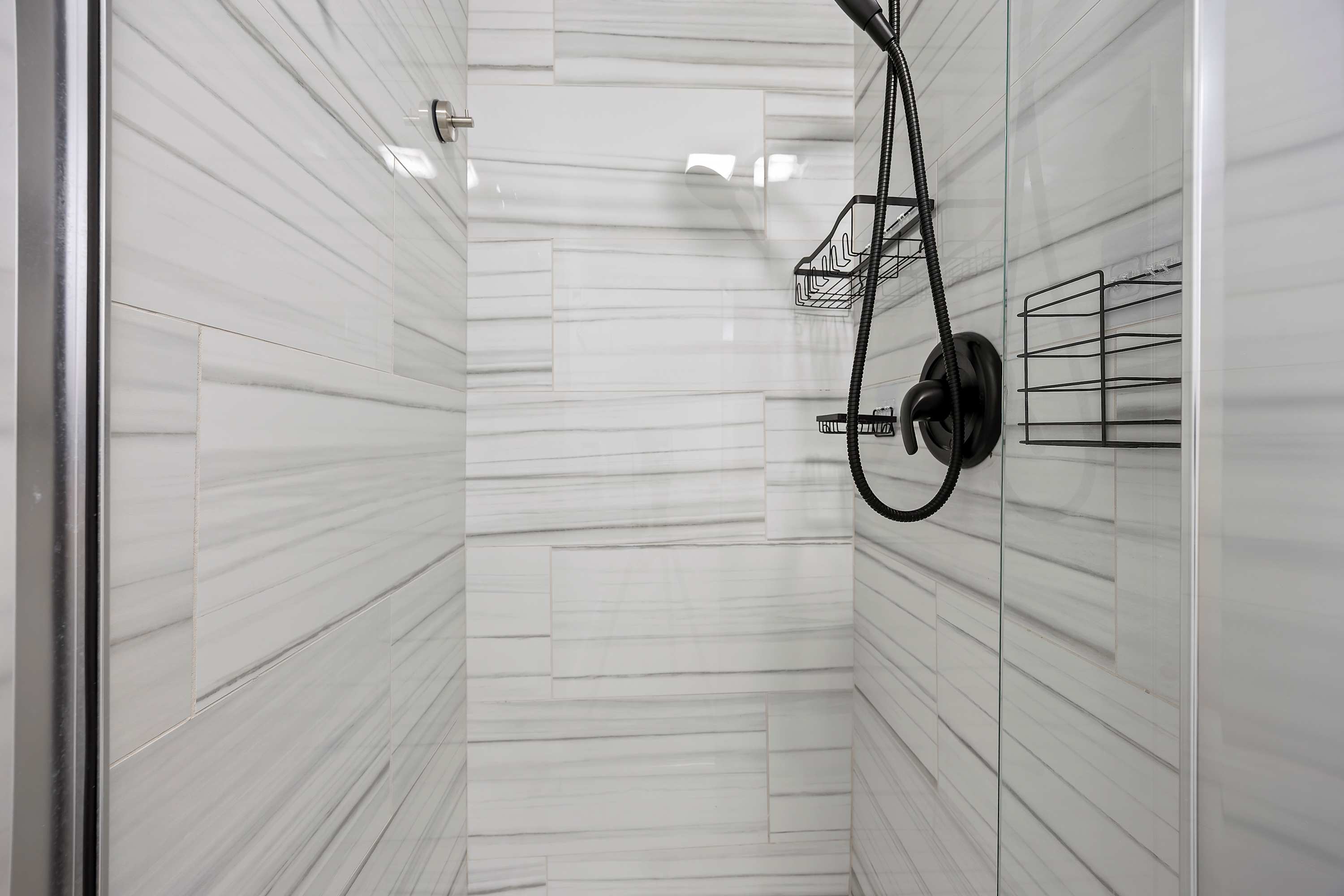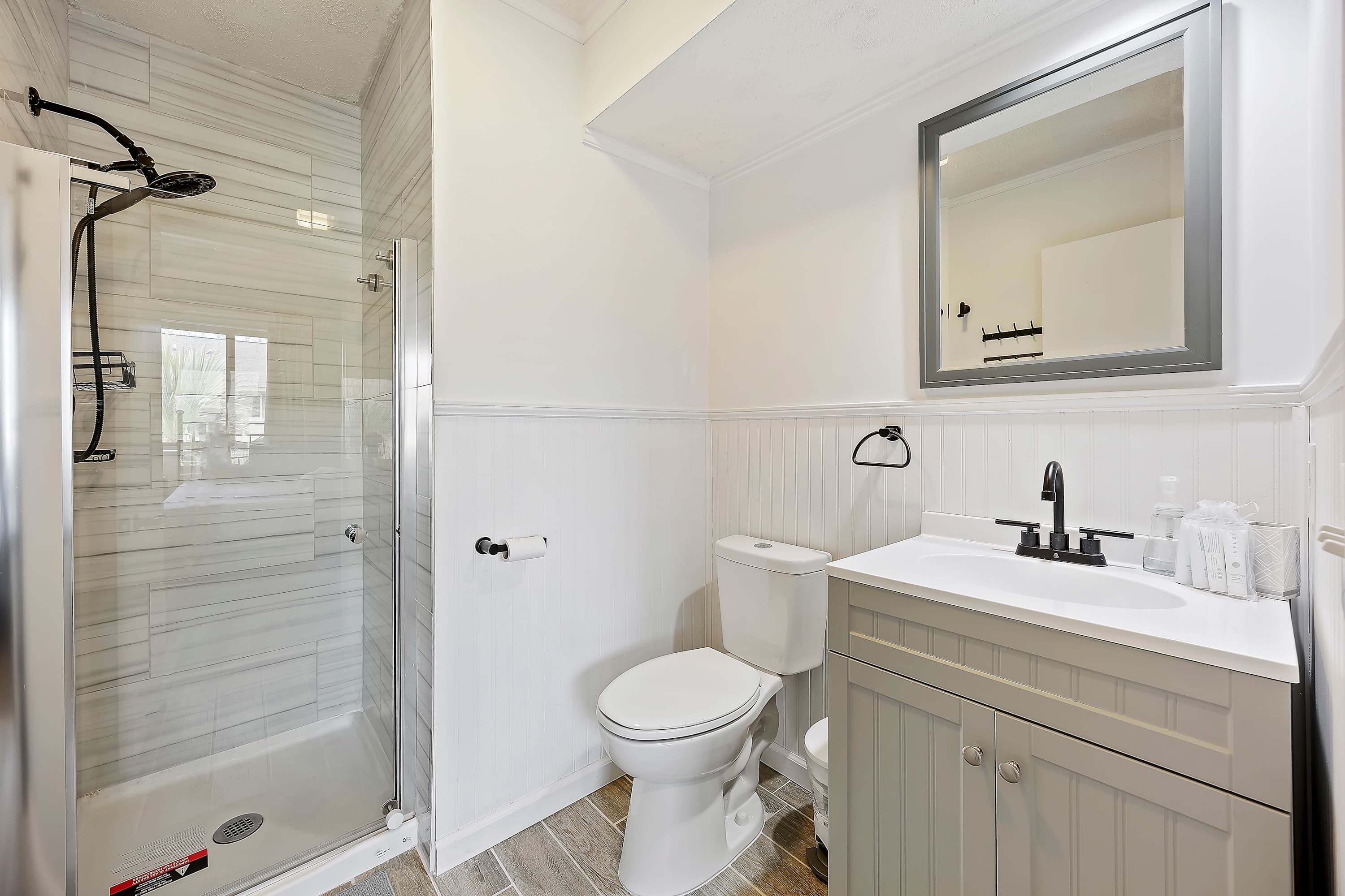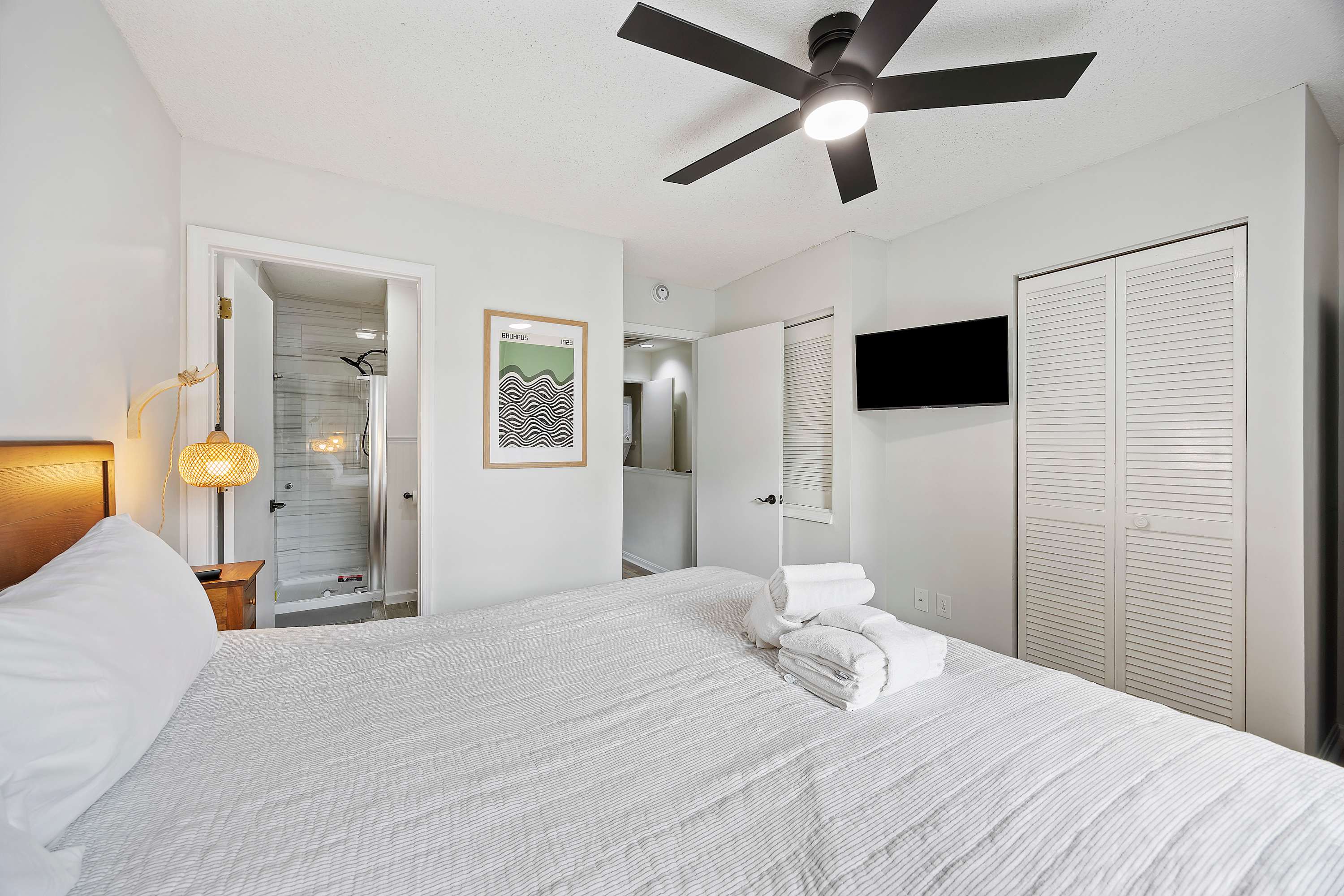 Primary Bedroom: King-sized bed, ensuite bath with walk-in shower, and ample storage with dresser.