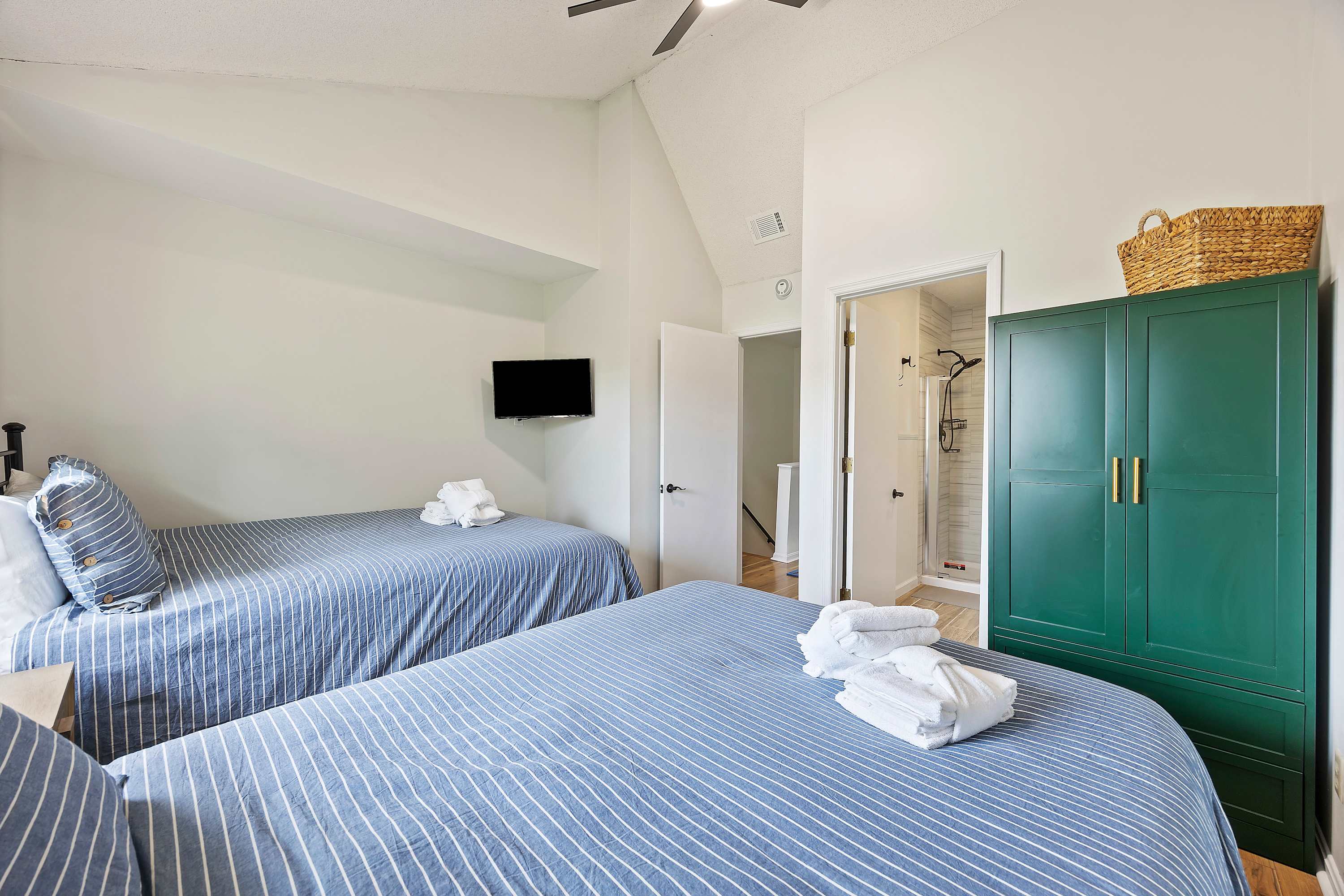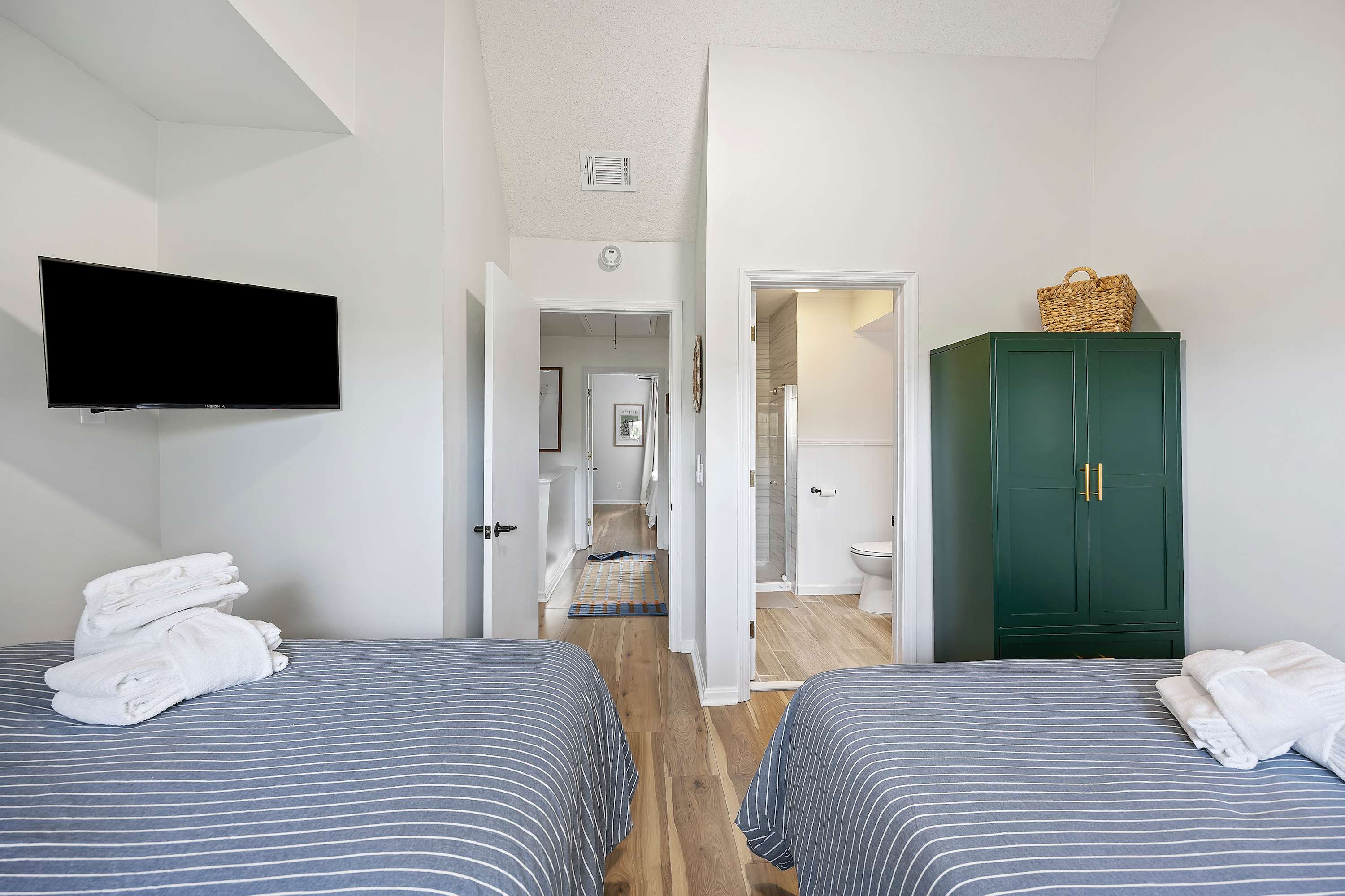 Guest Bedroom: Two queen-size beds, a wardrobe closet, and ensuite bathroom with walk-in shower.