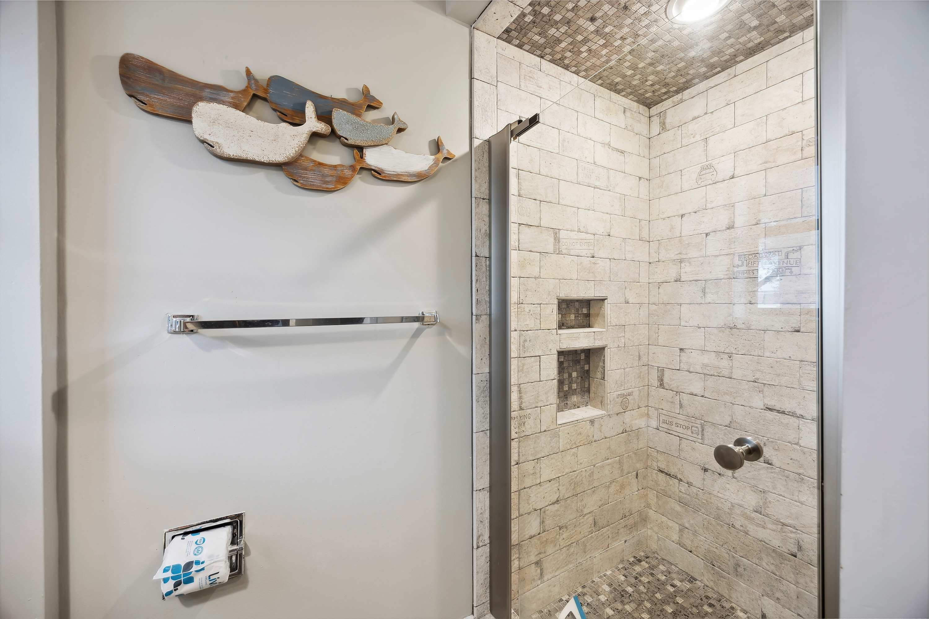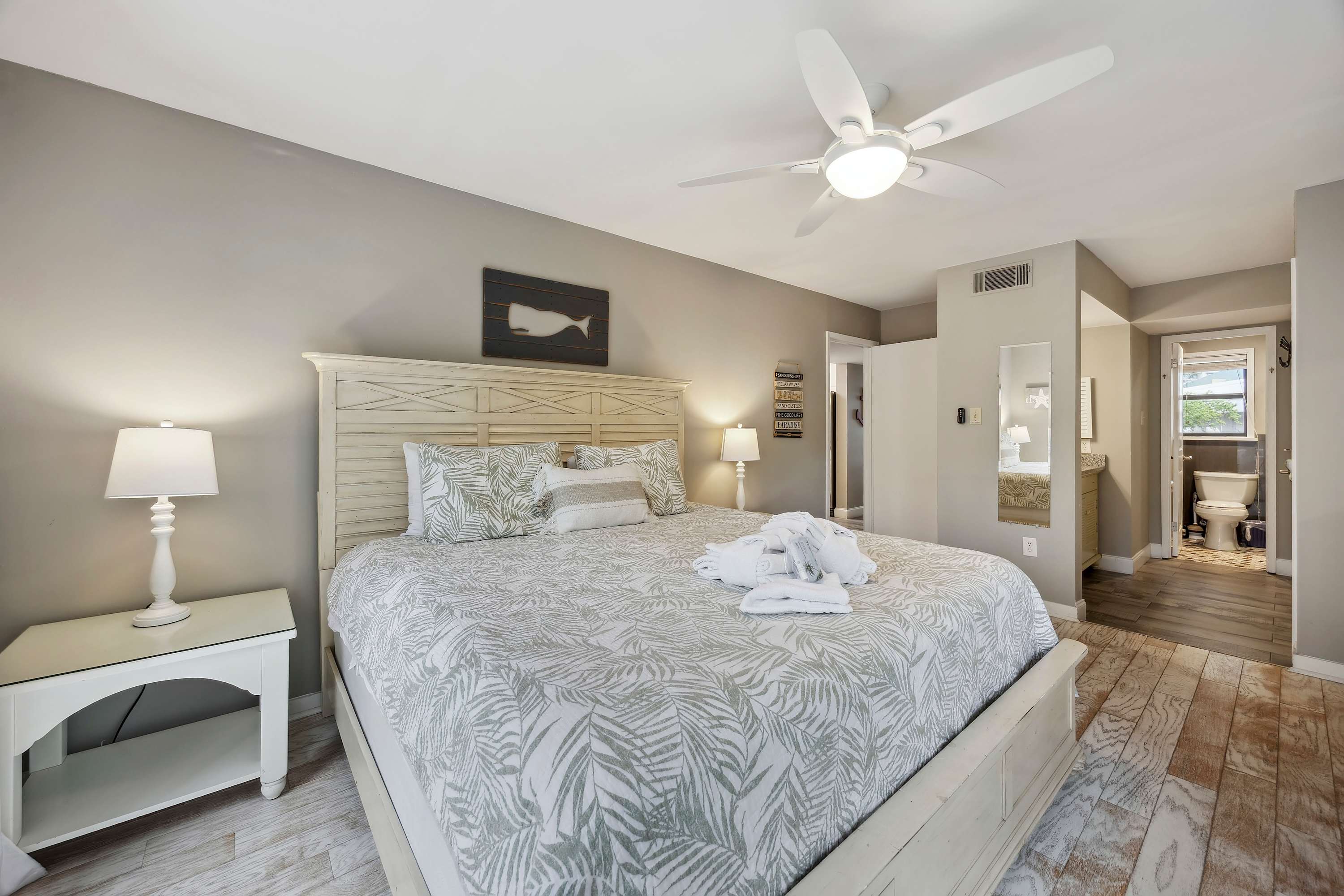 Primary Bedroom: King-sized bed, ensuite bath with walk-in shower, Smart TV, and ample closet space.